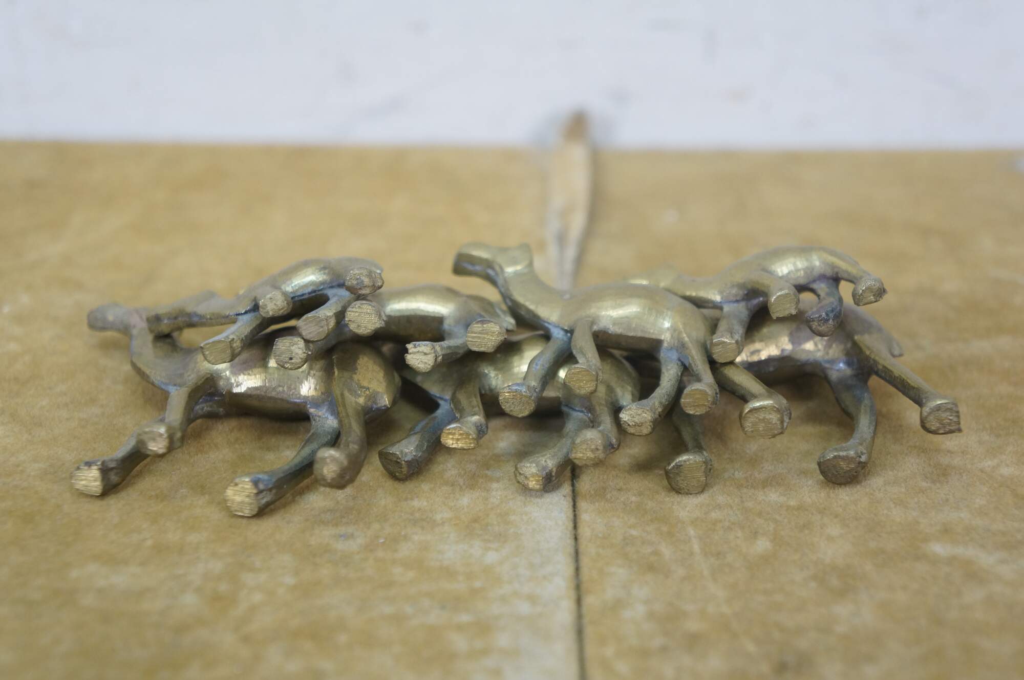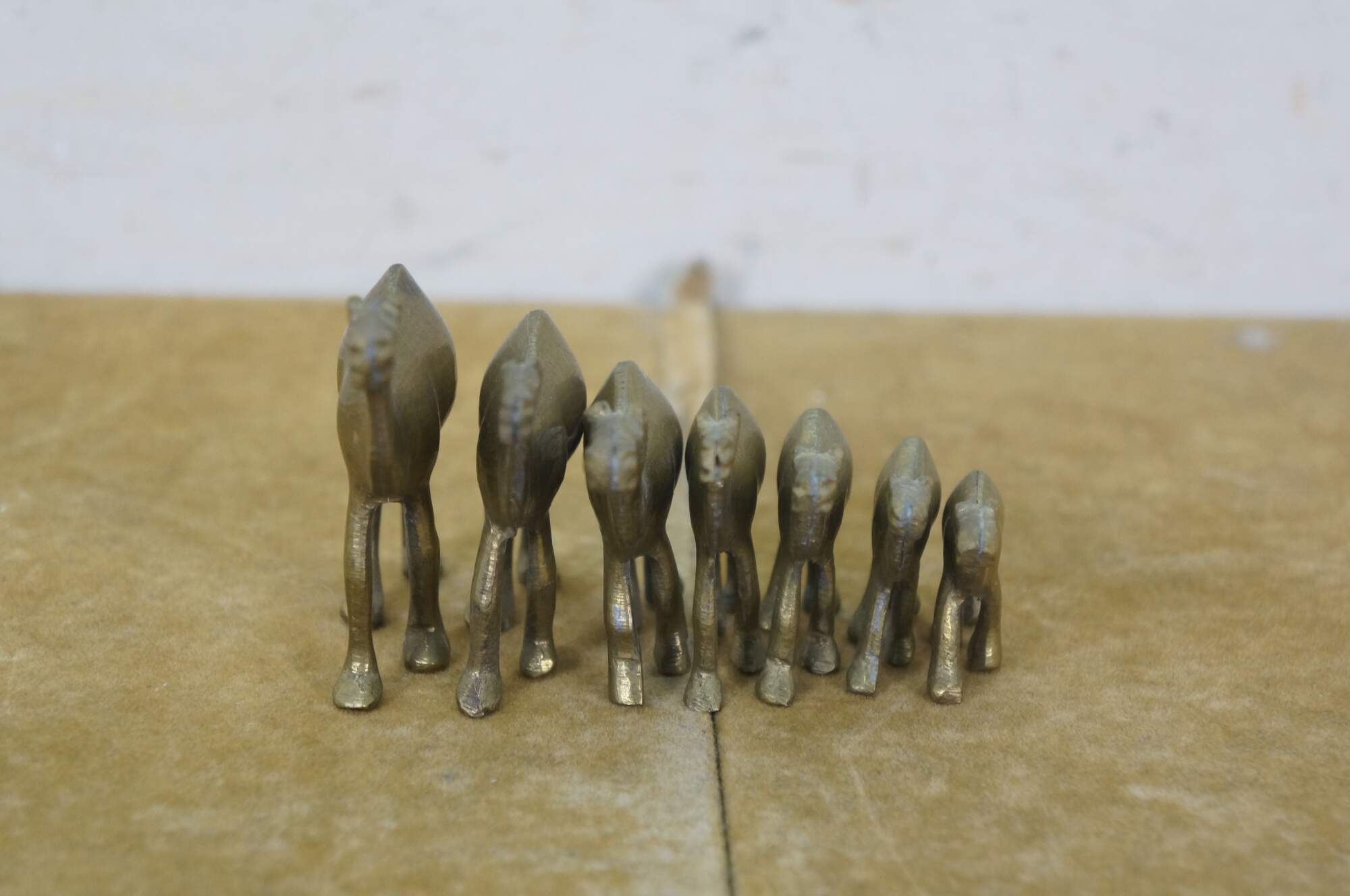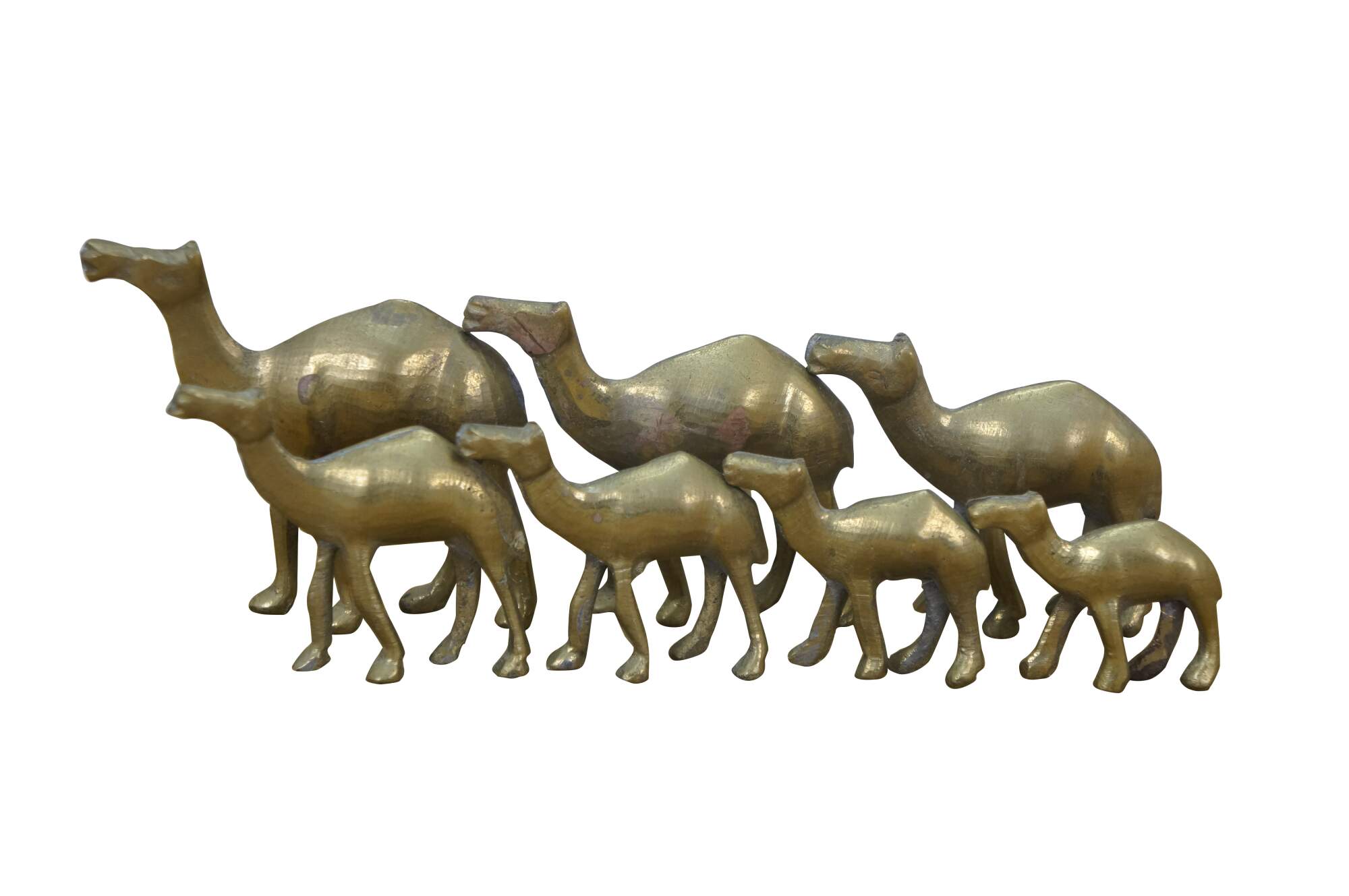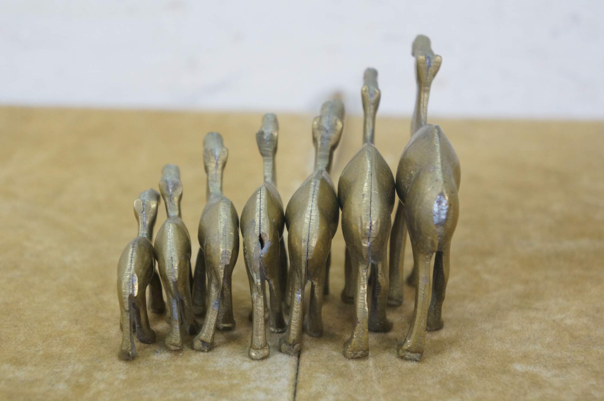 Set of seven vintage 20th century brass miniature camel figurines of slowly decreasing size.