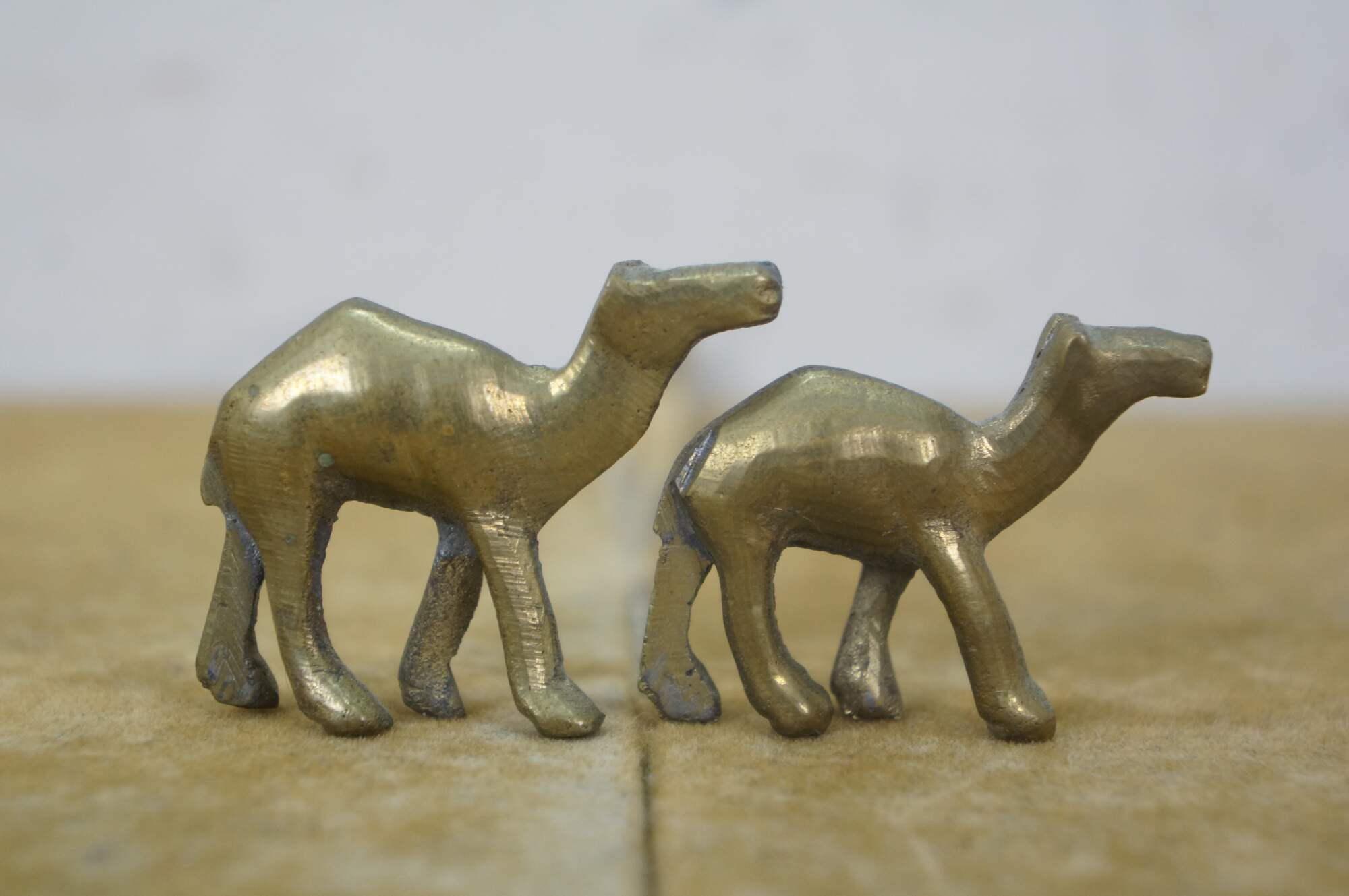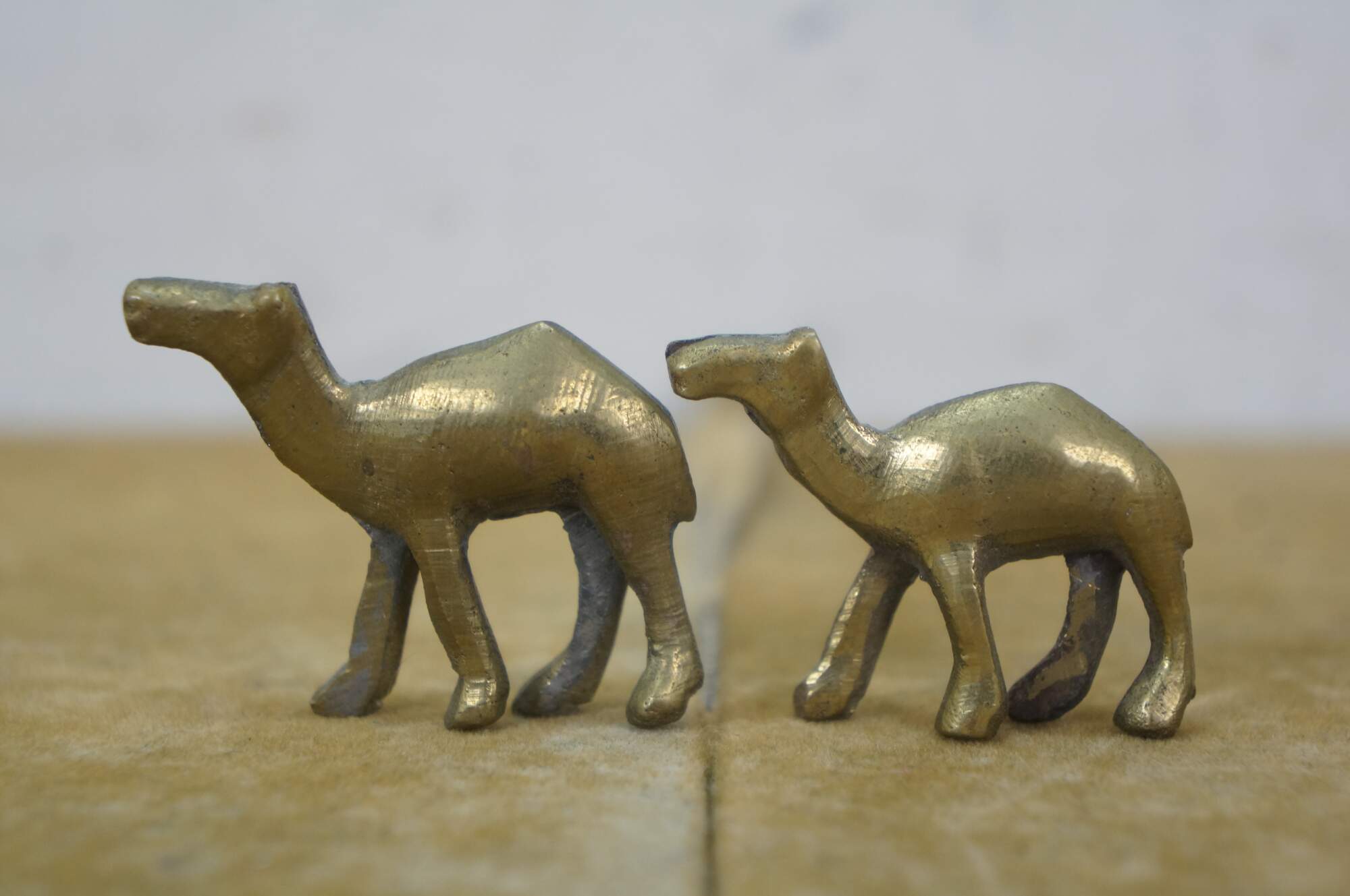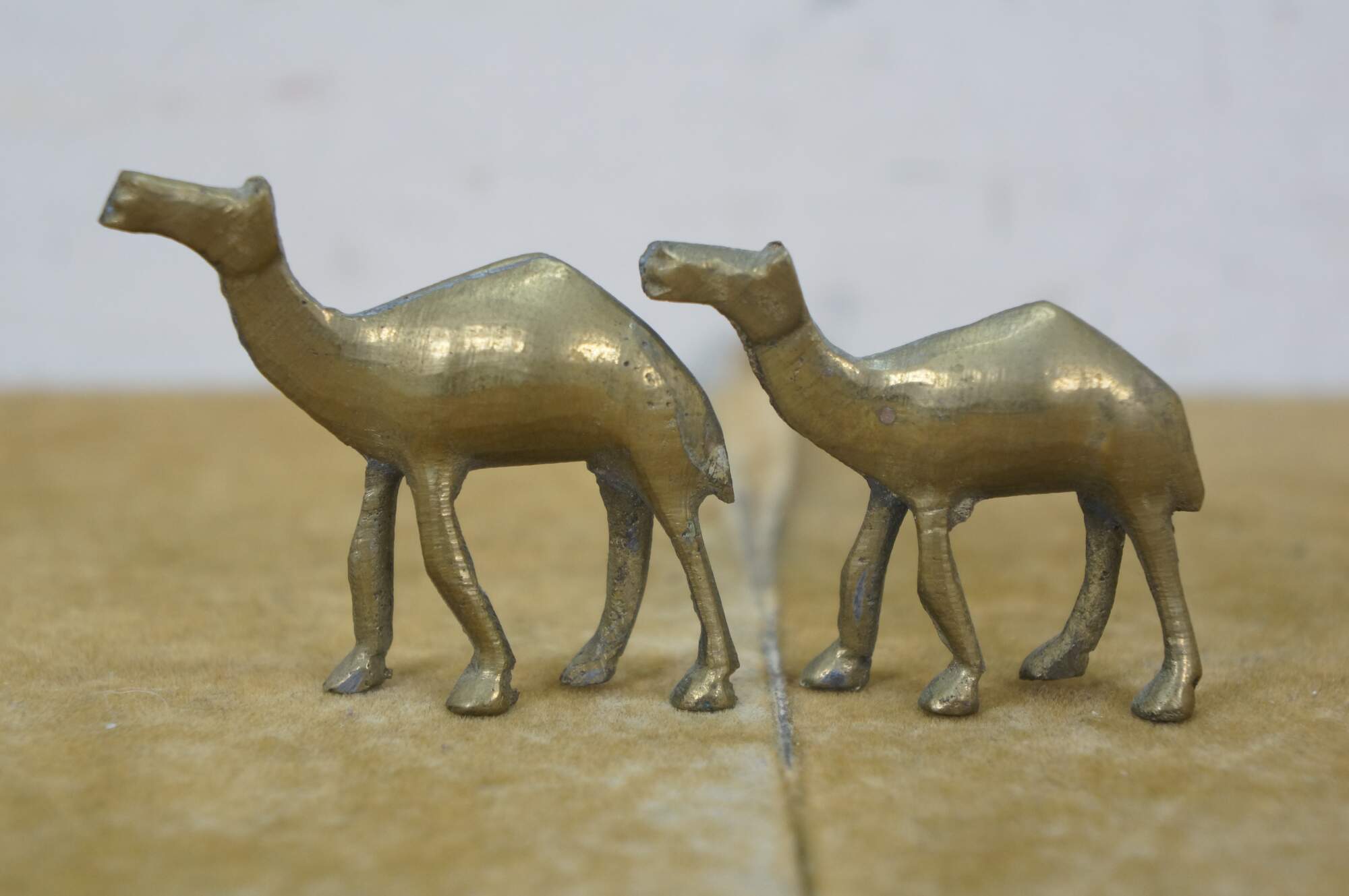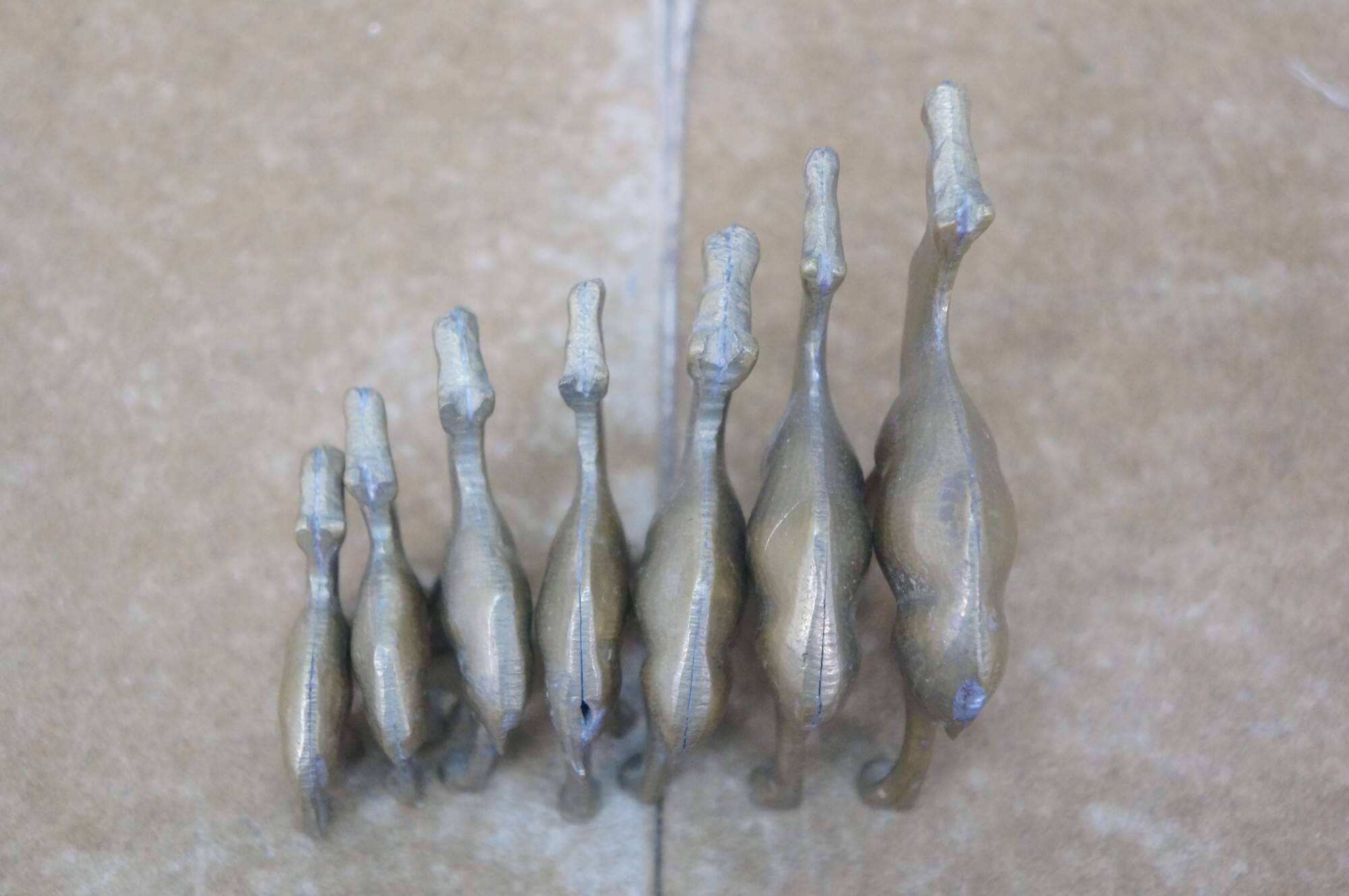 Set of seven vintage 20th century brass miniature camel figurines of slowly decreasing size.