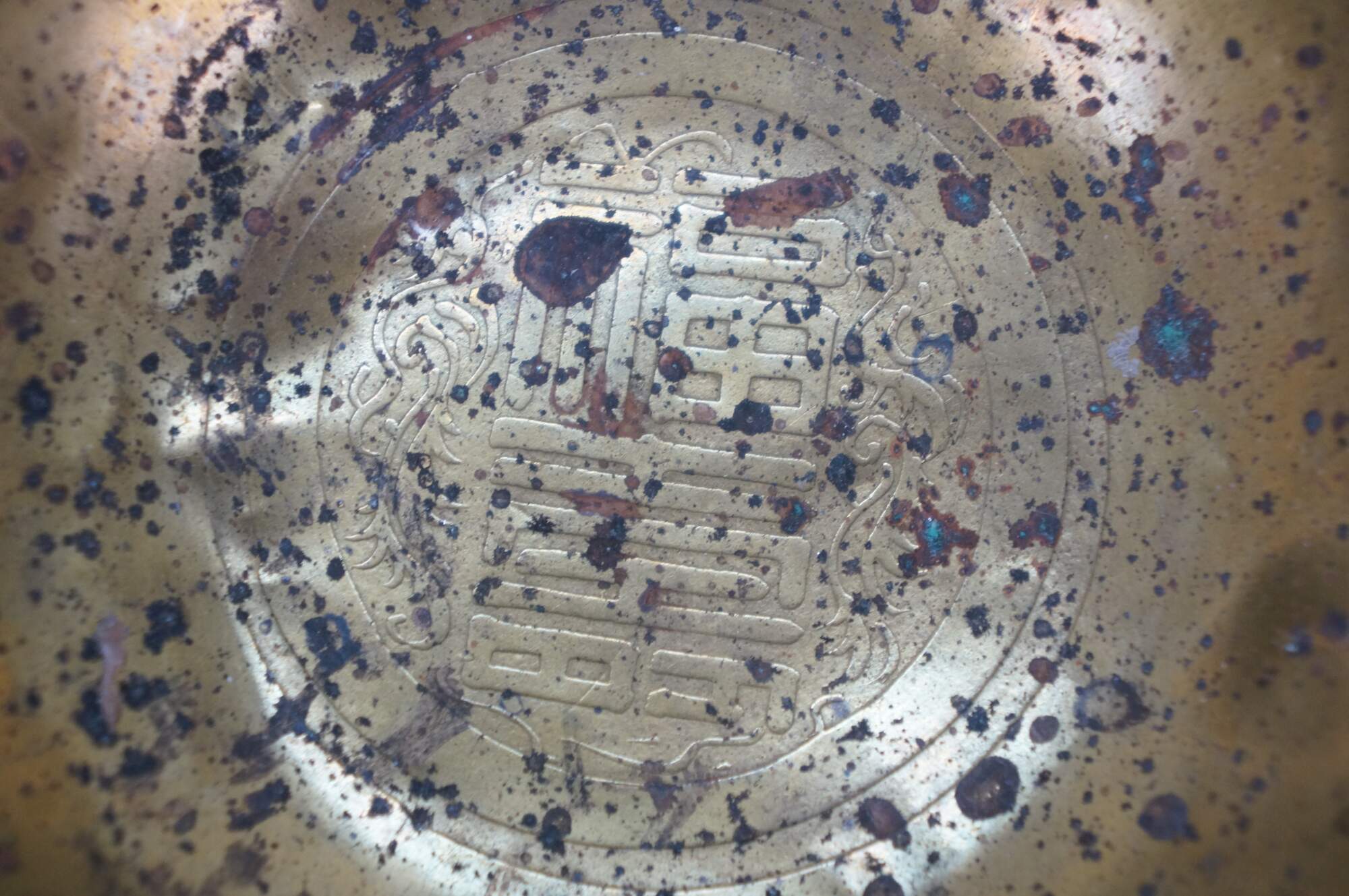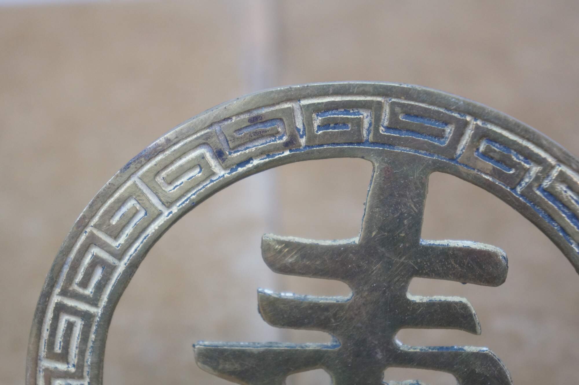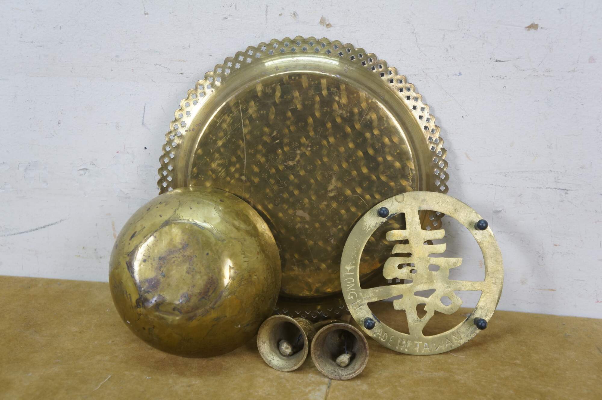Set of 4 assorted vintage brass pieces of tableware. Includes: Floral etched plate with pierced and scalloped edge. Pot rest / trivet featuring the Chinese character shou representing Long Life - Made in Taiwan. Small bowl etched with a dragon on the outside and embossed with a chinese character on the interior. And a pair of joined floral etched bells.