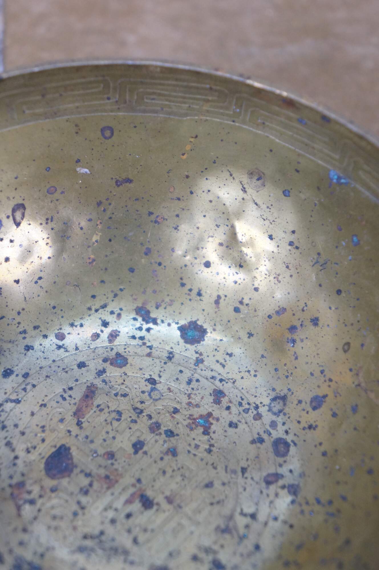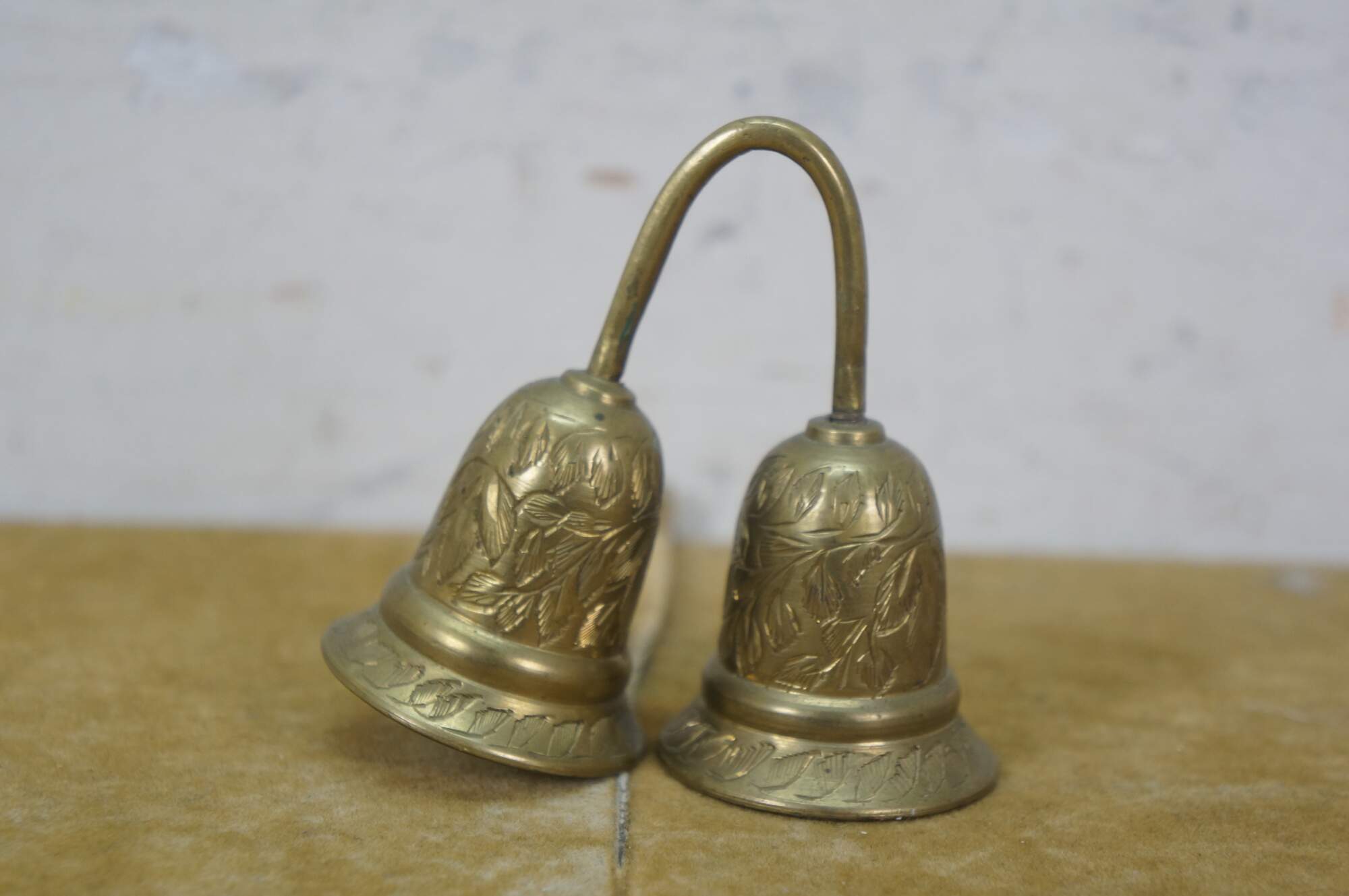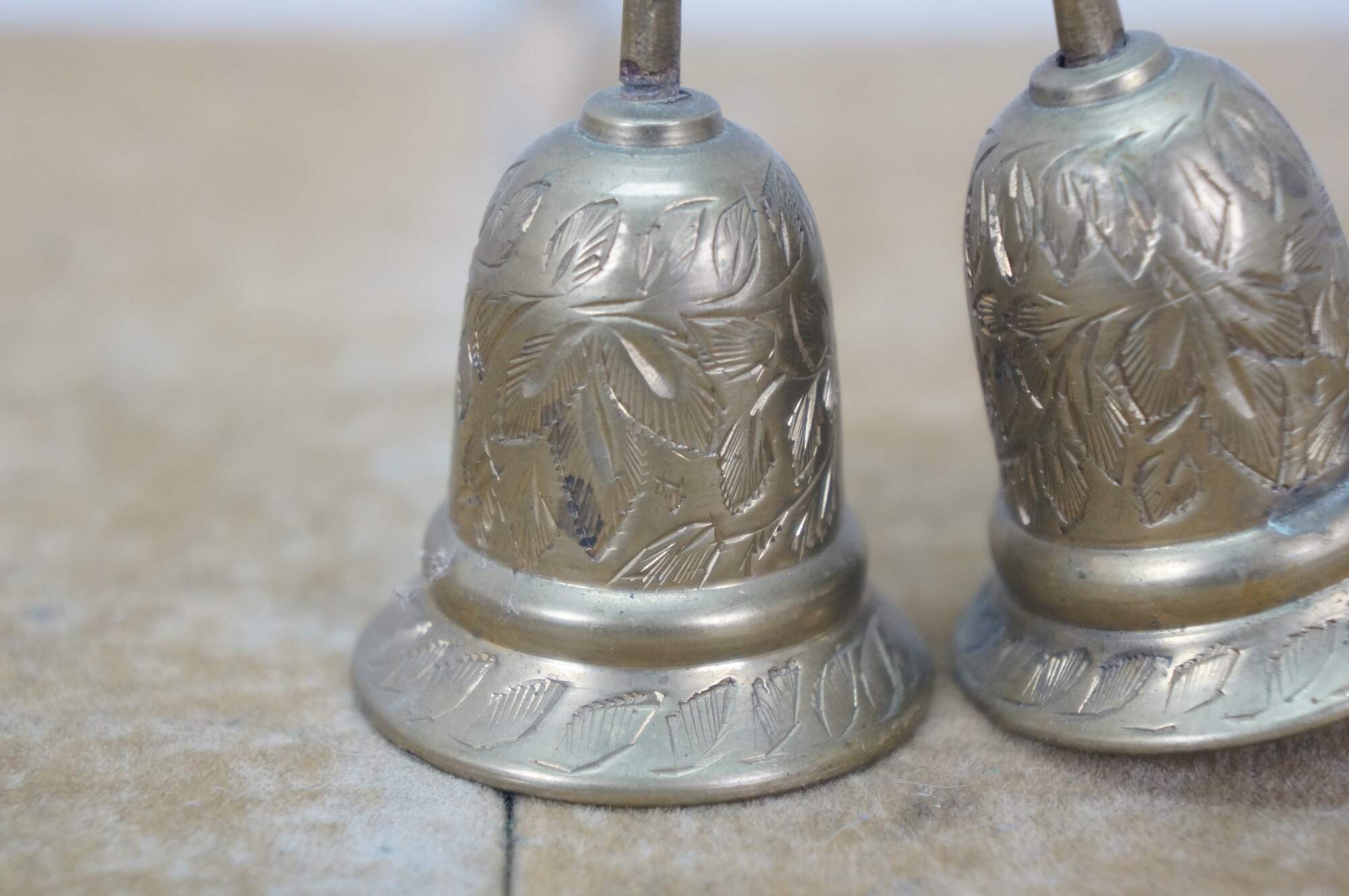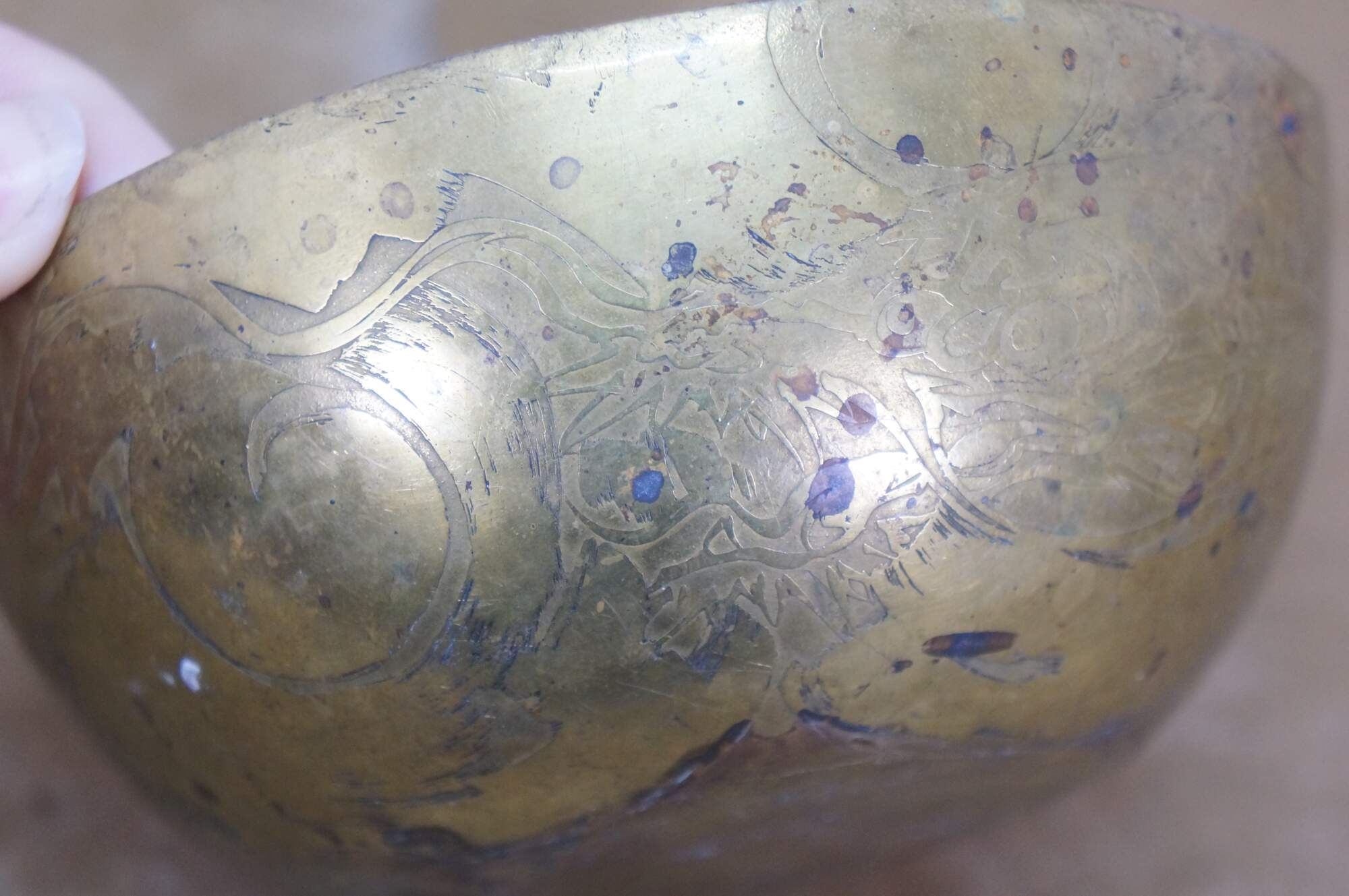 Set of 4 assorted vintage brass pieces of tableware. Includes: Floral etched plate with pierced and scalloped edge. Pot rest / trivet featuring the Chinese character shou representing Long Life - Made in Taiwan. Small bowl etched with a dragon on the outside and embossed with a chinese character on the interior. And a pair of joined floral etched bells.