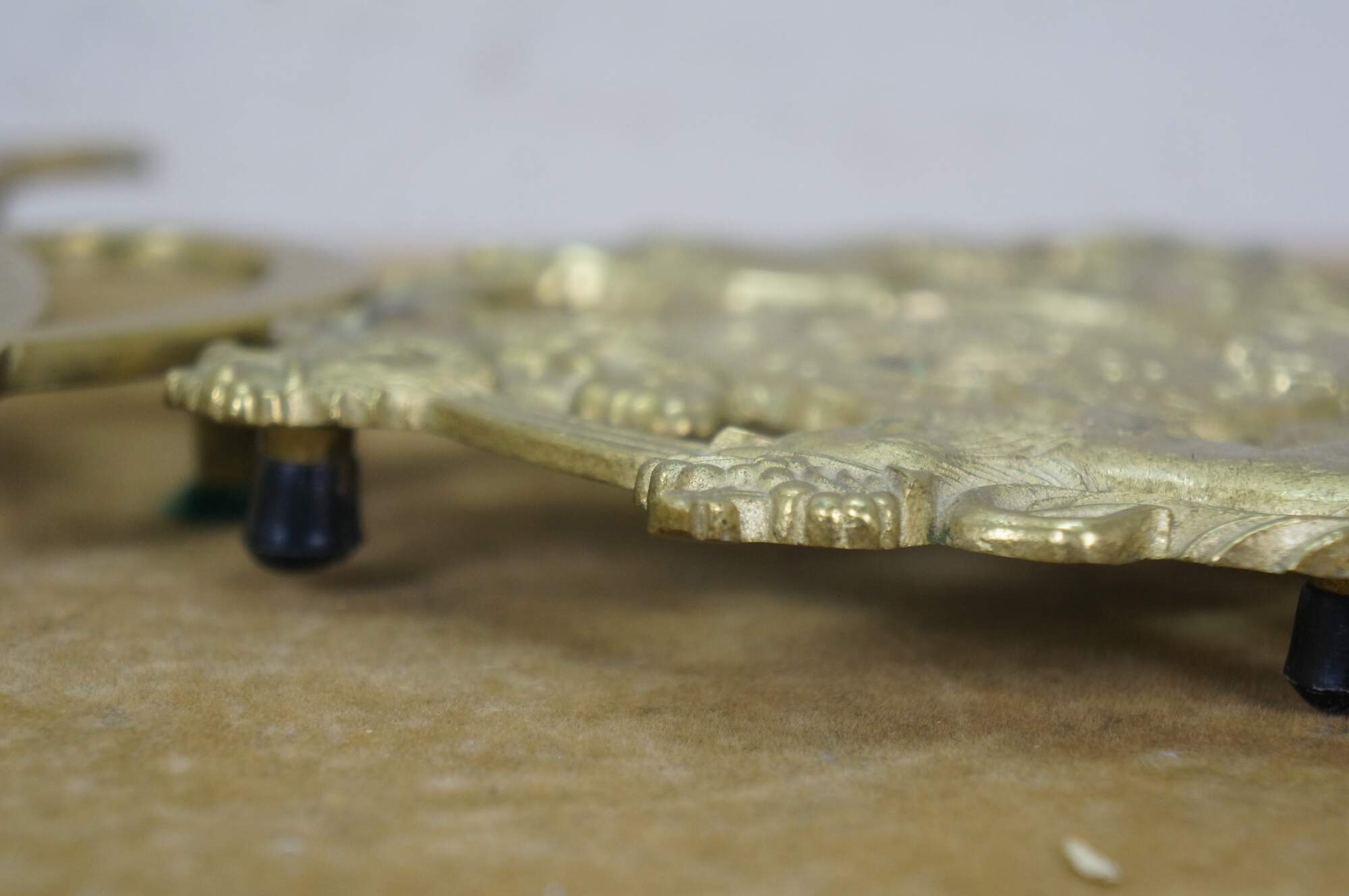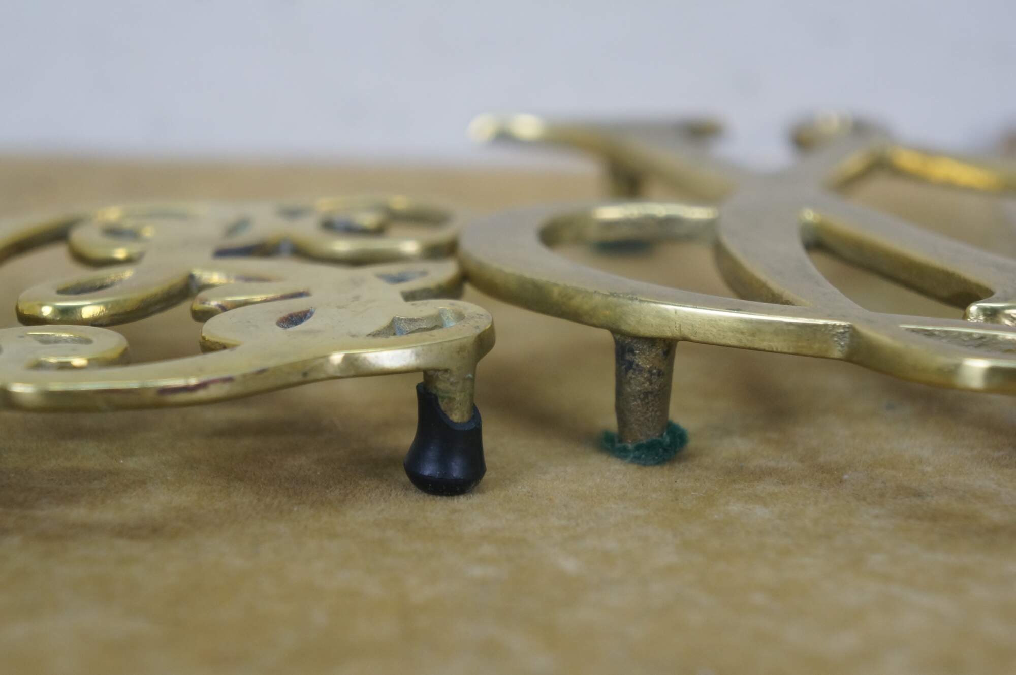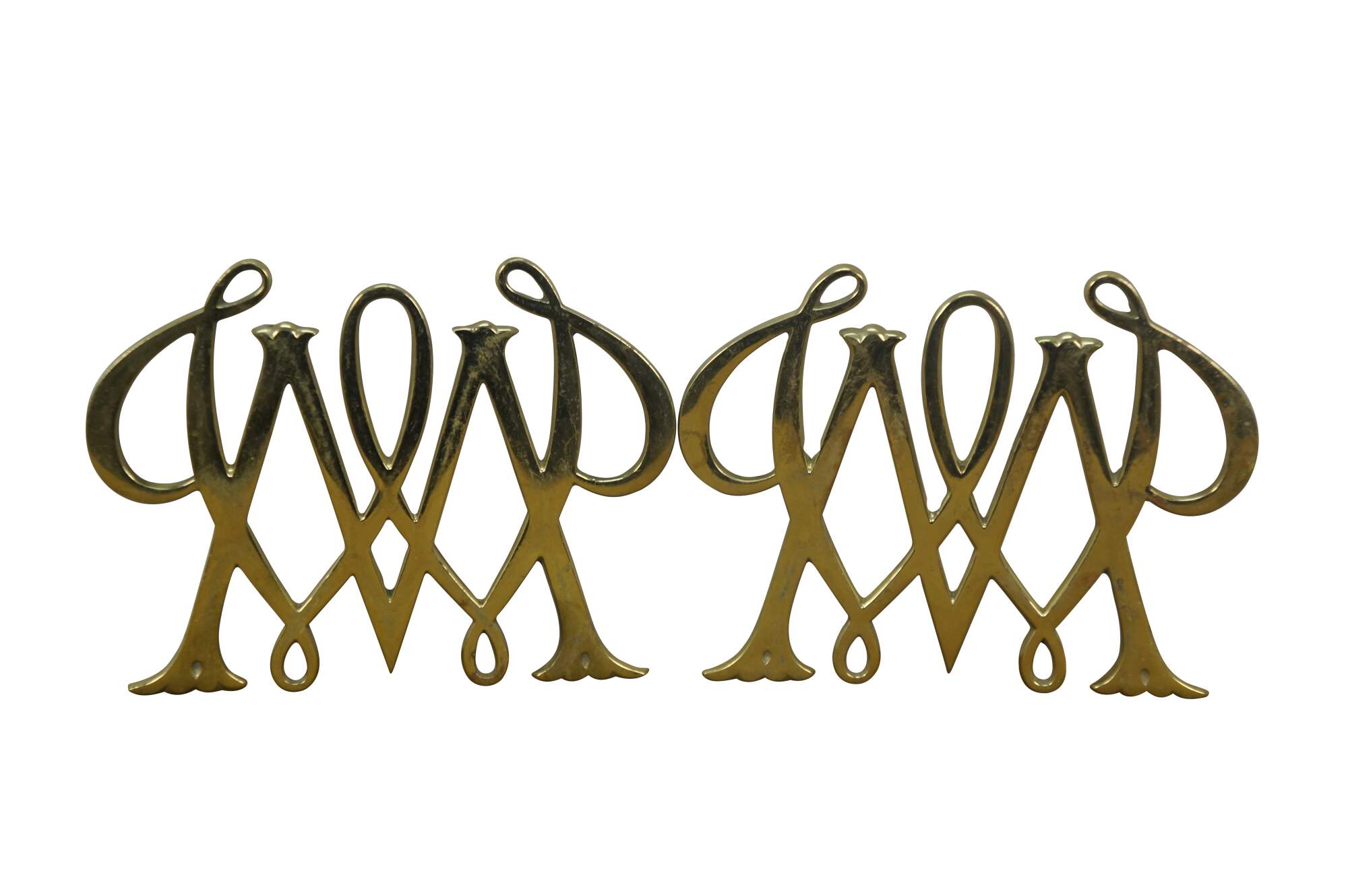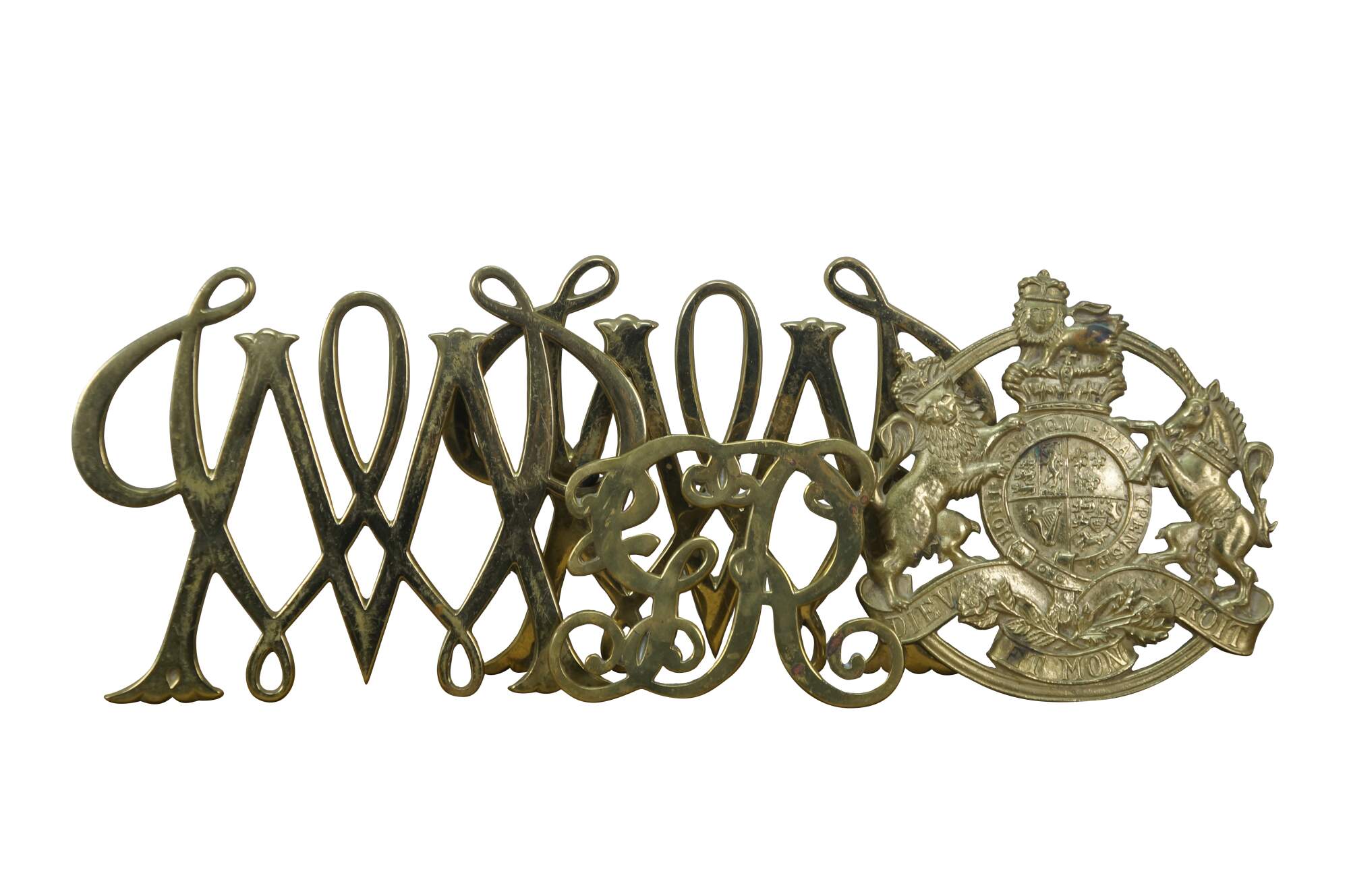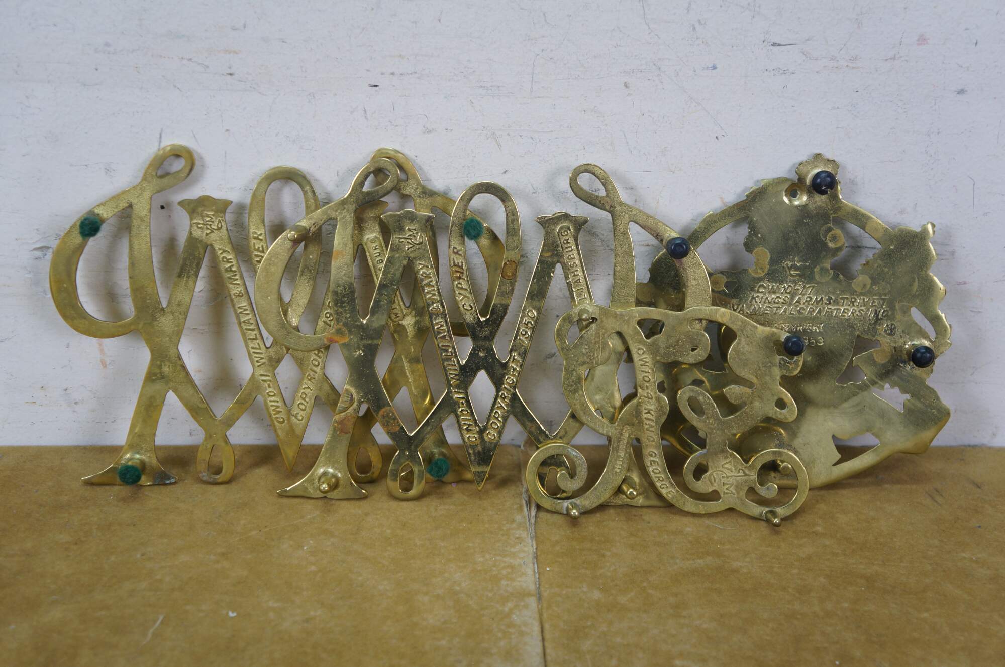 Set of four mid 20th century brass trivets / pot rests by Virginia Metalcrafters. Two William & Mary cyphers, King George monogram, and the British royal coat of arms.