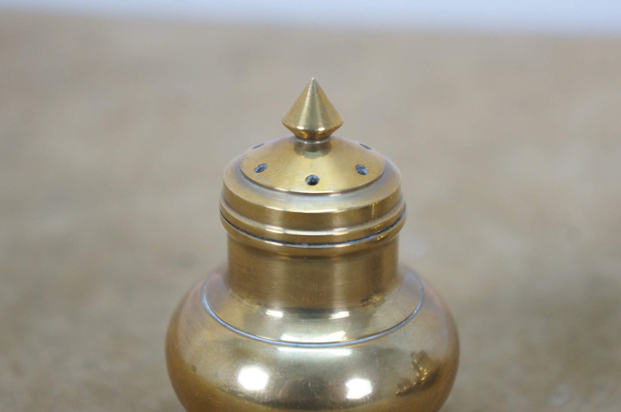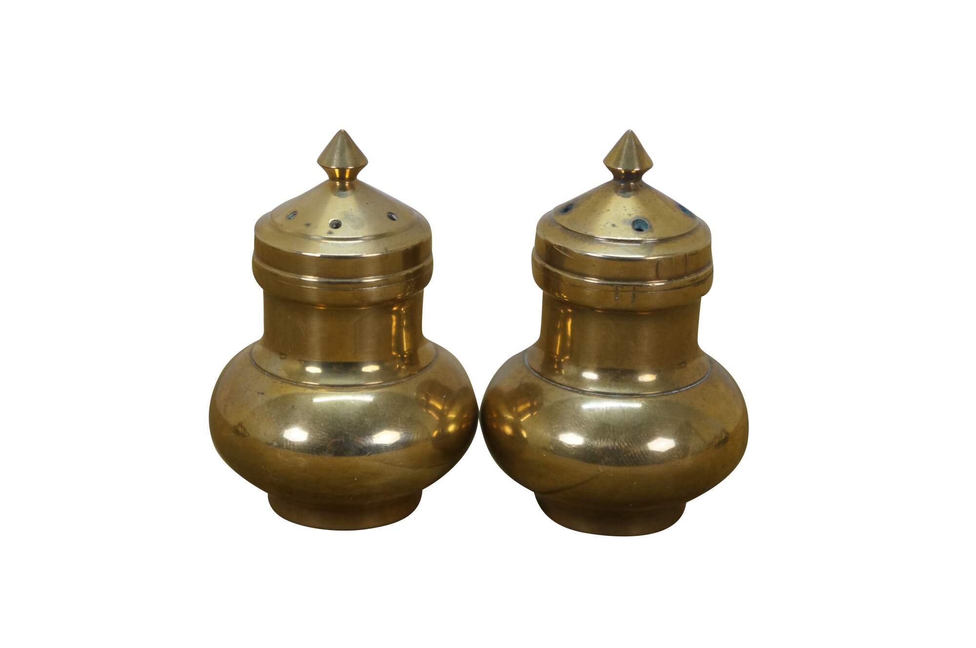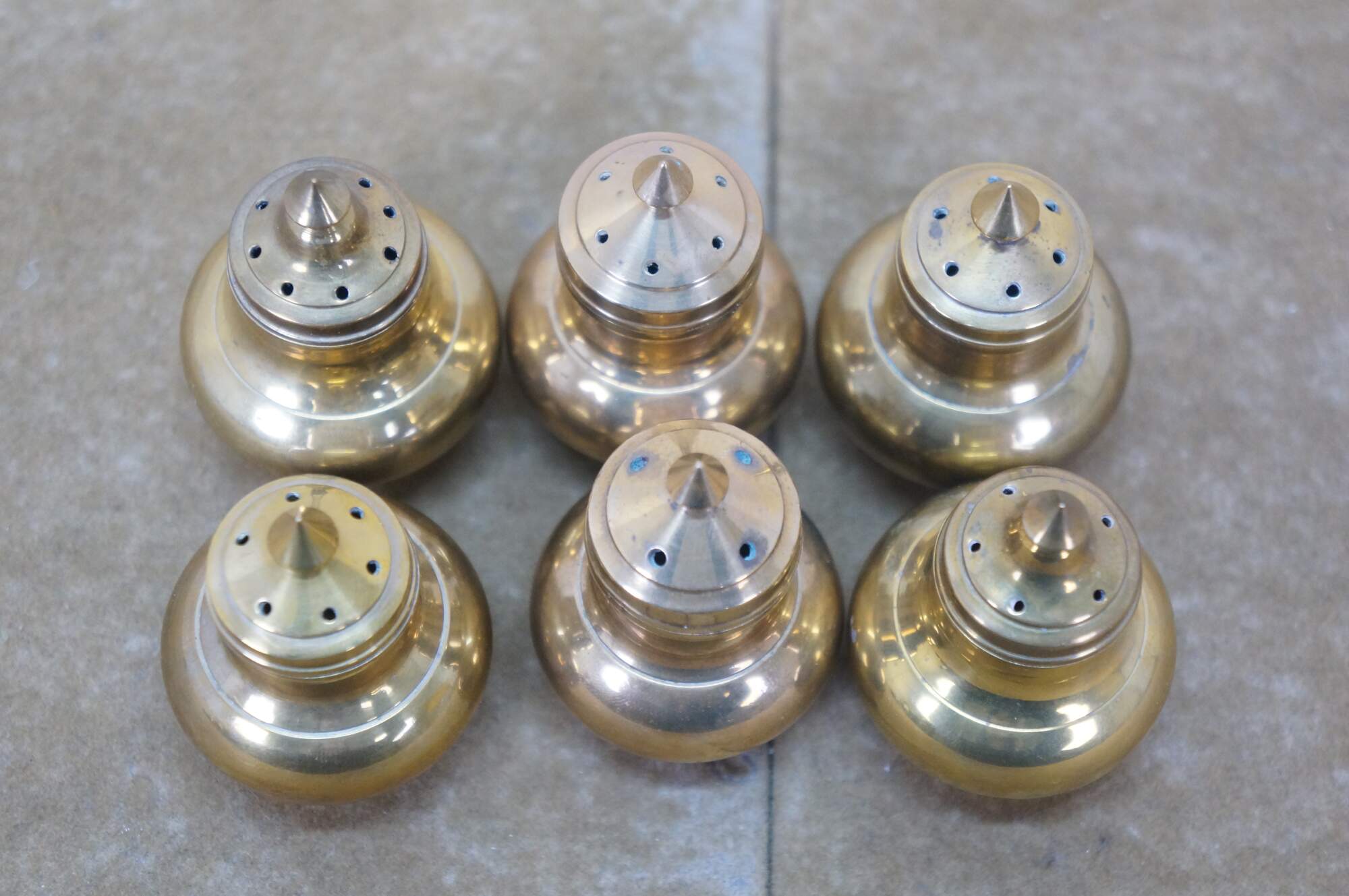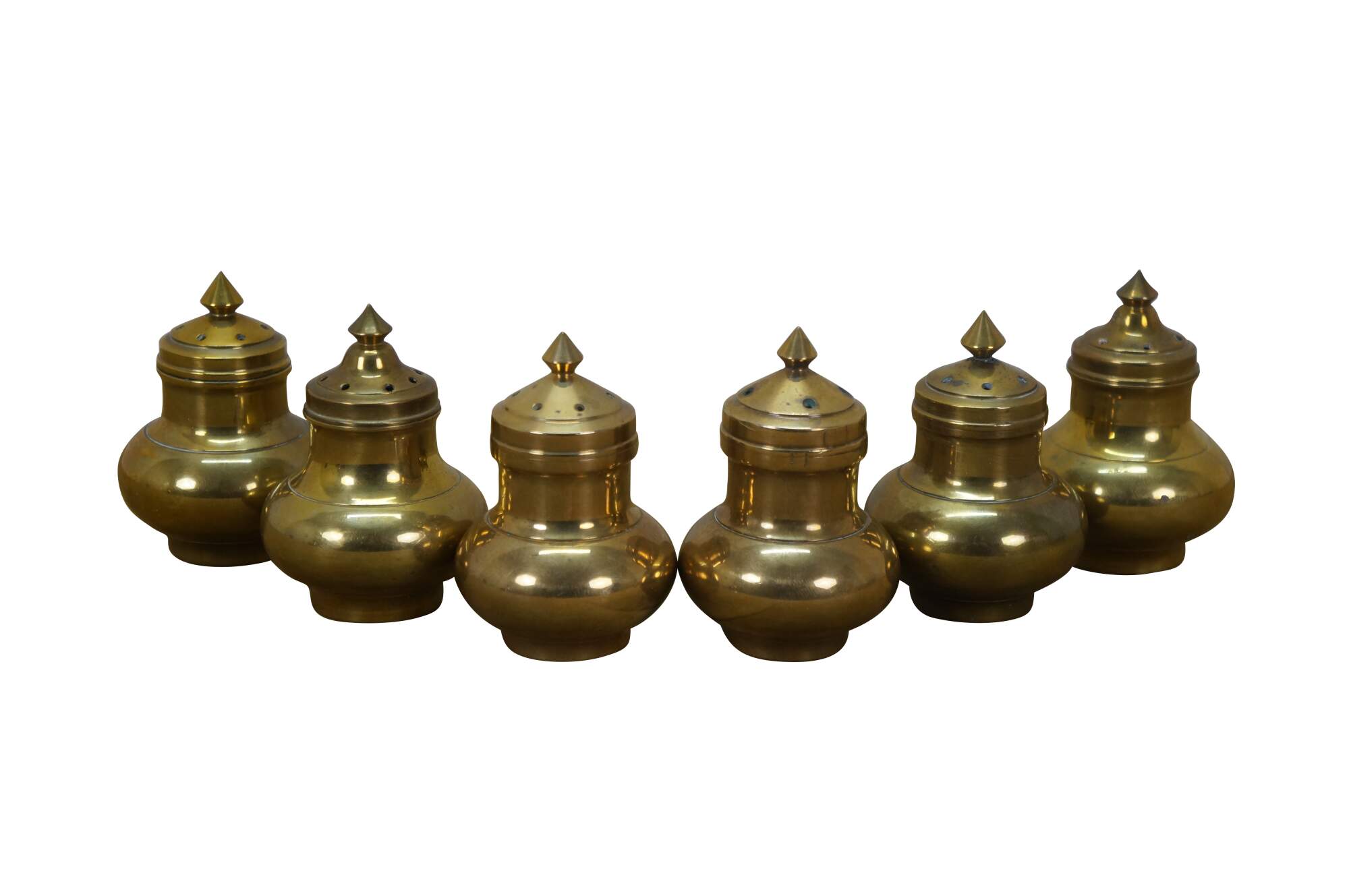 Set of six (three pairs) of mid 20th century miniature brass salt and pepper shakers - squat onion shaped body with cone shaped finial. Made in Thailand.