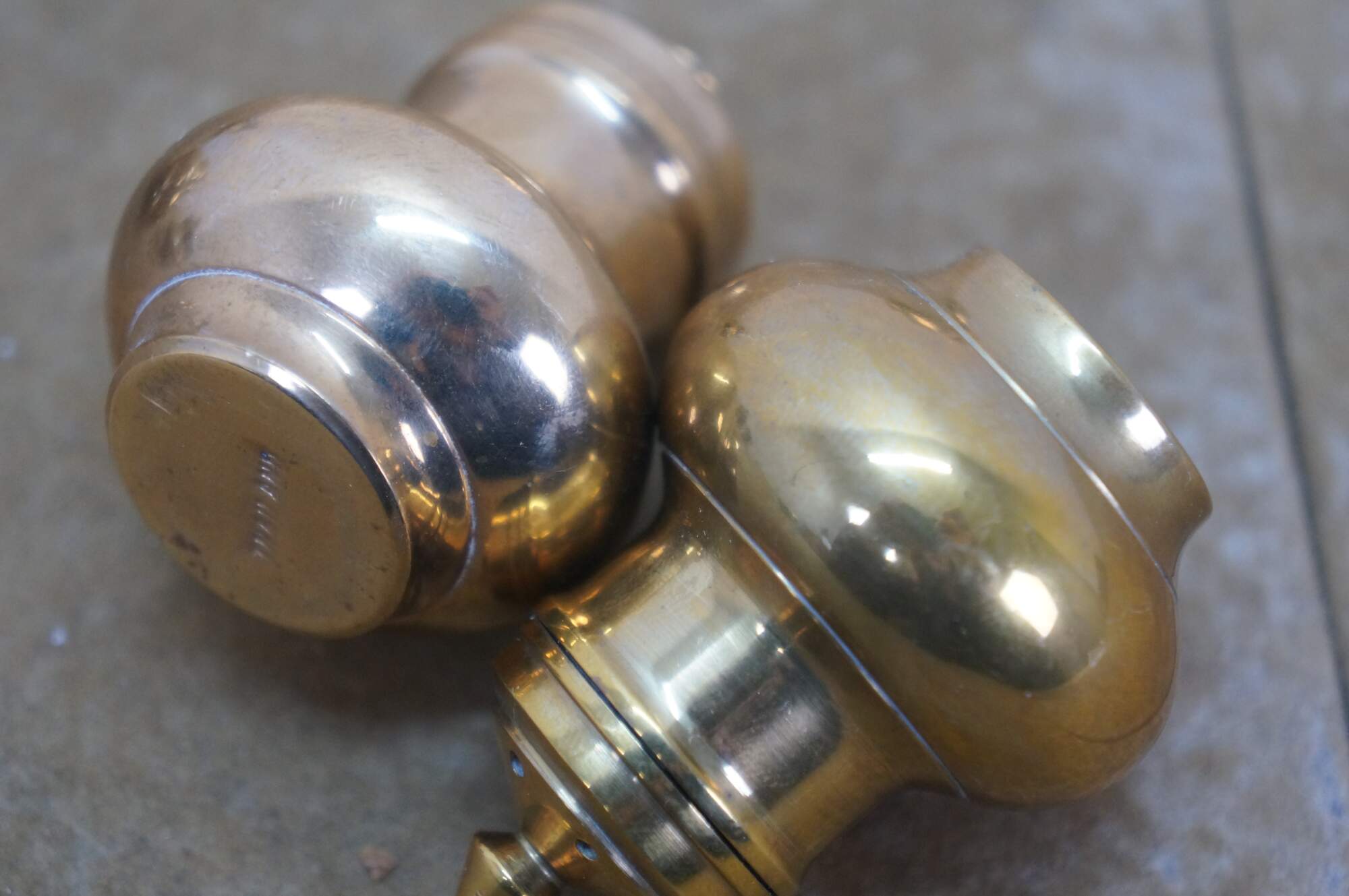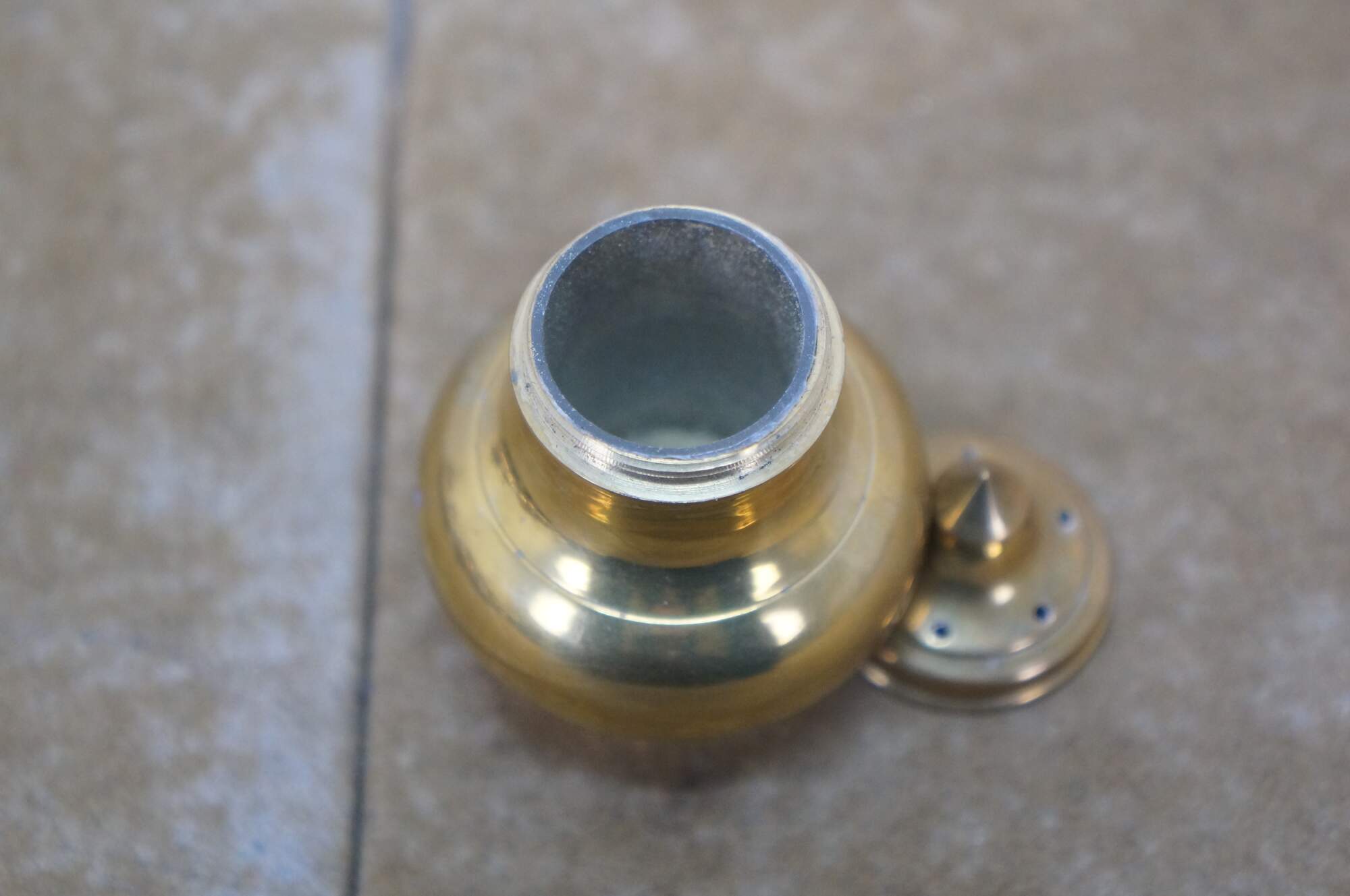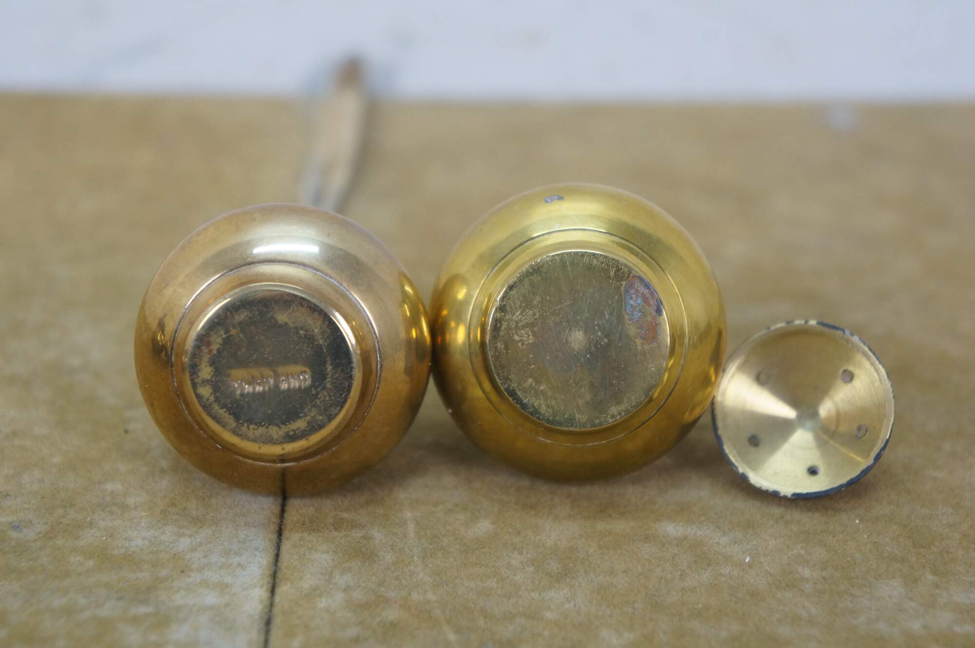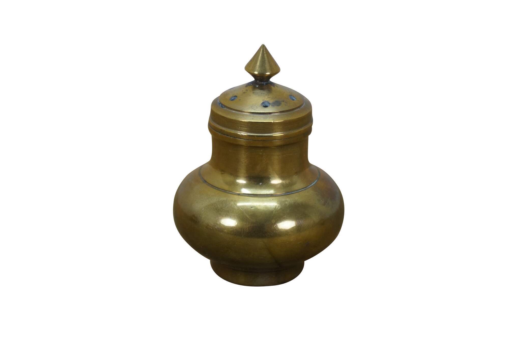 Set of six (three pairs) of mid 20th century miniature brass salt and pepper shakers - squat onion shaped body with cone shaped finial. Made in Thailand.