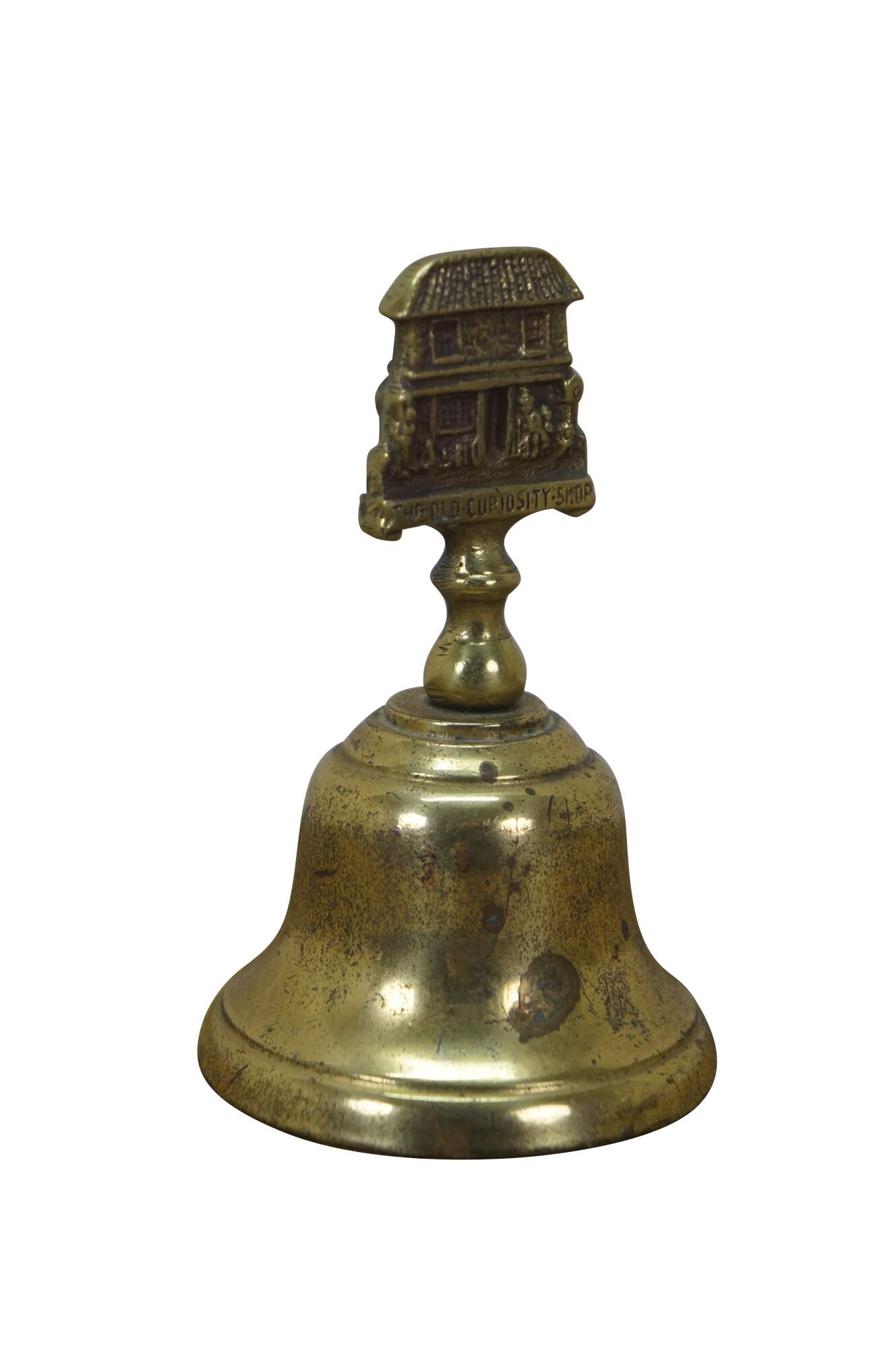 Vintage 20th century Peerage brass dinner / hand bell topped with a handle depicting The Old Curiosity Shop from the novel of the same name by Charles Dickens.