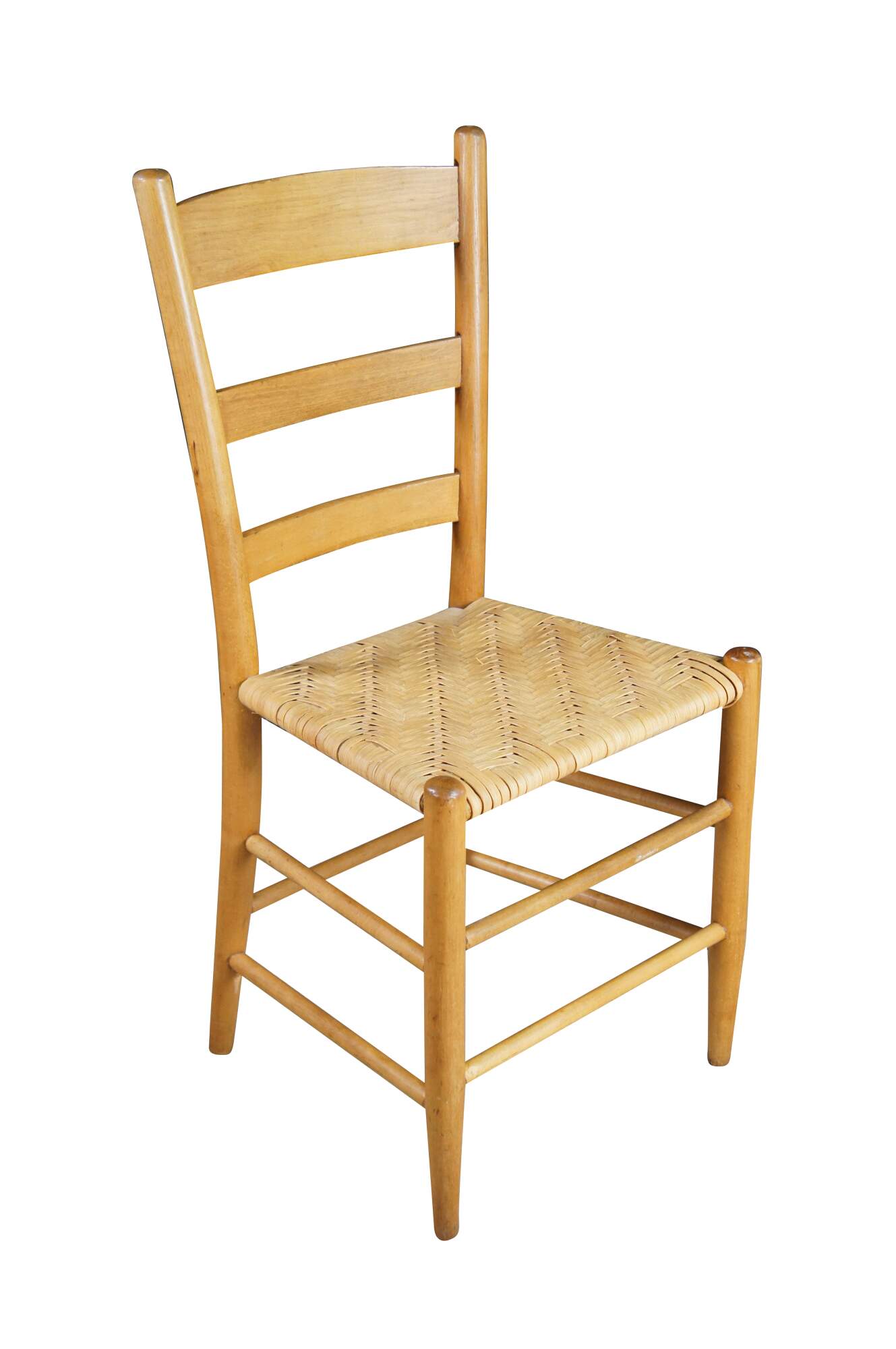 Set of 6 antique Shaker style country farmhouse dining chairs. Made of Maple featuring a woven rattan seat and ladder back design.