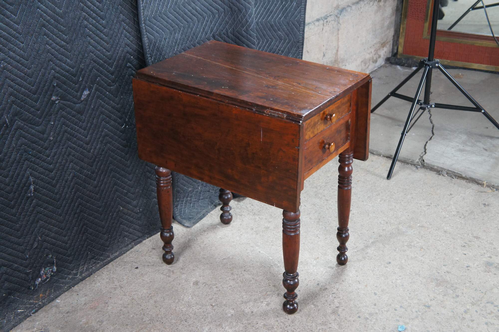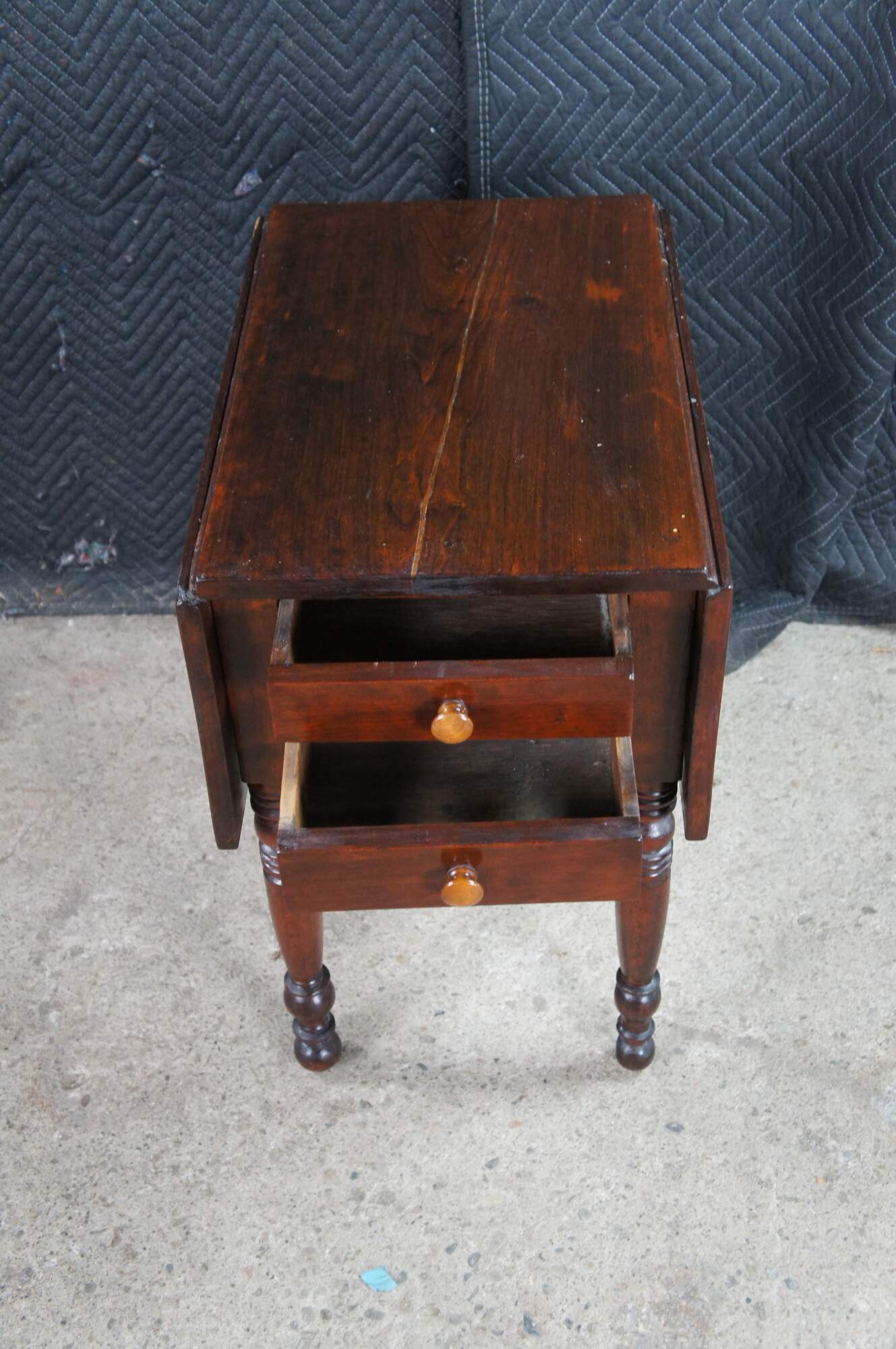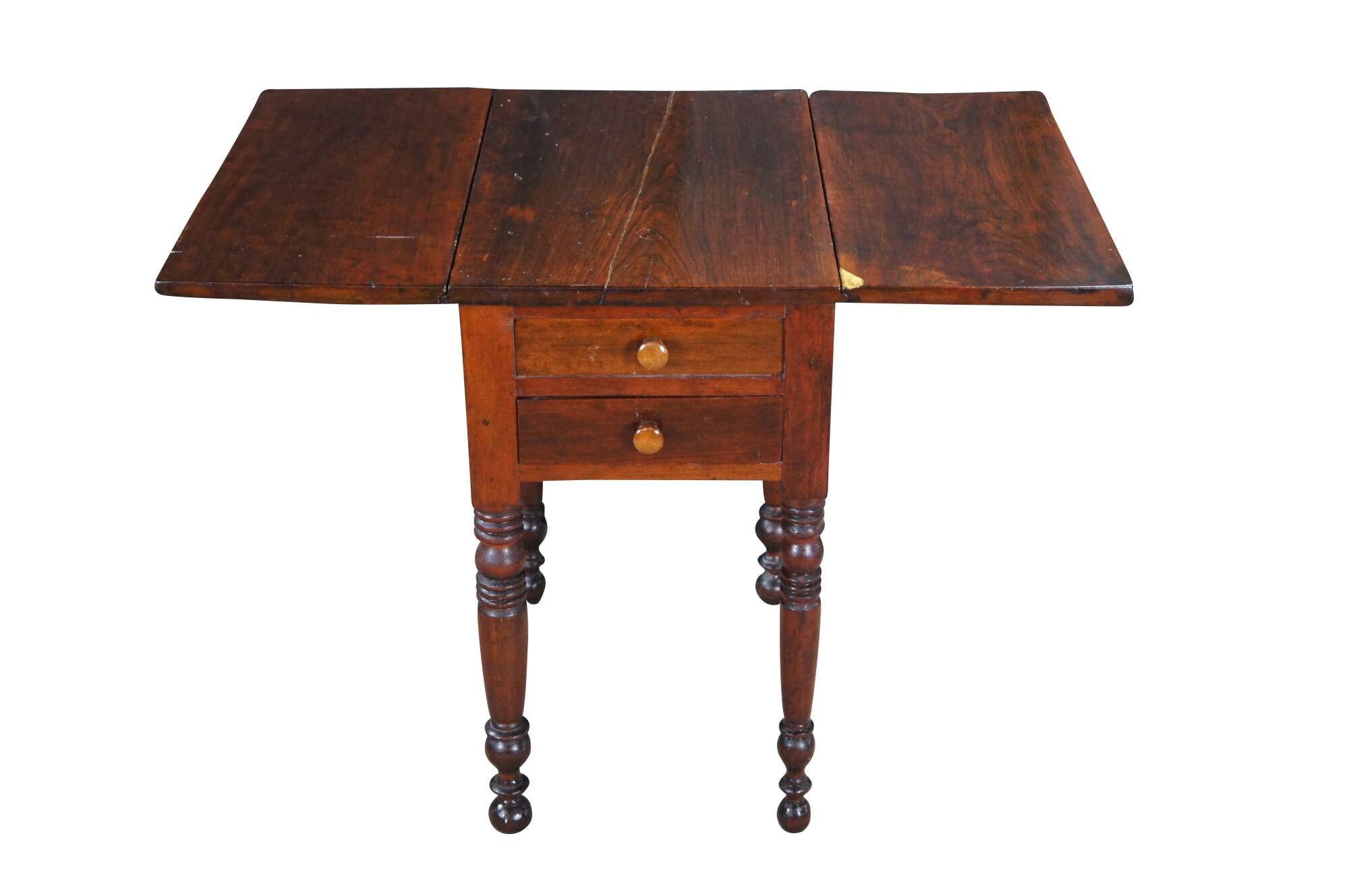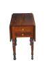 Antique cherry drop leaf side accent table. This table features American federal styling with dropleaf sides, two drawers, and turned legs.