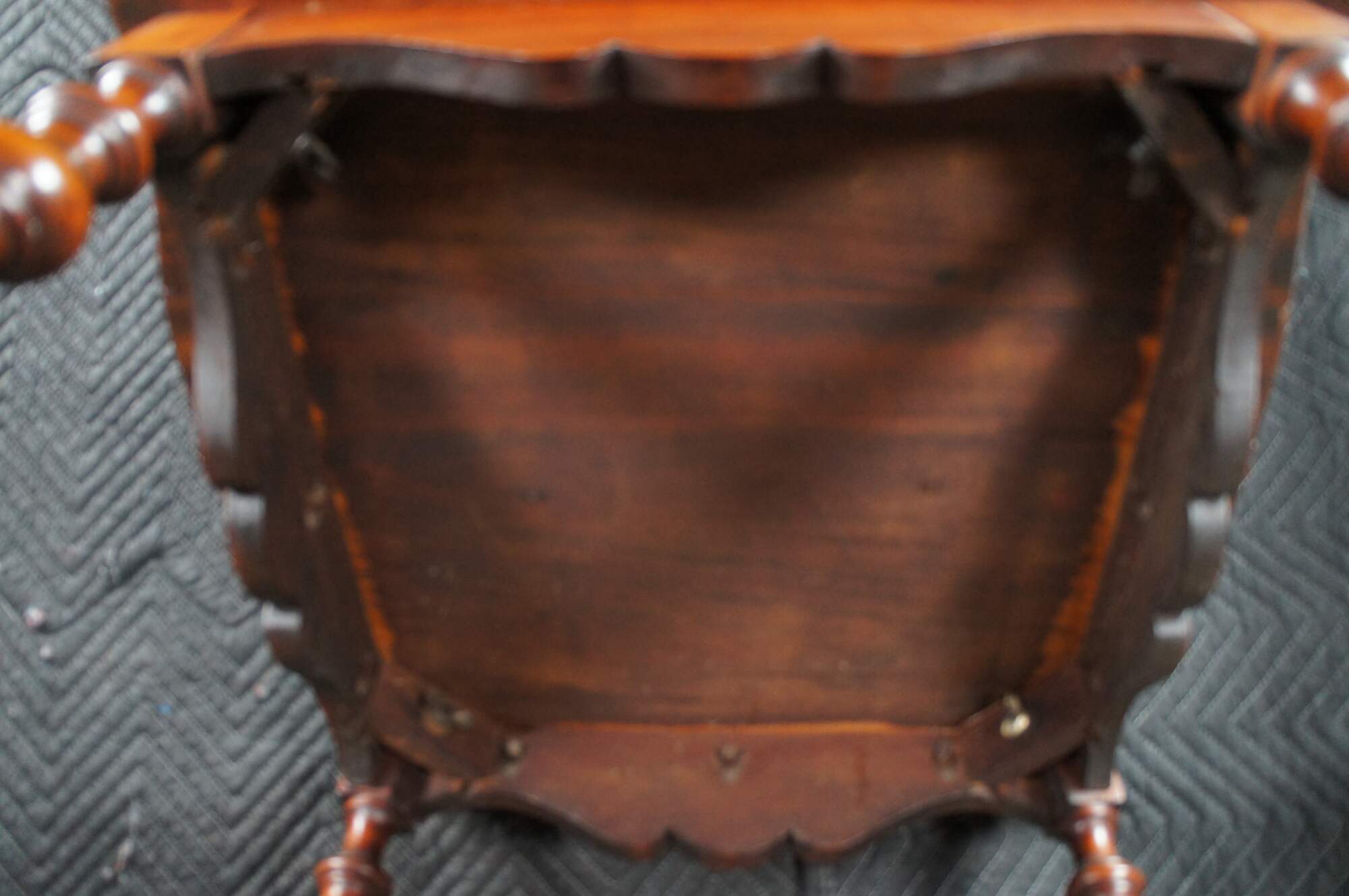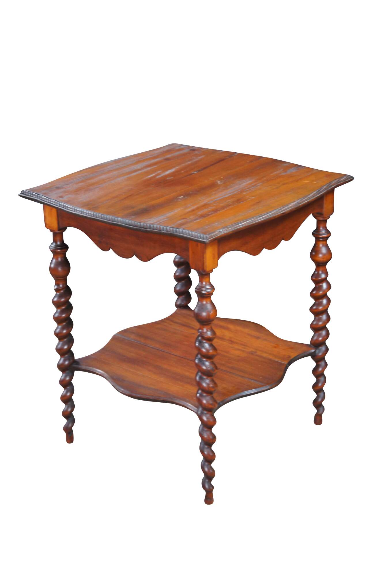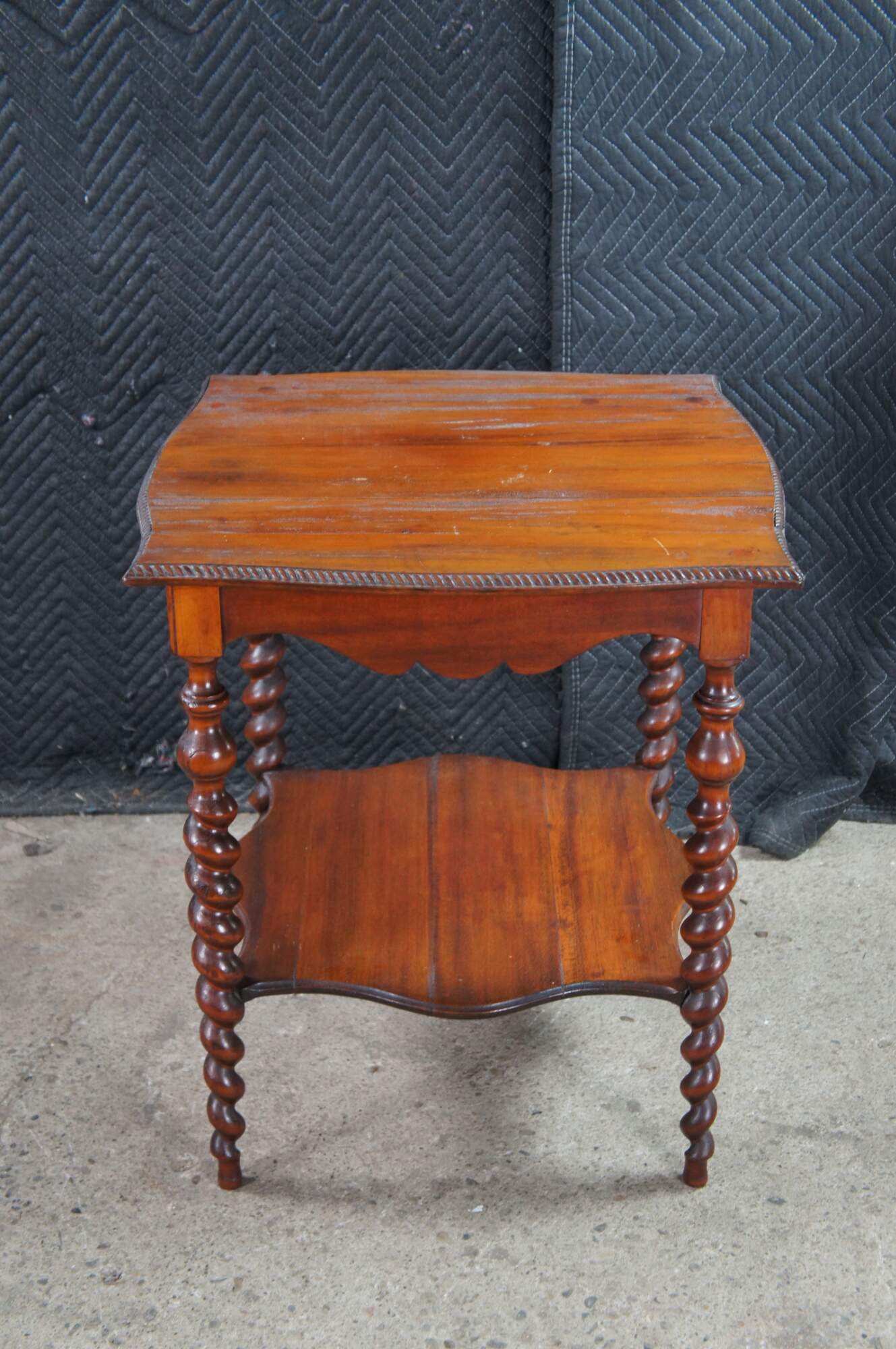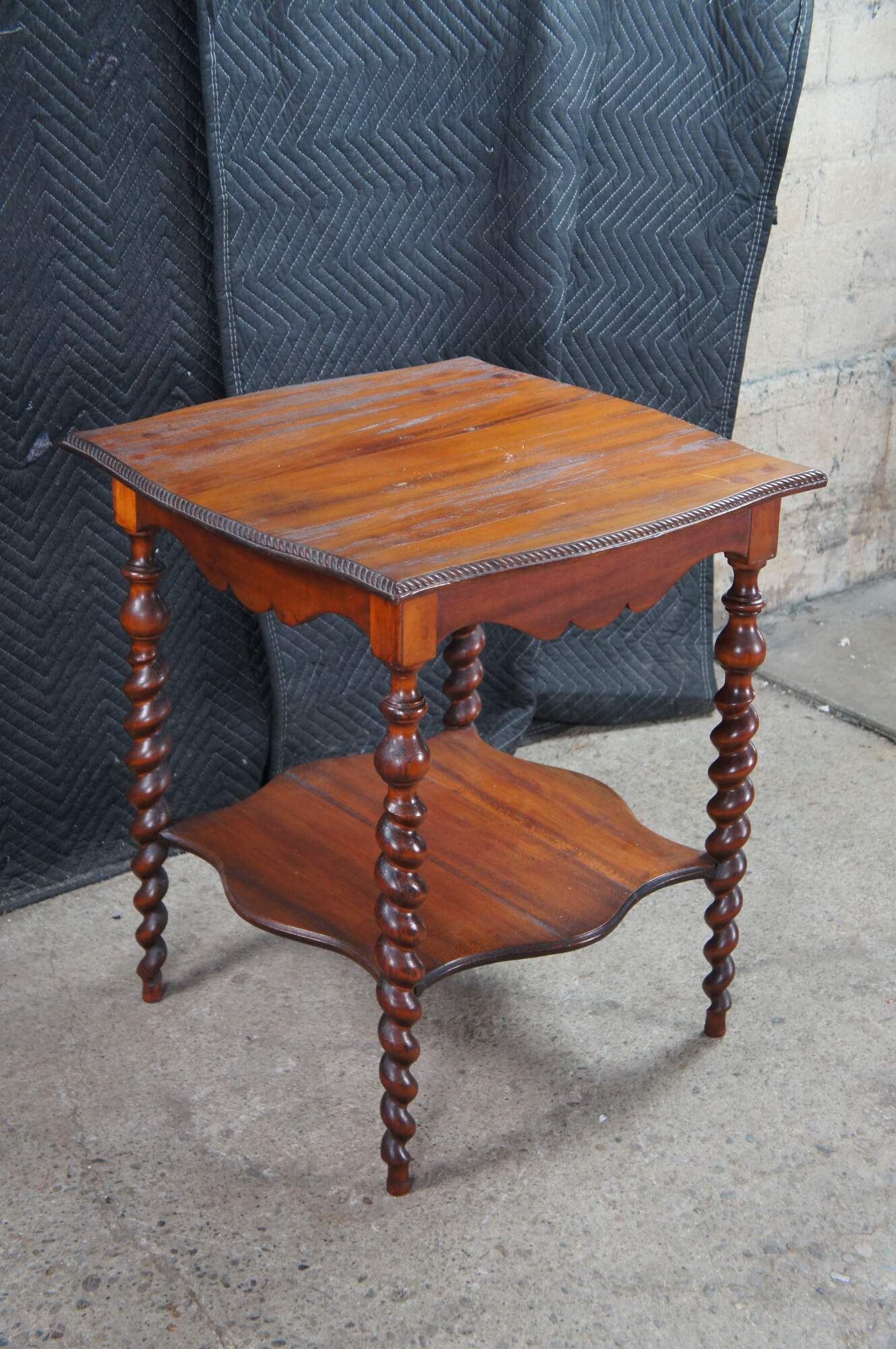 Antique Victorian two tiered barley twist parlor accent table. Made of mahogany featuring serpentine accents with lower shelf and turned legs.