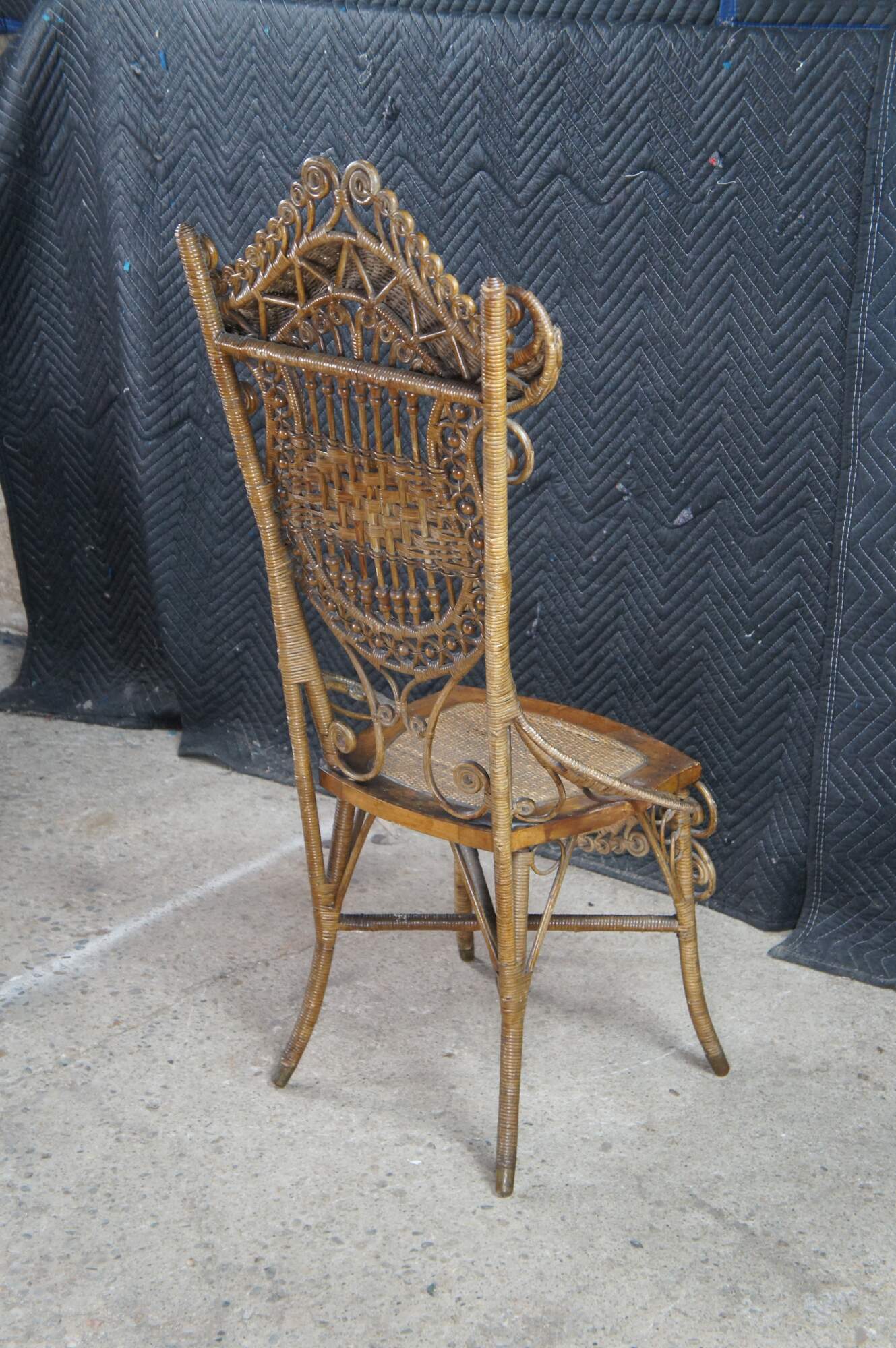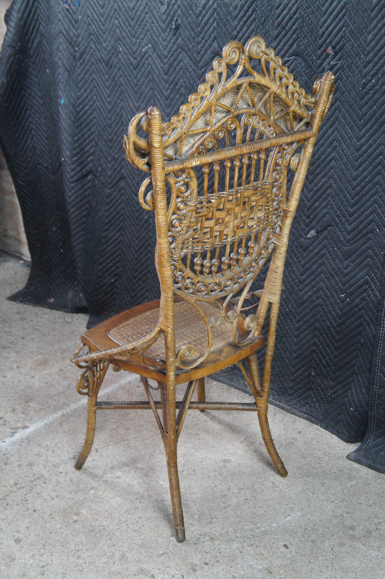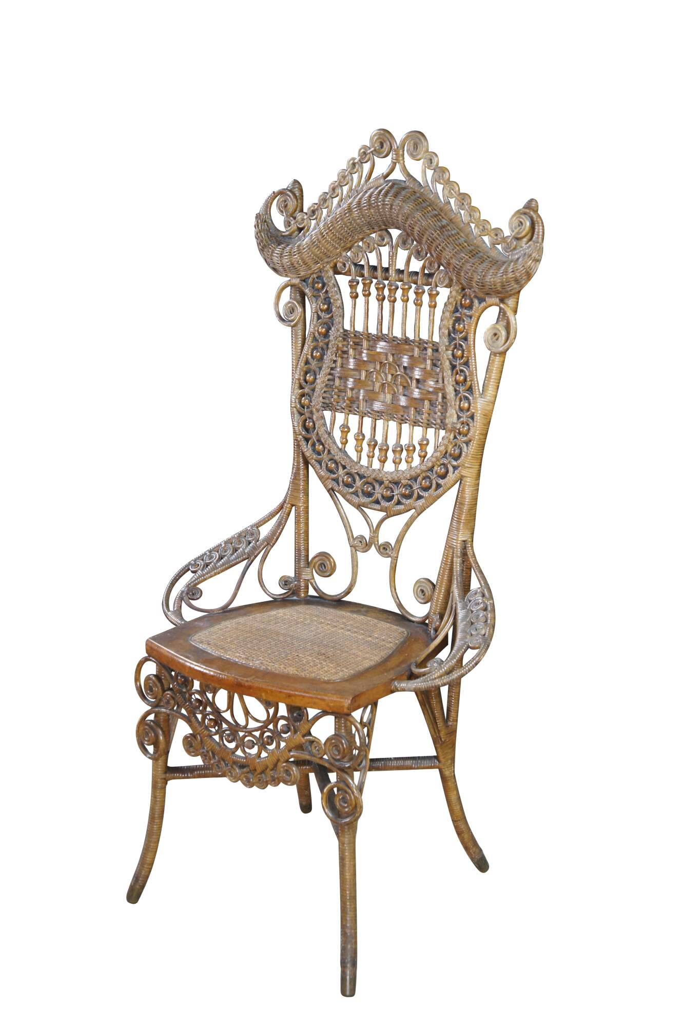 Antique Victorian portrait chair by the Indianapolis manufacturing company. Made of wicker and rattan featuring serpentine form with high reticulated / scrolled crest, harp shaped back entwined with ball and stick accents, and low swooping arms.
