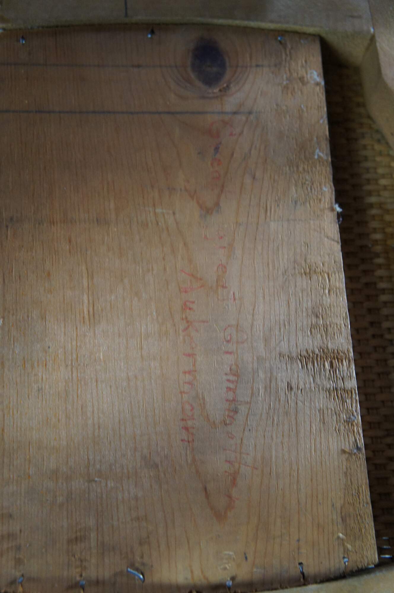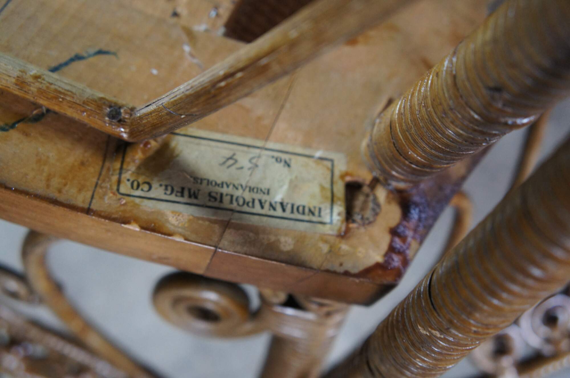Wear and distressing from age, scuffing, fading, finish loss, some breaks / splits in seat.