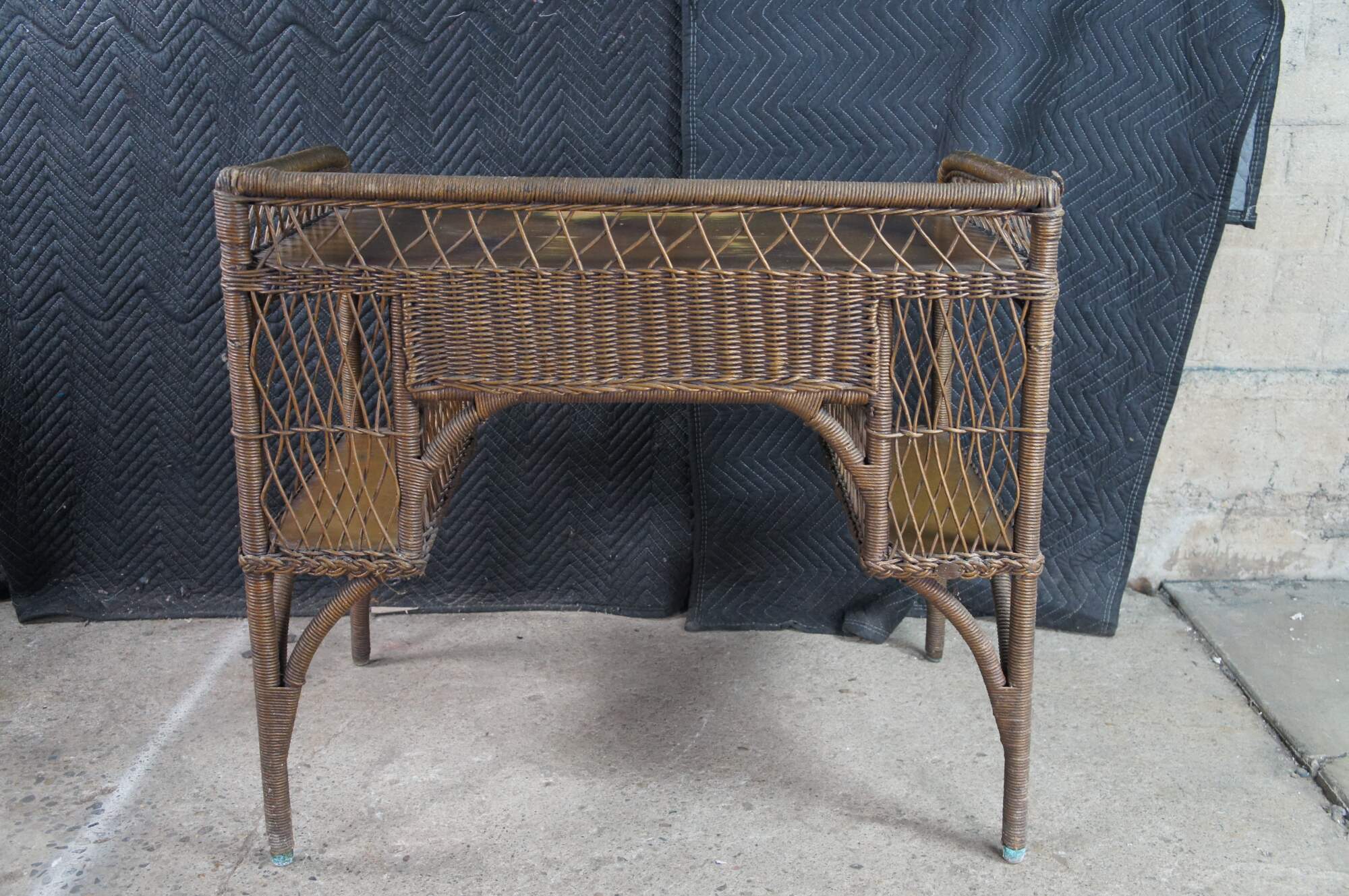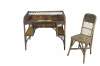Antique Heywood Wakefield wicker and rattan writing desk and chair. The desk features rectangular form with one drawer and two bookcases on either side.
