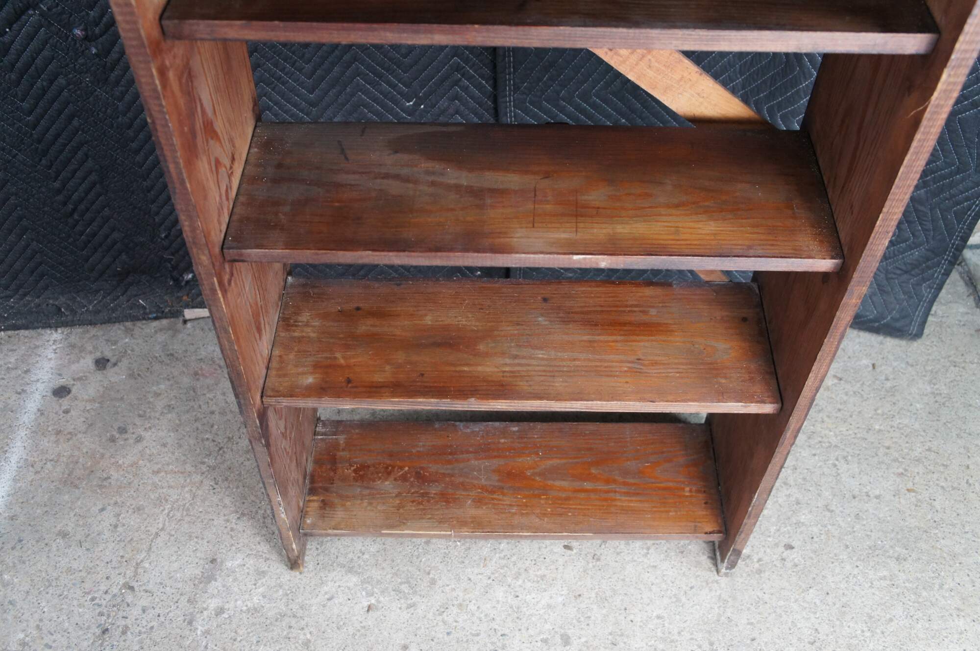 Vintage oak library book shelf featuring primitive styling with six tiers.