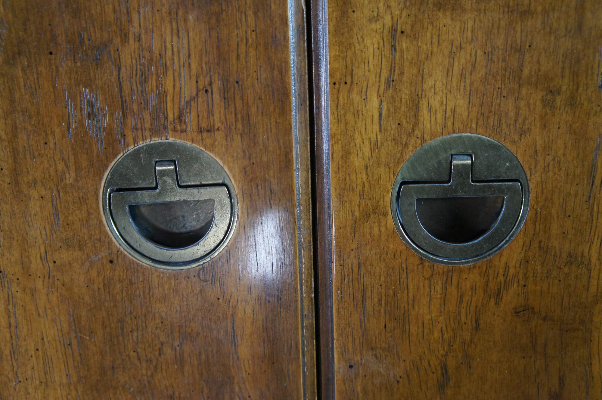 Structurally solid, distressing from use, scuffing, marking, fading, holes, veneer loss, corner / edge wear, oxidation to hardware.