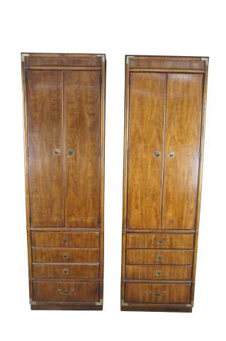 A pair of vintage Drexel Accolade II clothing armoires, cabinets, closets. Made of walnut featuring Campaign styling with divided upper cubbies over lower chest of drawers with brass hardware.