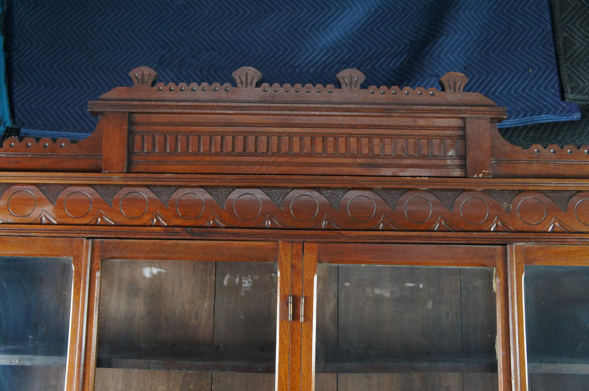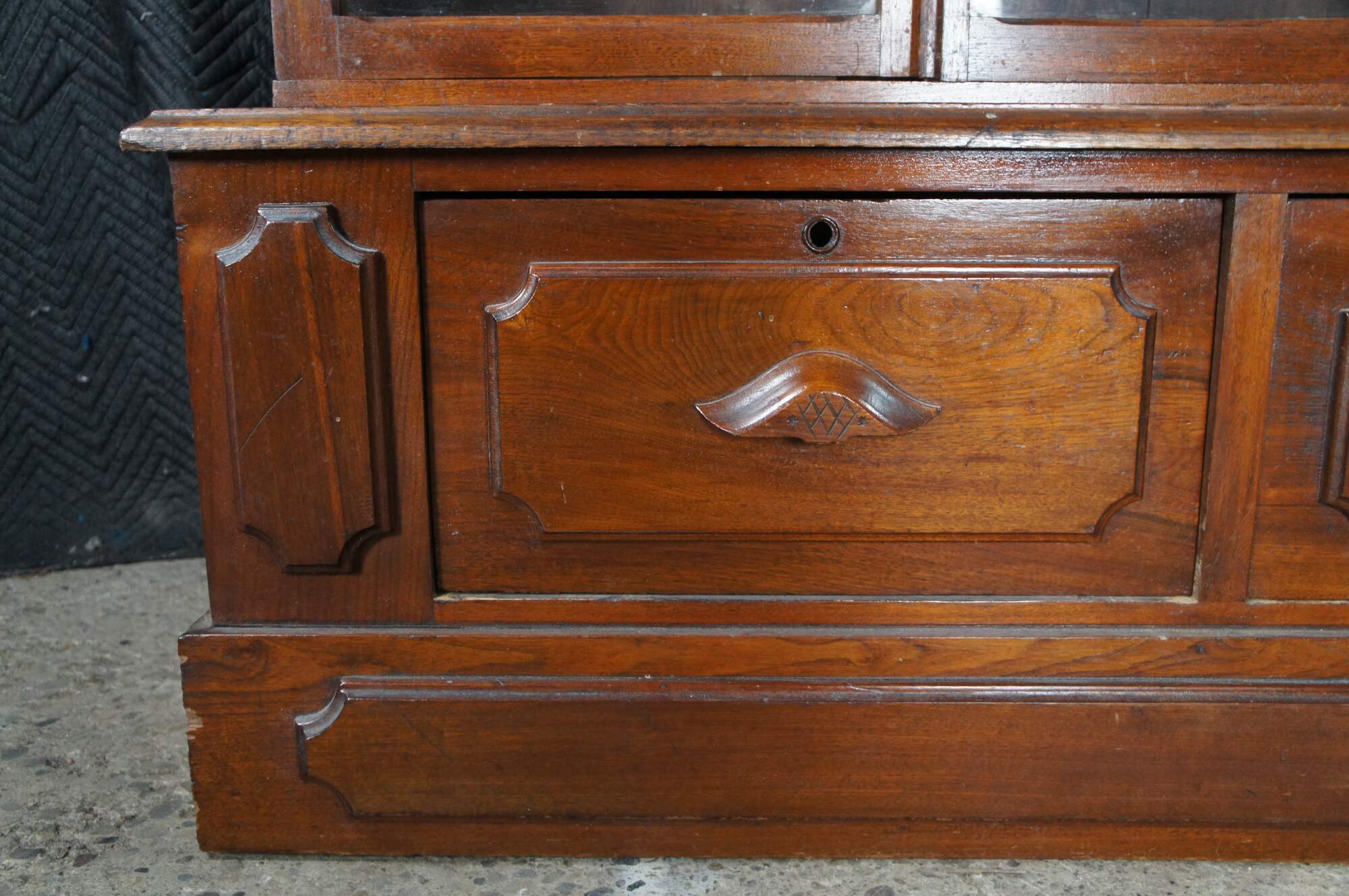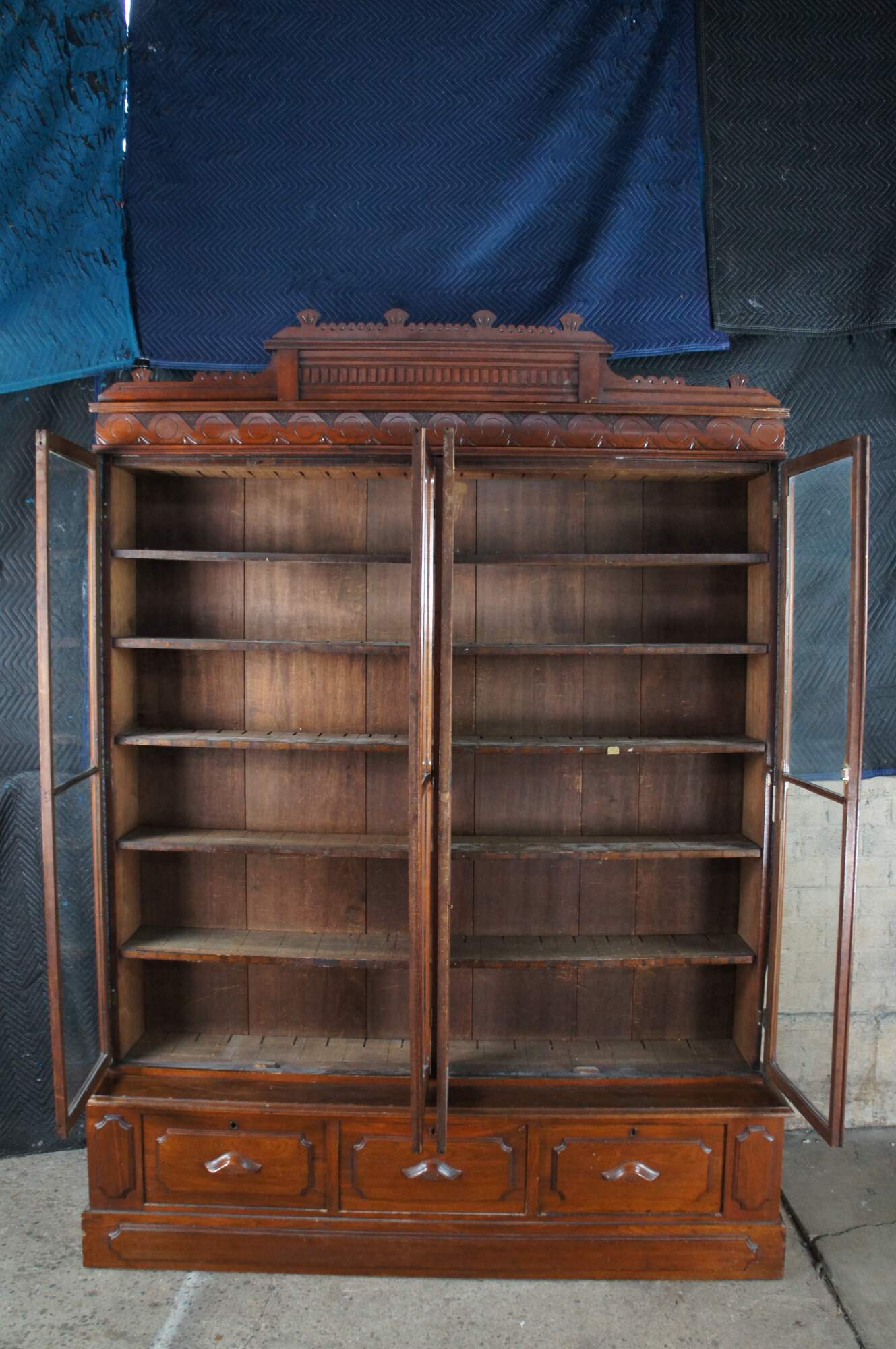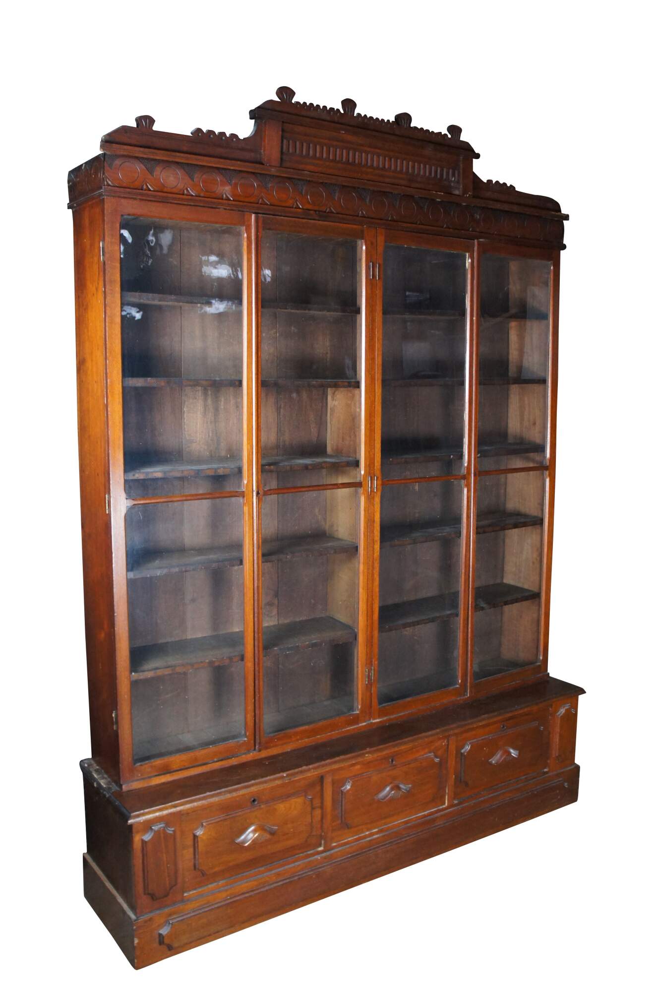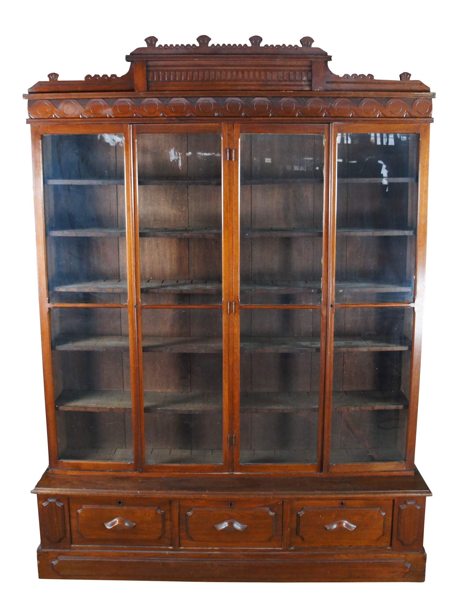 A very large and impressive Antique Victorian stepback library book display case / curio cabinet / showcase. Made of walnut featuring Eastlake styling with large full length / full view doors supported by paneled base with three drawers.