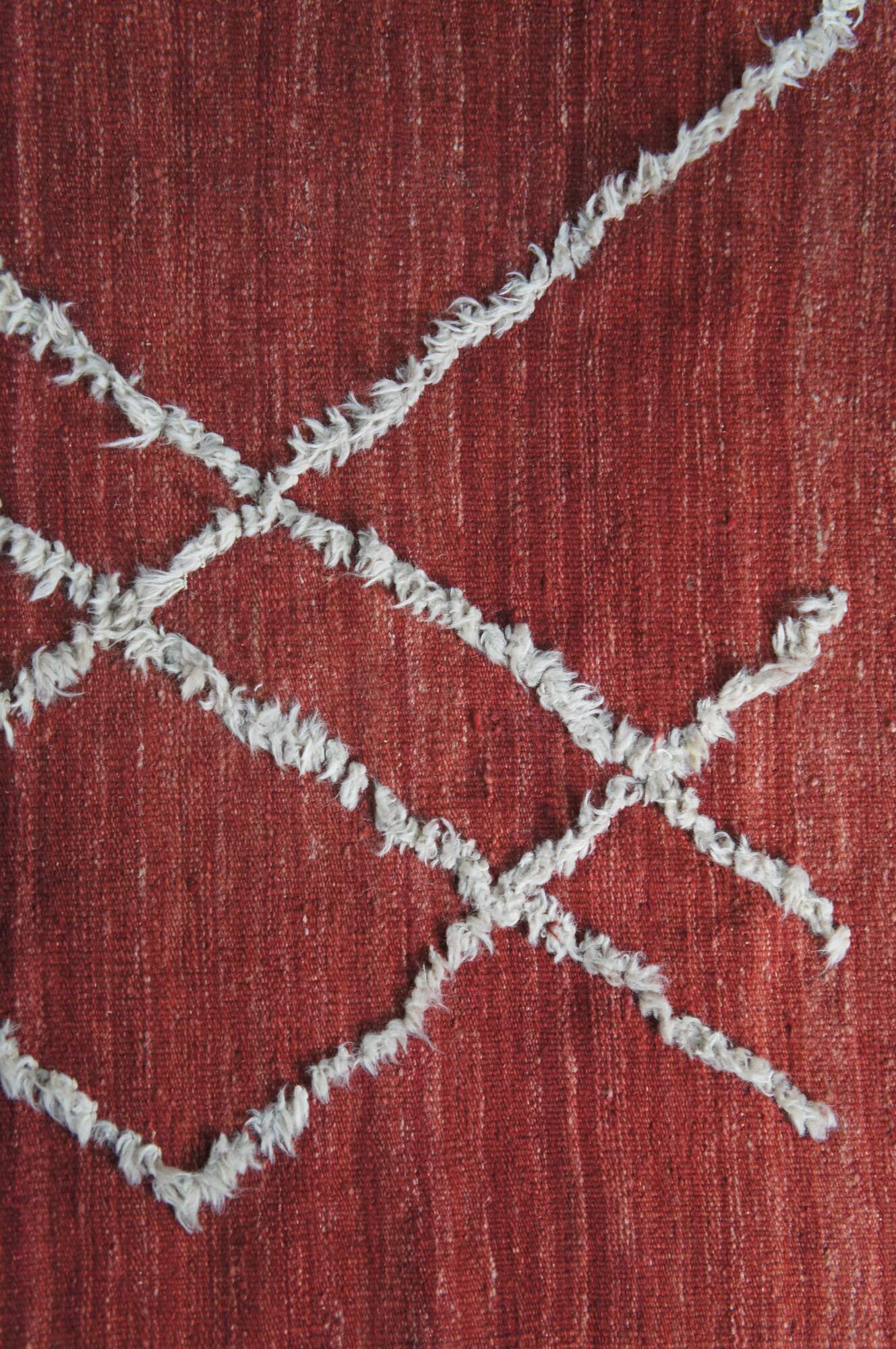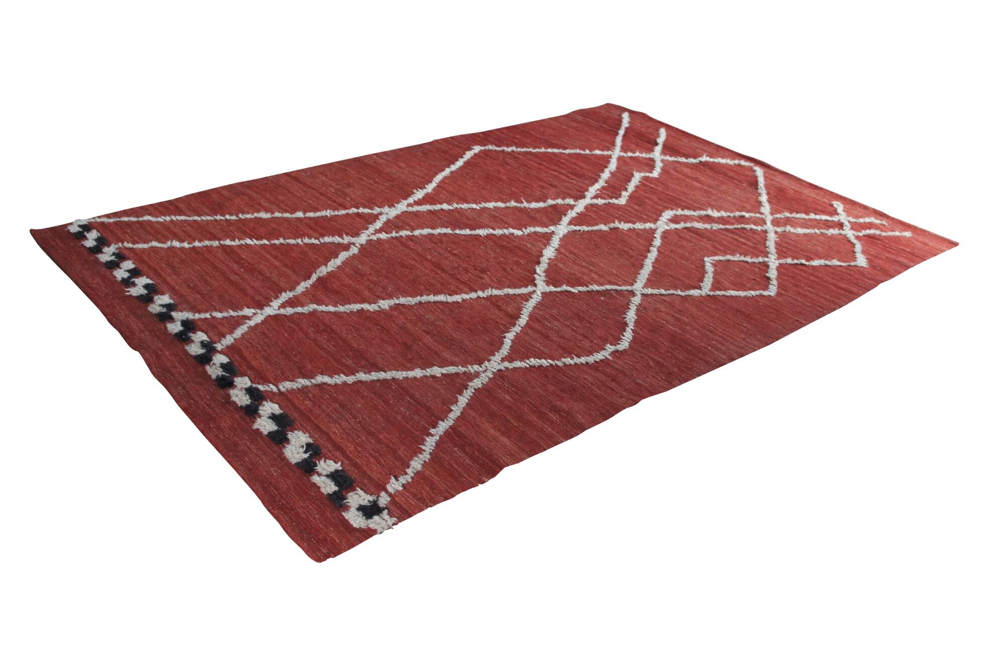 Vintage hand knotted Moroccan style wool kilim area rug with geometric raised fringe pattern that terminates into a checkerboard finish line accent.