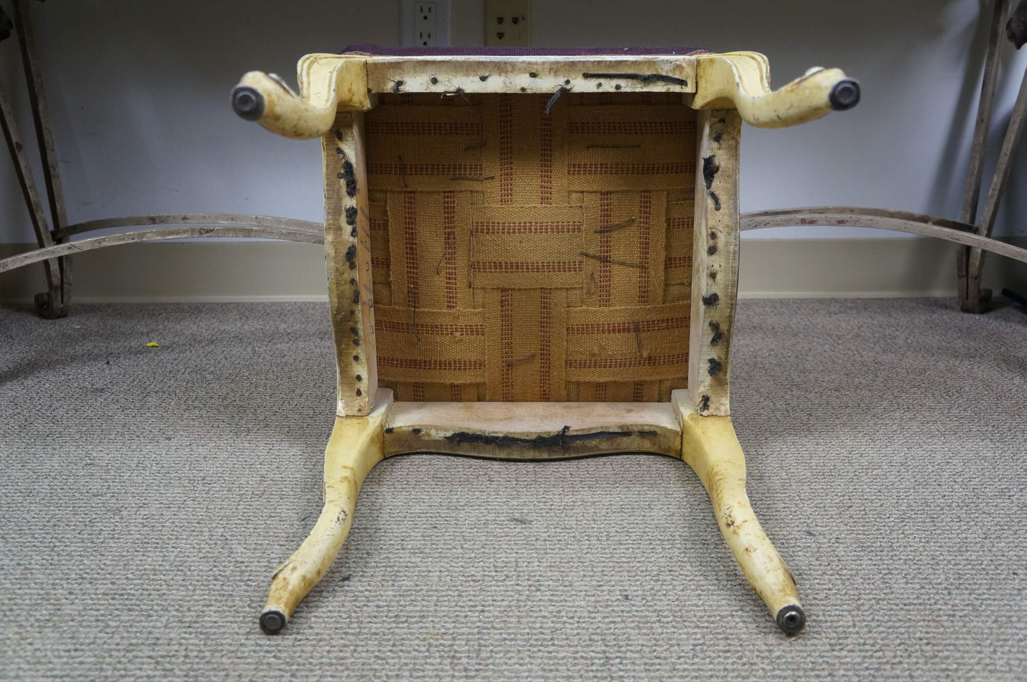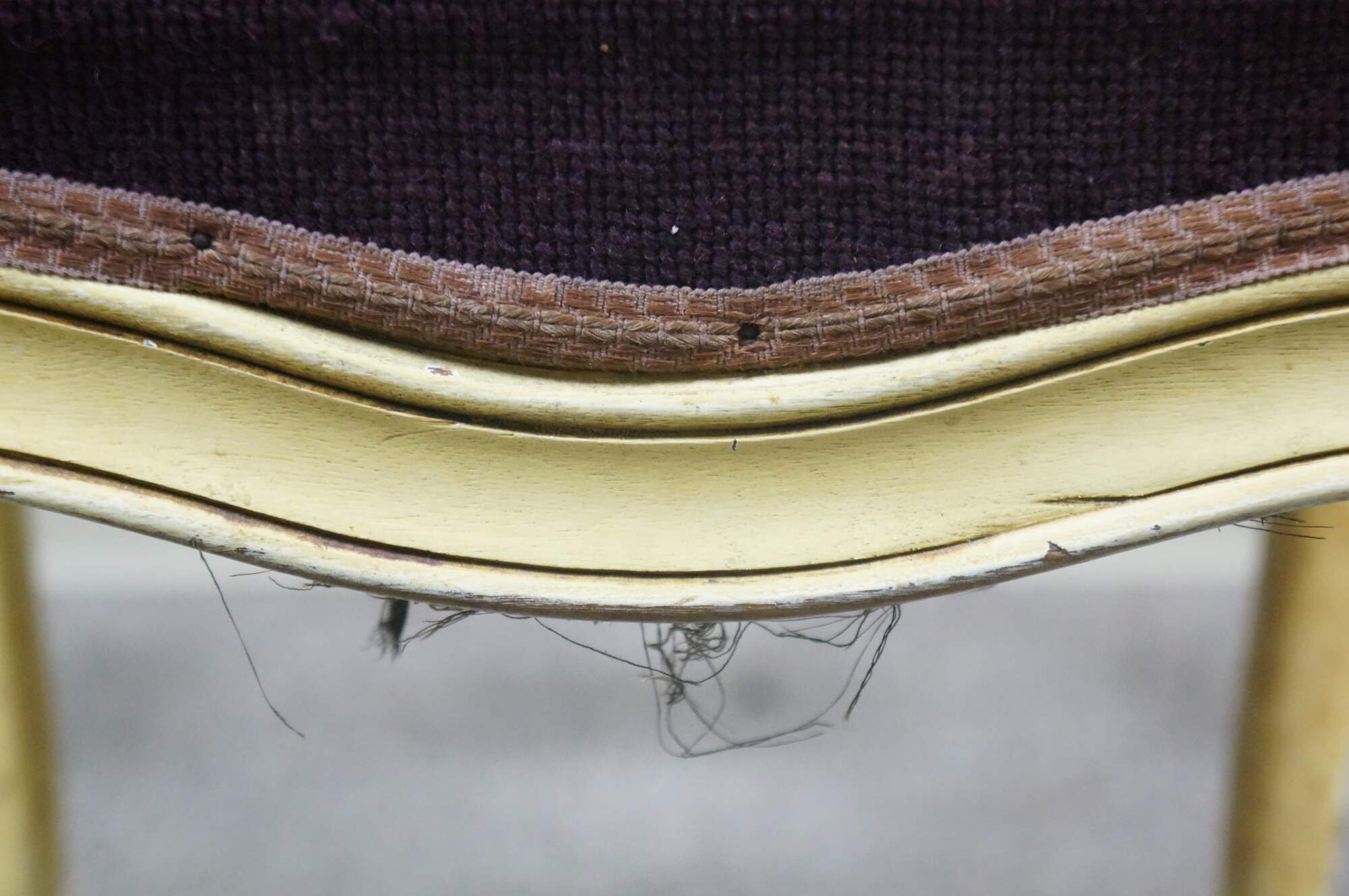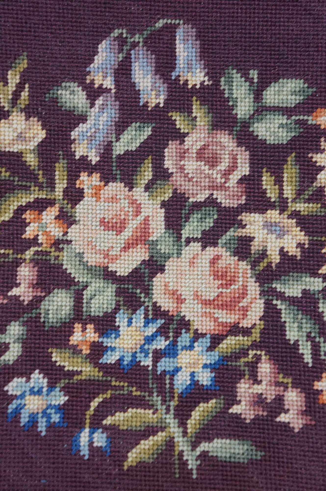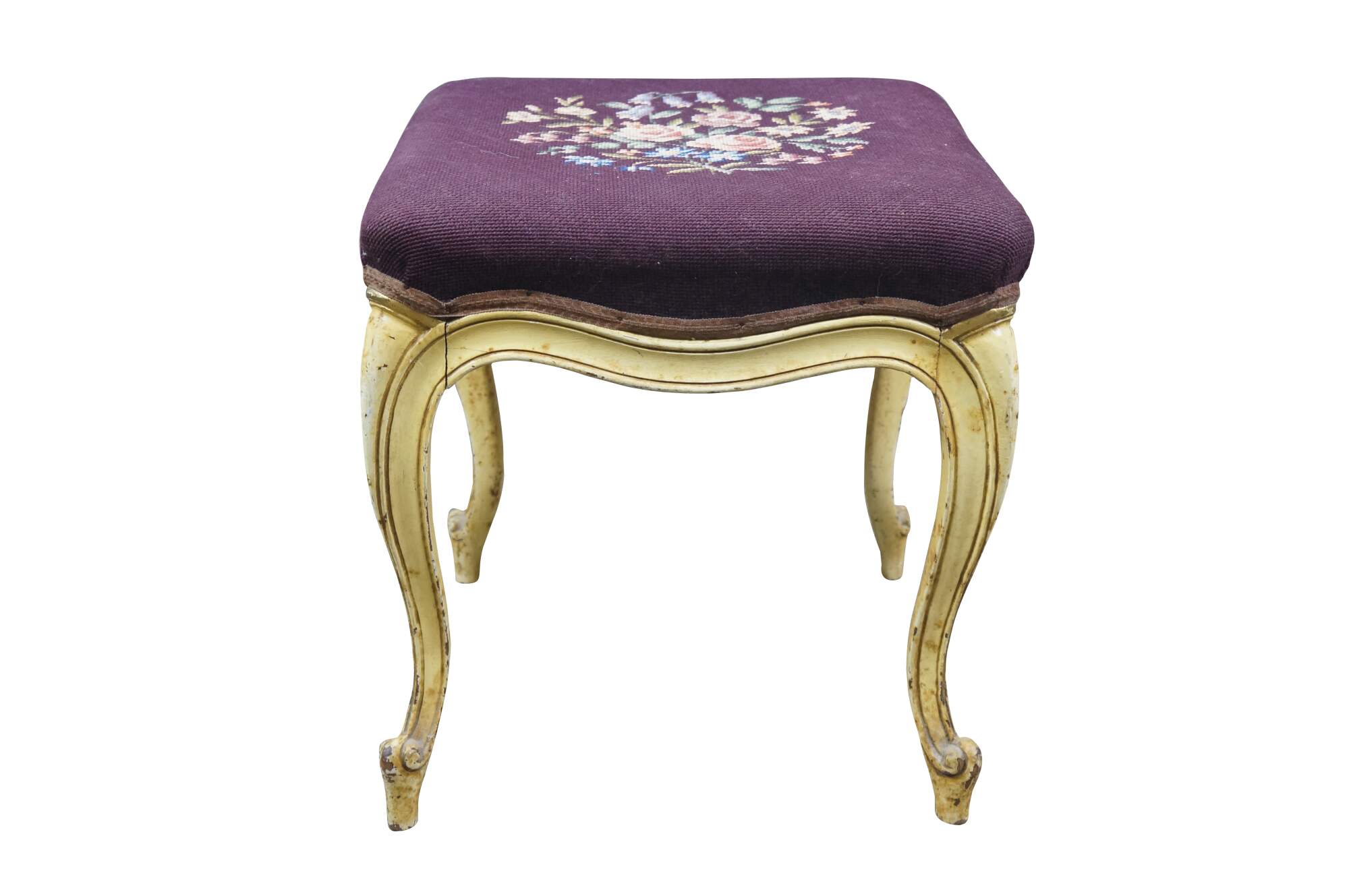 Early to mid 20th century vanity bench / stool. Off white painted cabriole legs; grape purple needlepoint seat embroidered with a bouquet of flowers. French provincial / Queen Anne / Victorian styling.