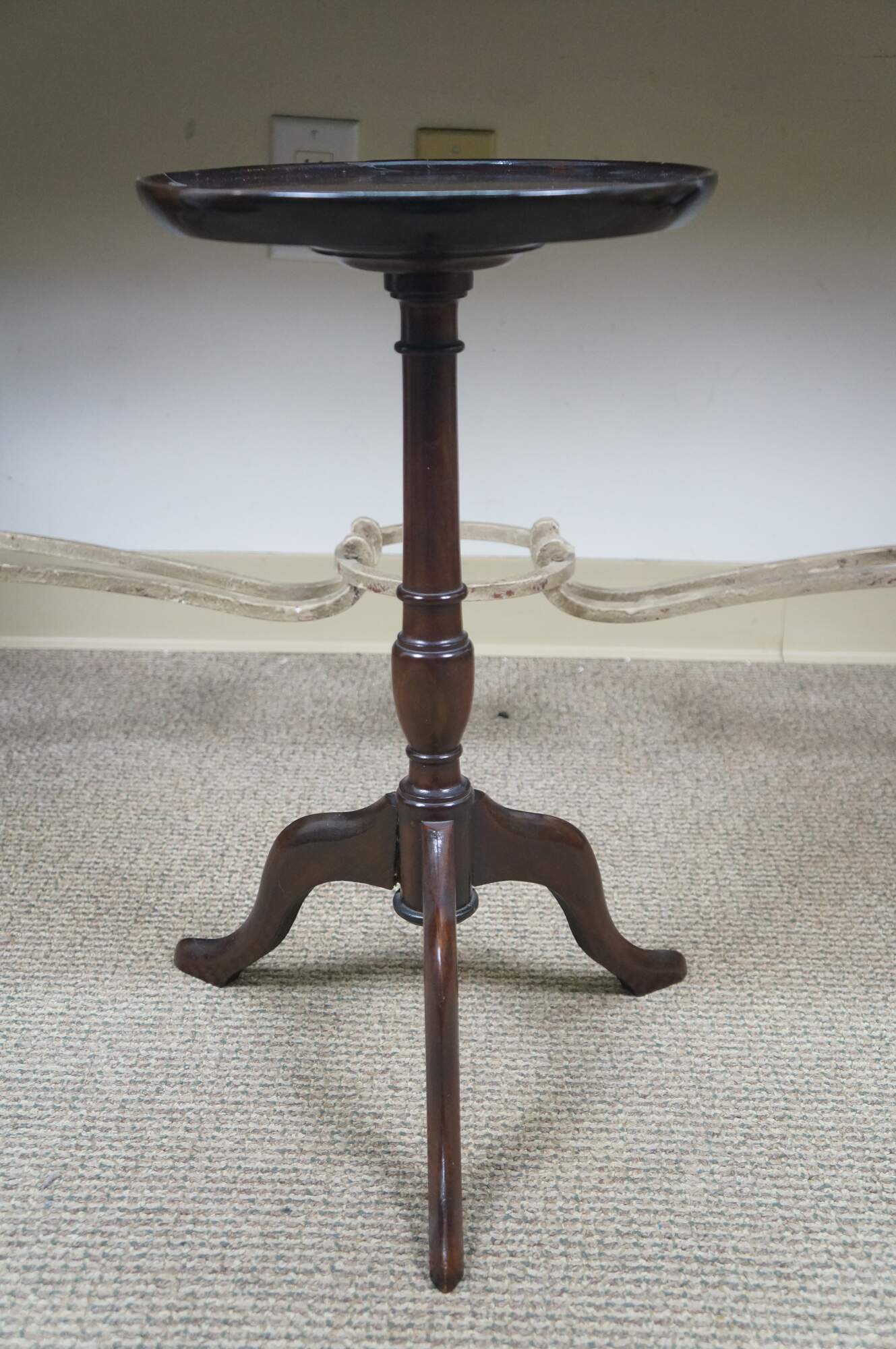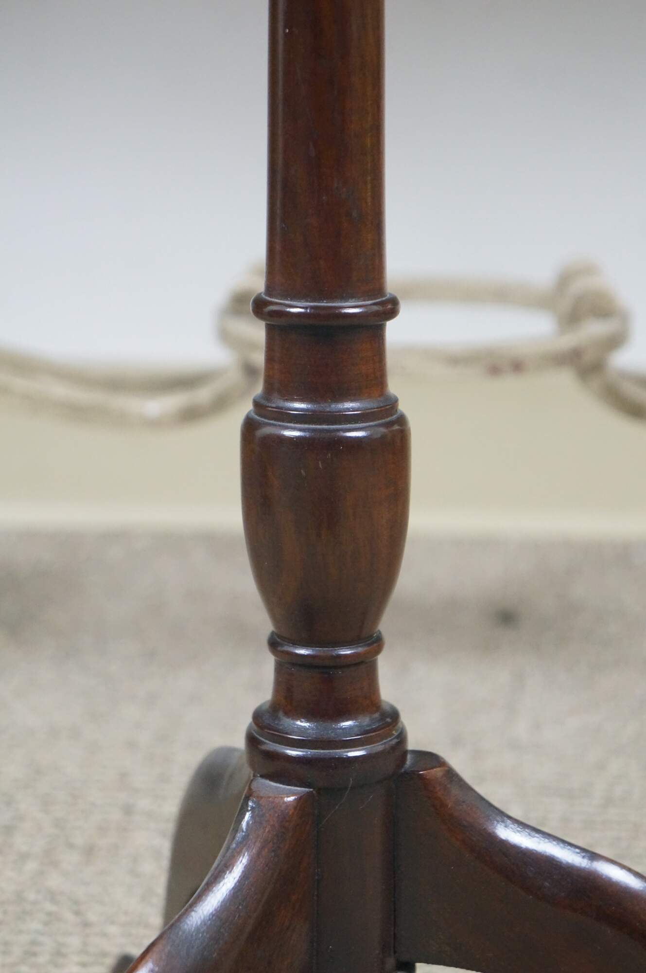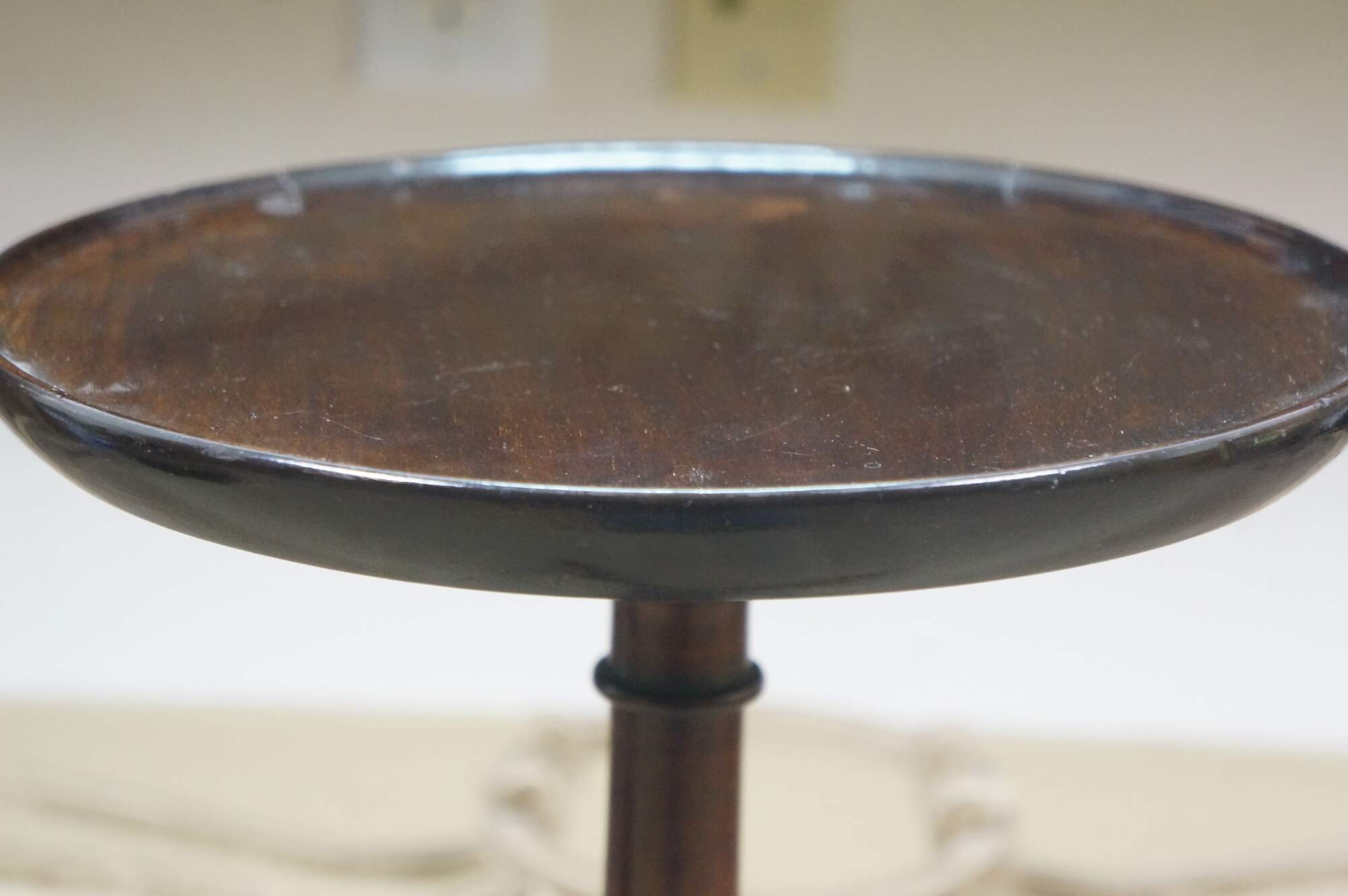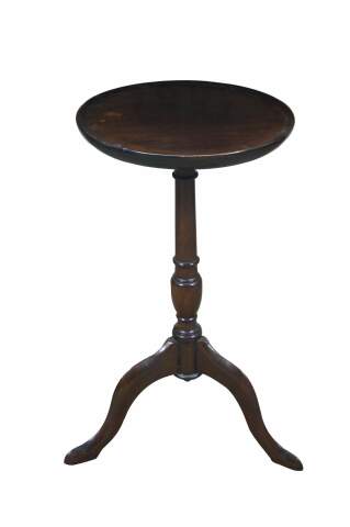 Circa mid 20th century mahogany candle / plant stand with round top, turned pedestal base and tripod feet. Top screws onto base. Made in England.