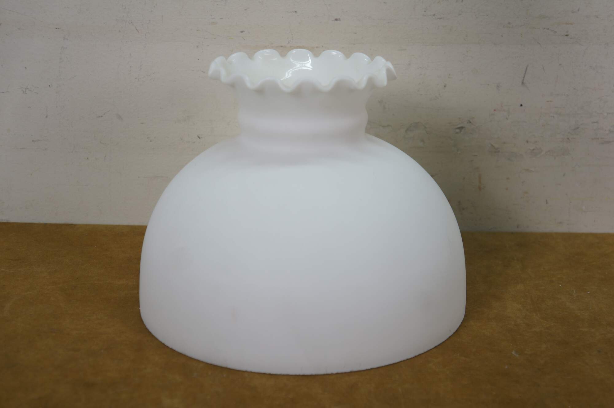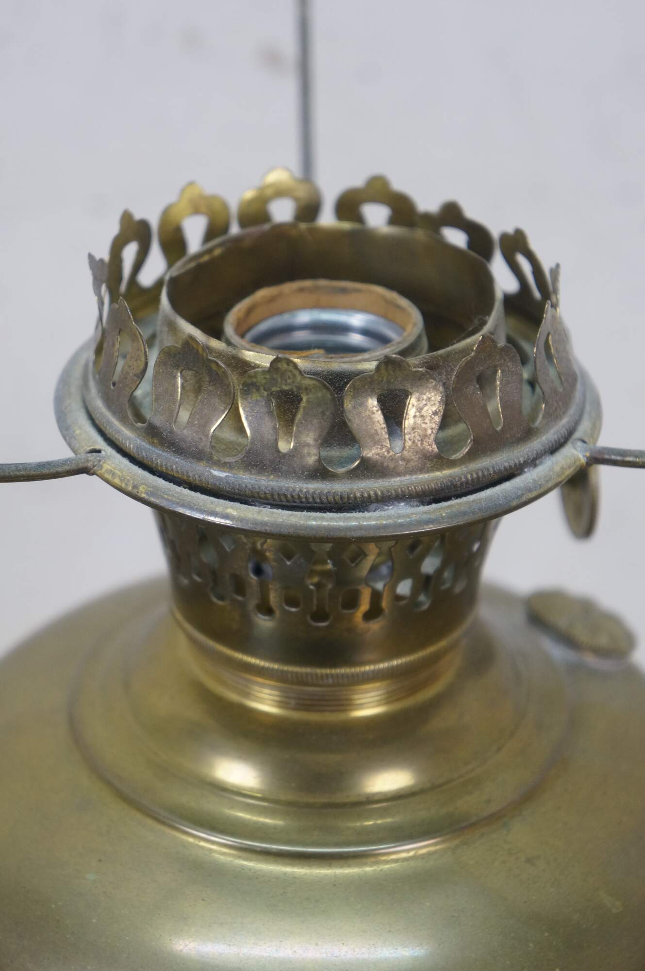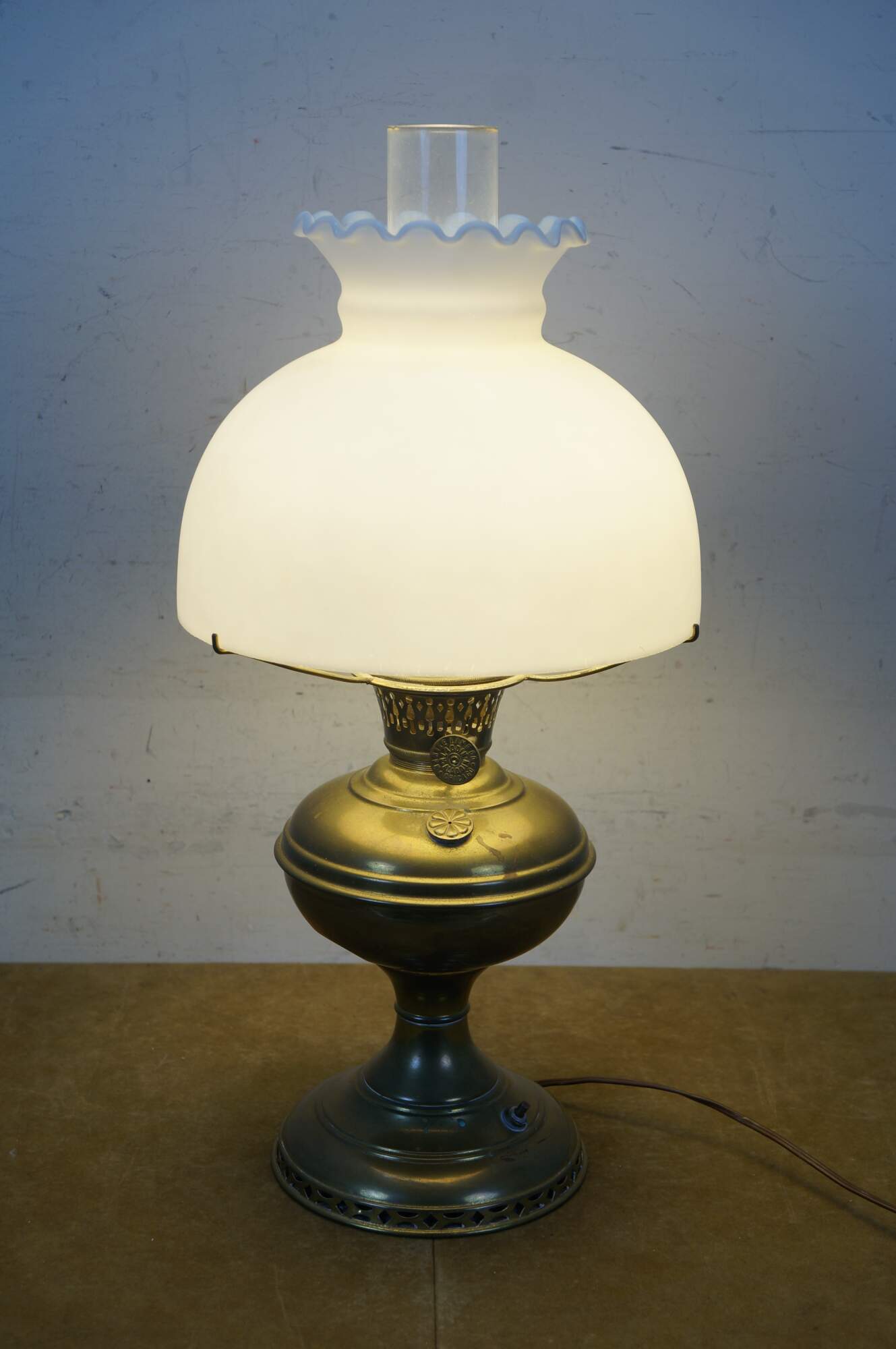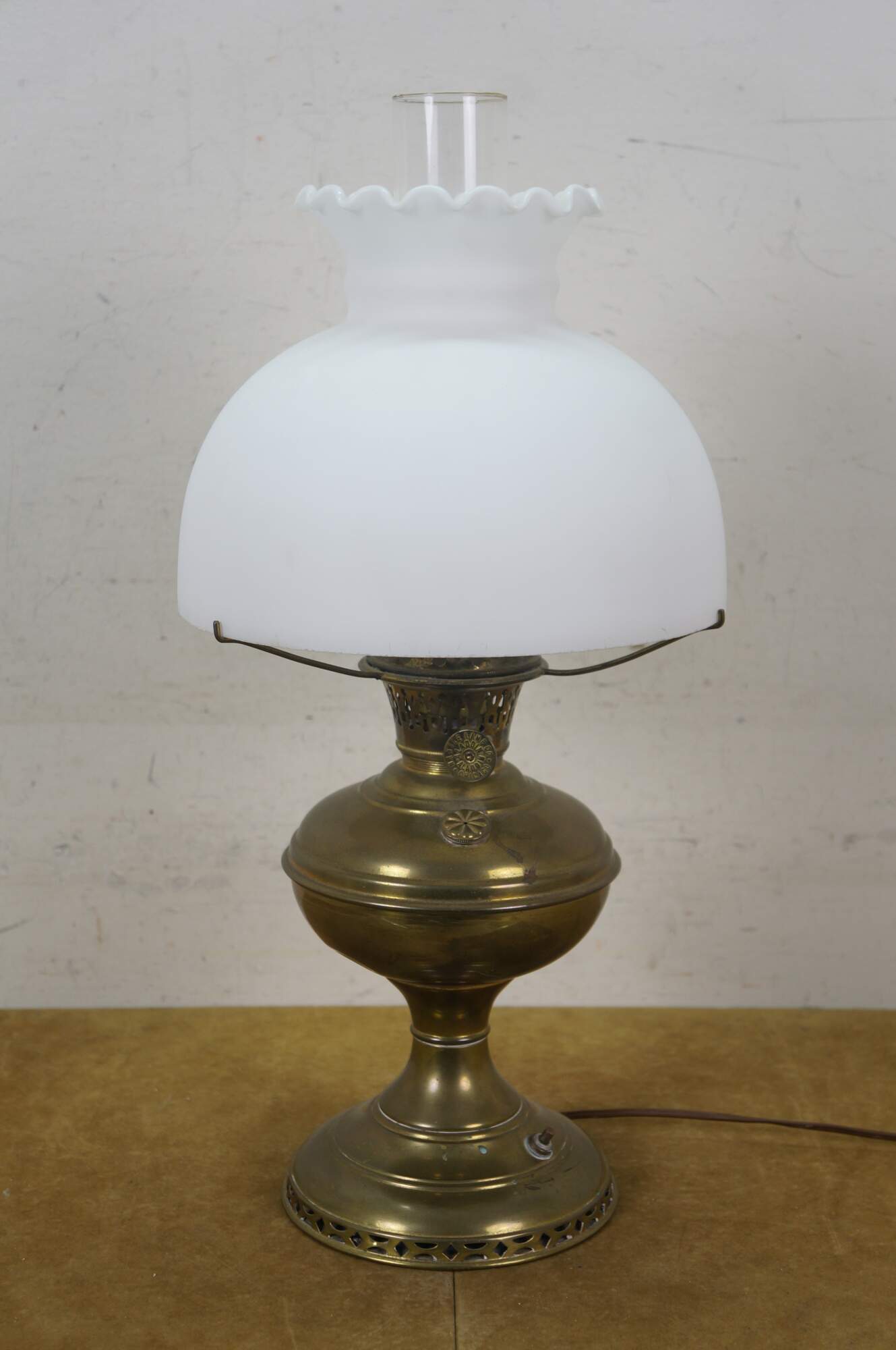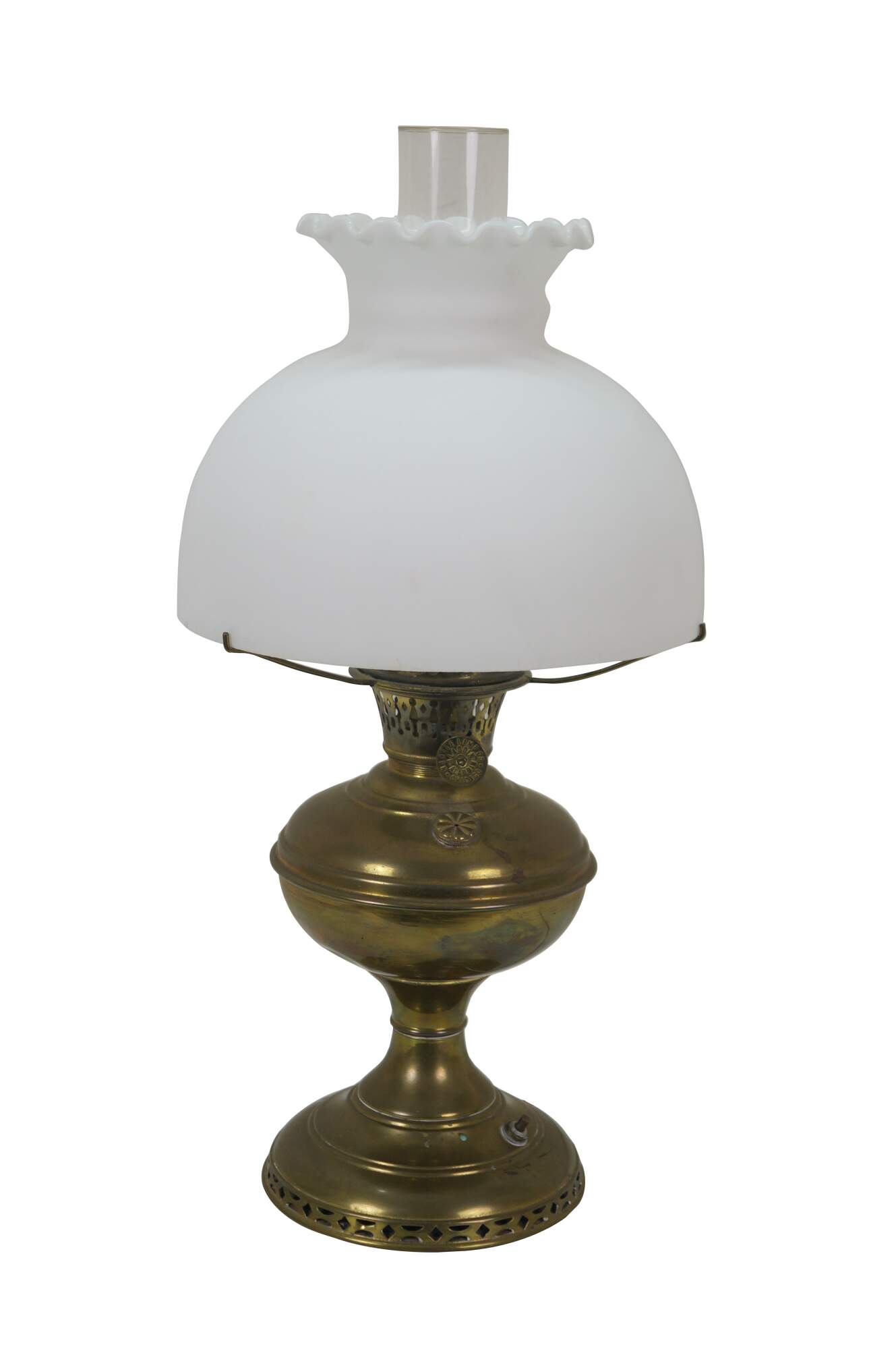 Early 20th century Mantle Lamp company Aladdin brass oil lamp with hurricane and matte milk glass shade with ruffled top. Converted to electric with push button switch.