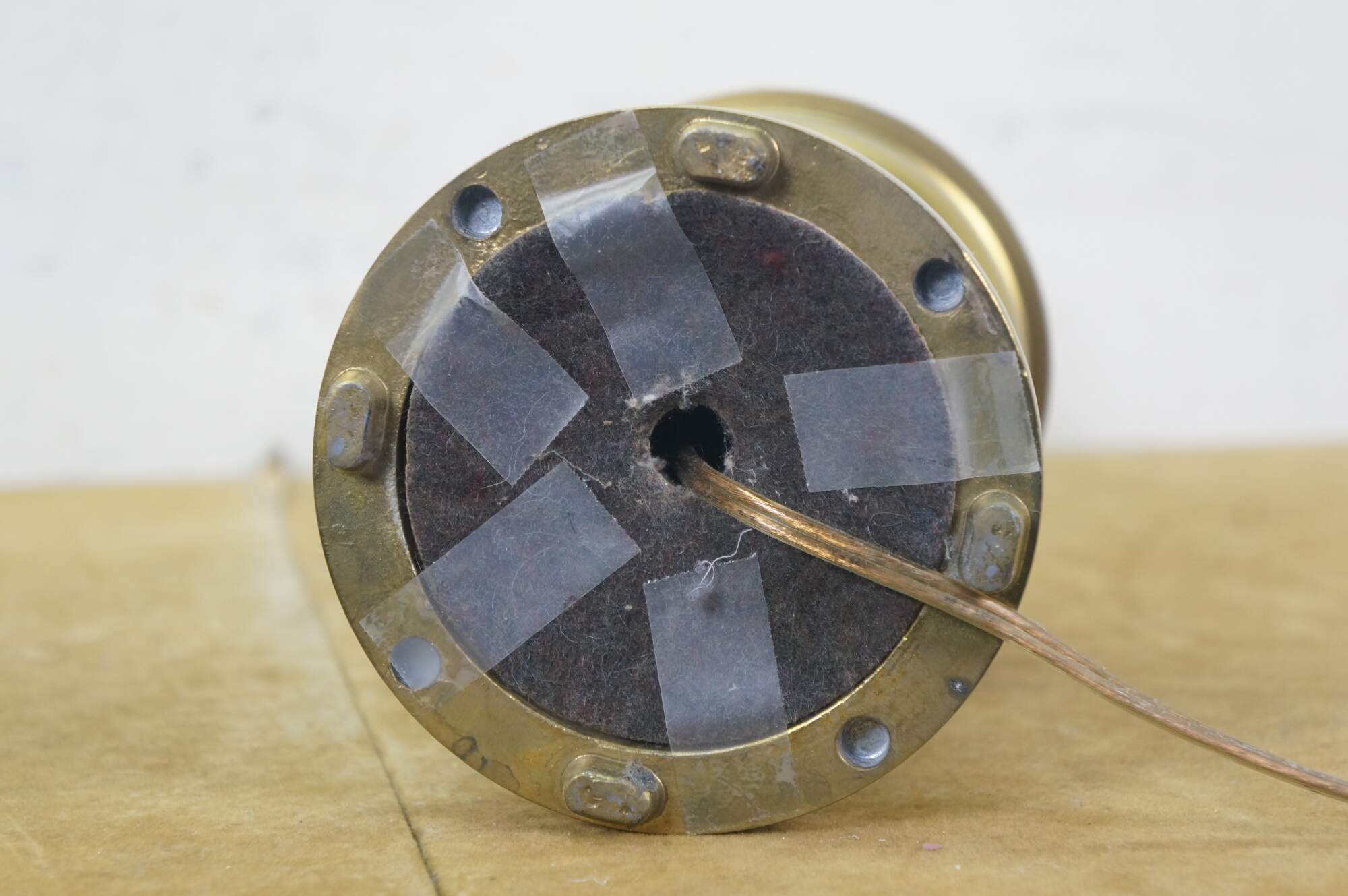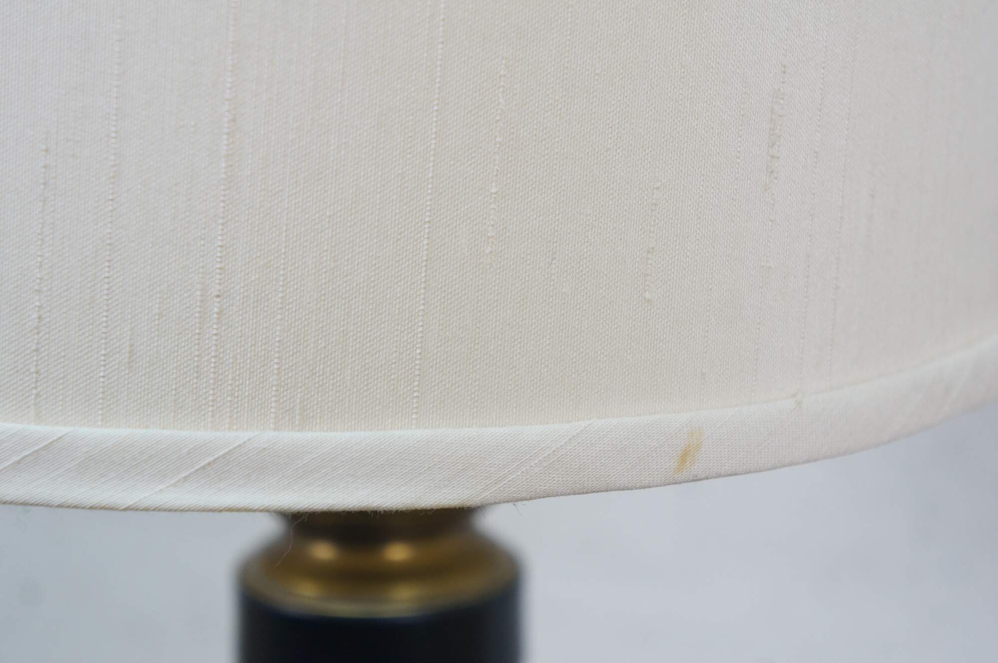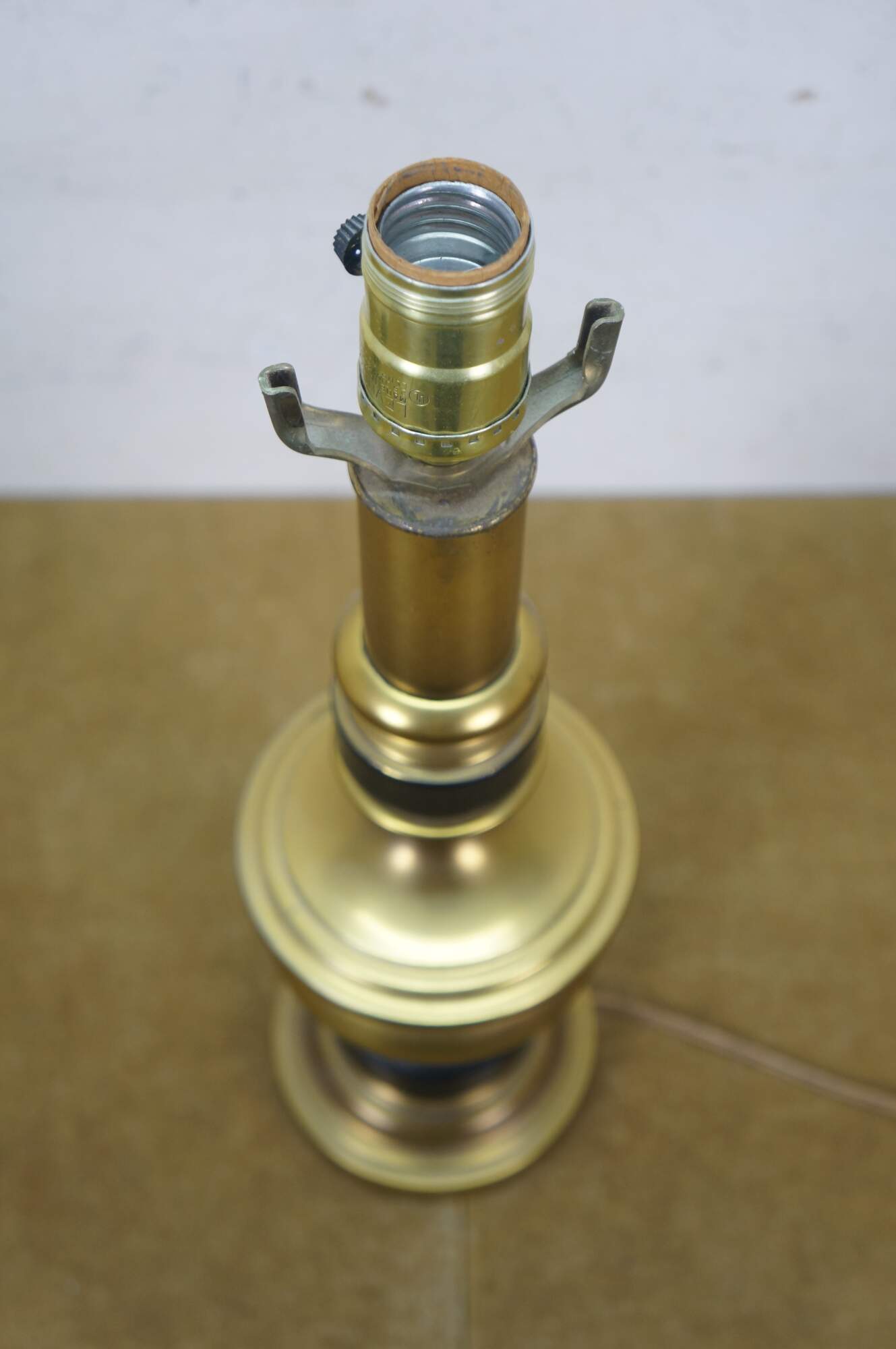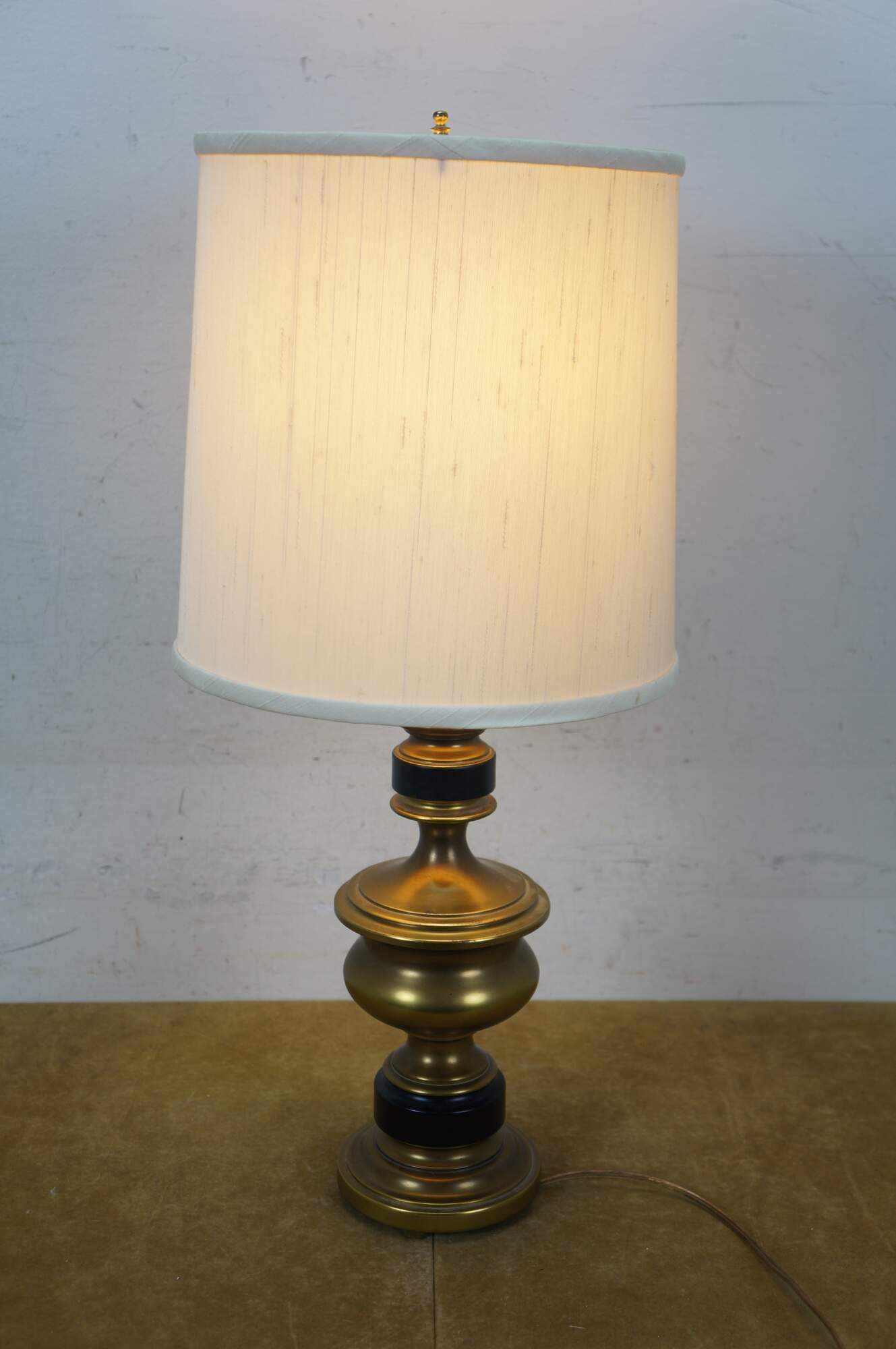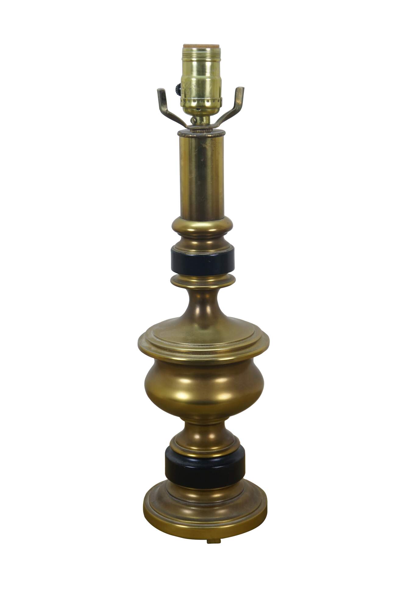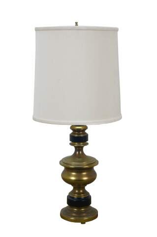 Mid to late 20th century mantel vase / trophy urn shaped brass table lamp with accents of black enameled bands. Includes harp, brass finial, and white fabric shade.