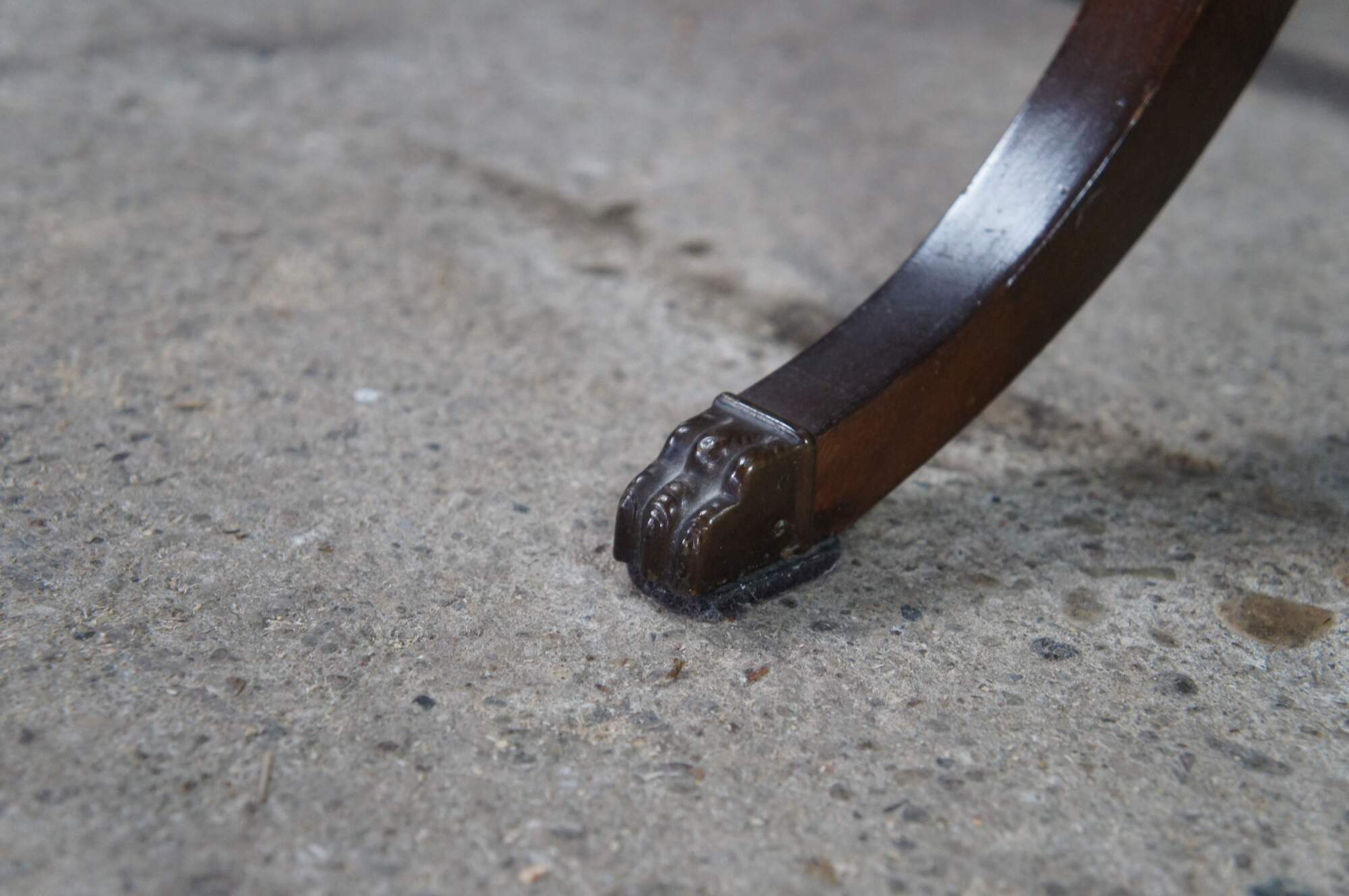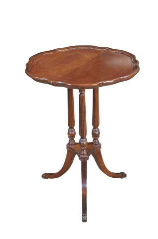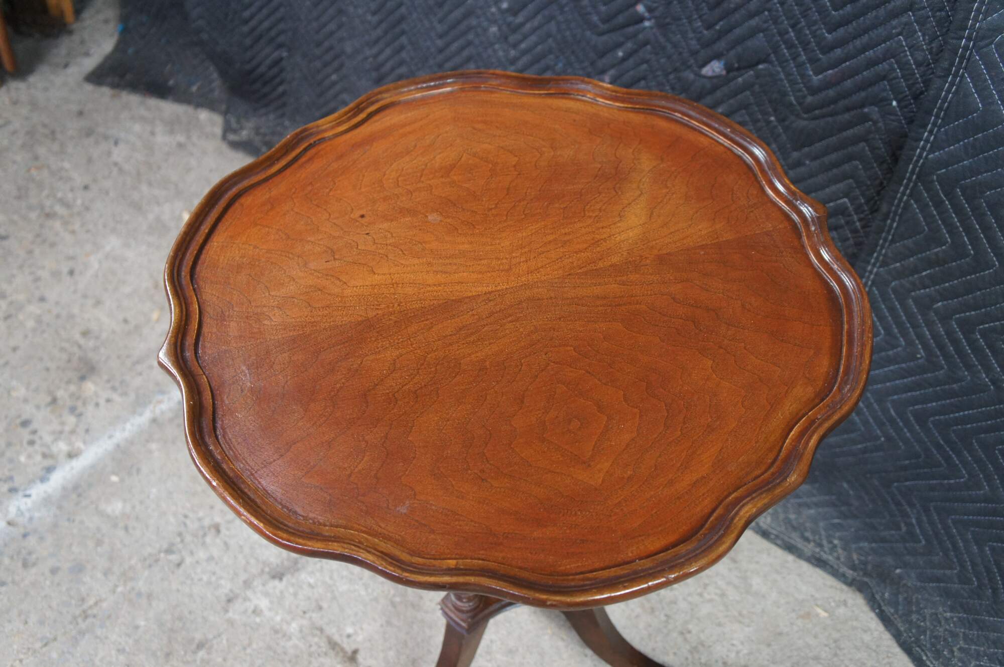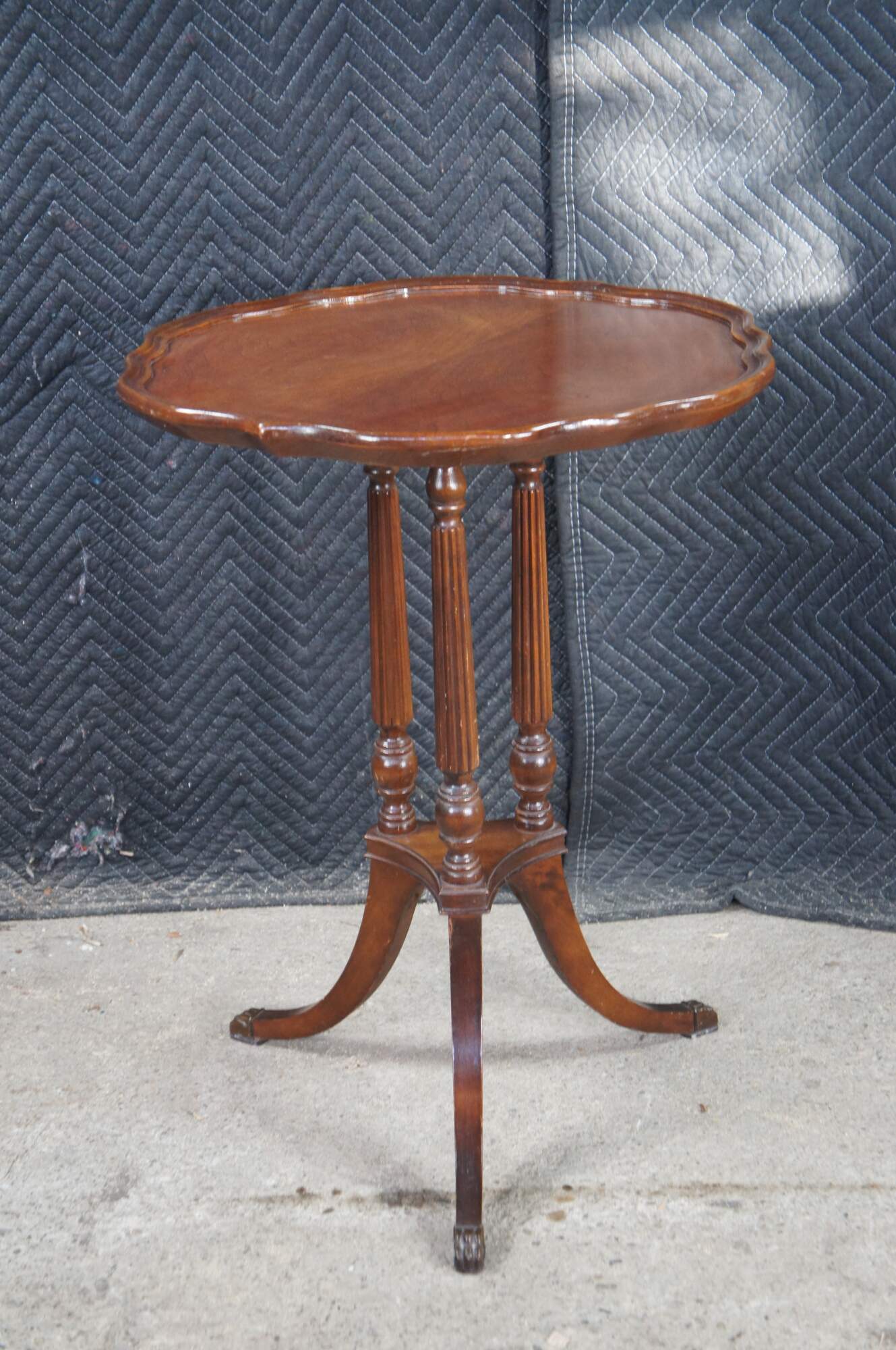 Mid Century Mersman matchbook mahogany pie crust pedestal table featuring a serpentine gallery top supported by fluted columns and flared Duncan Phyfe style legs with brass caps.