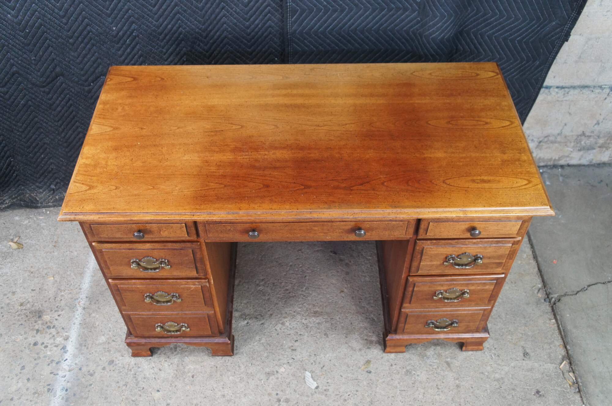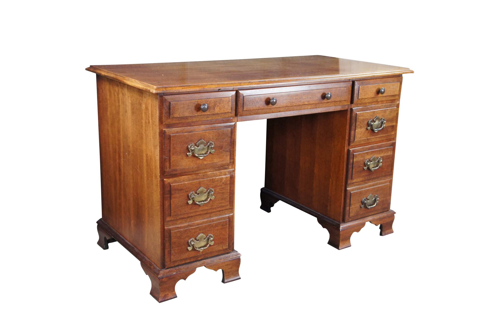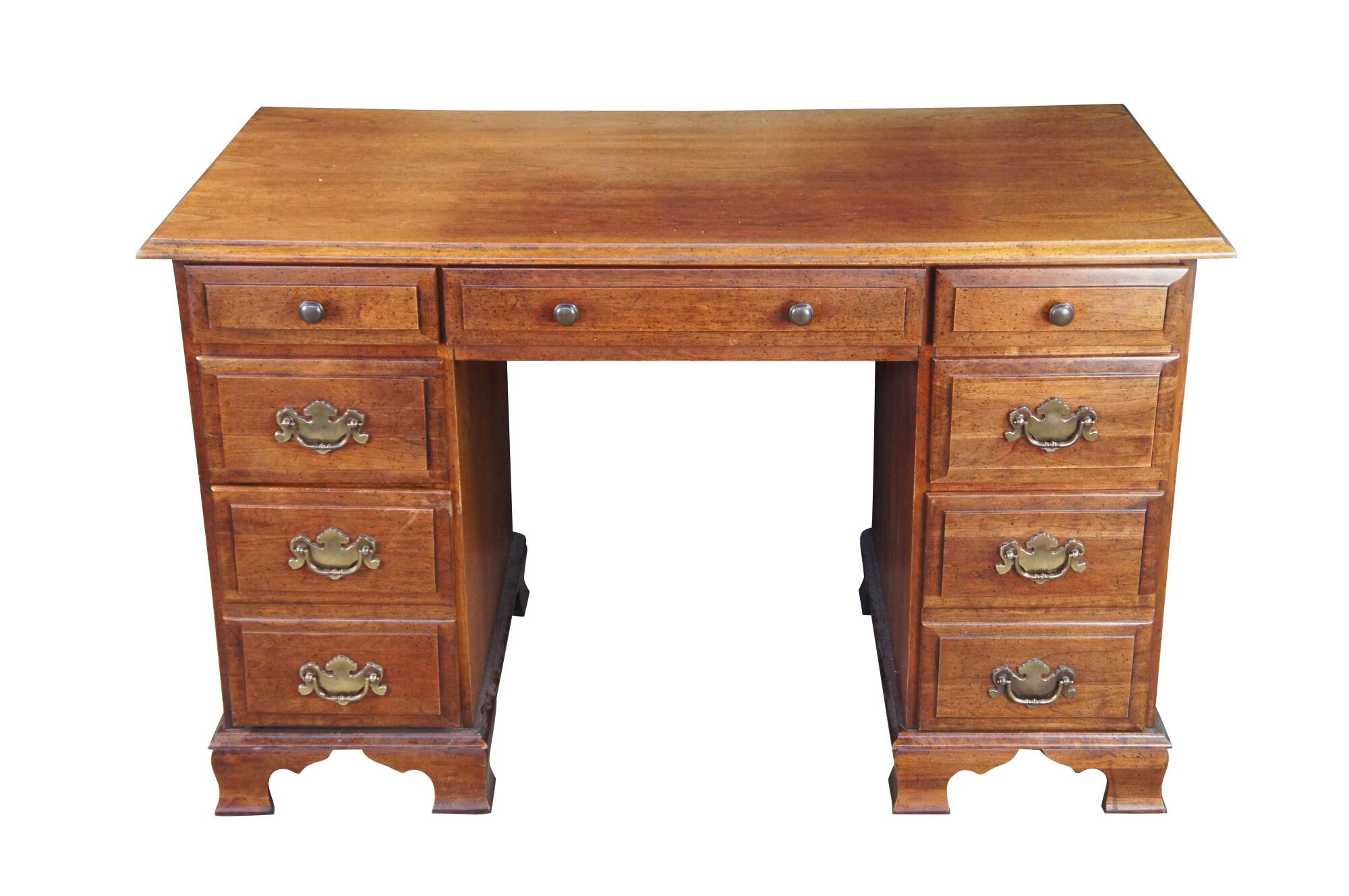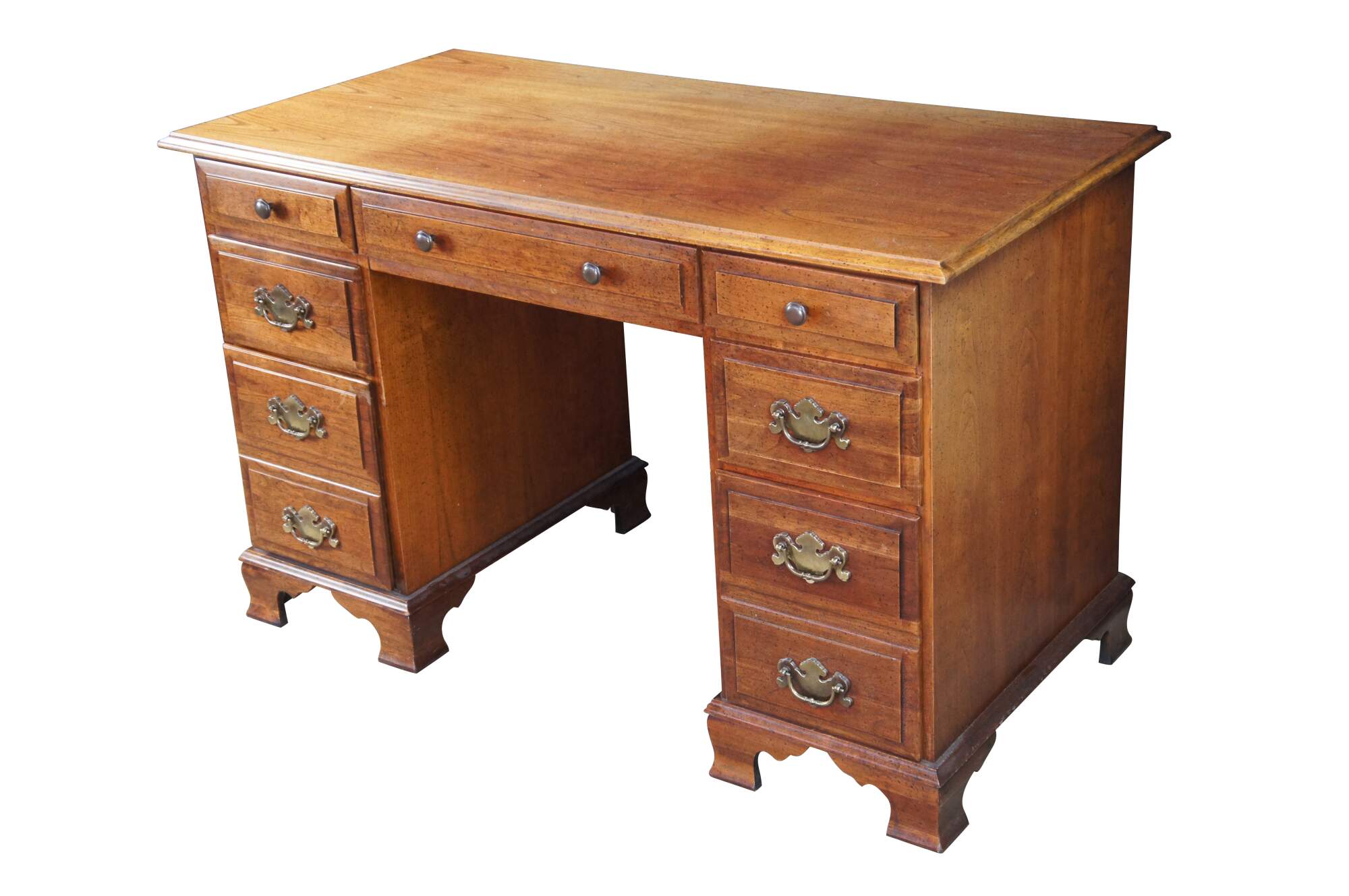 1970s Vintage kneehole writing desk. Made from cherry with colonial style brass hardware. Features seven dovetailed drawers and bracket style feet.