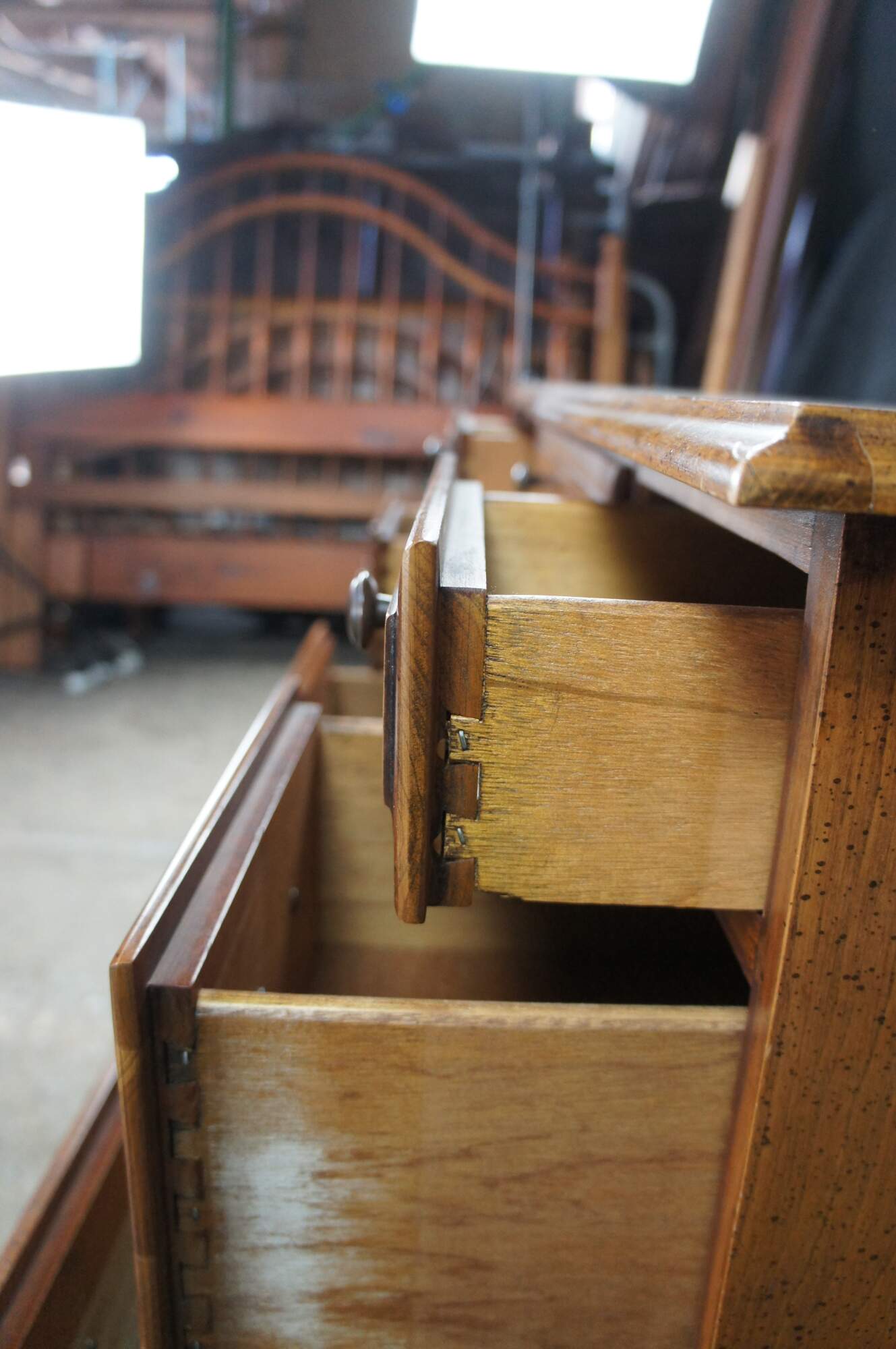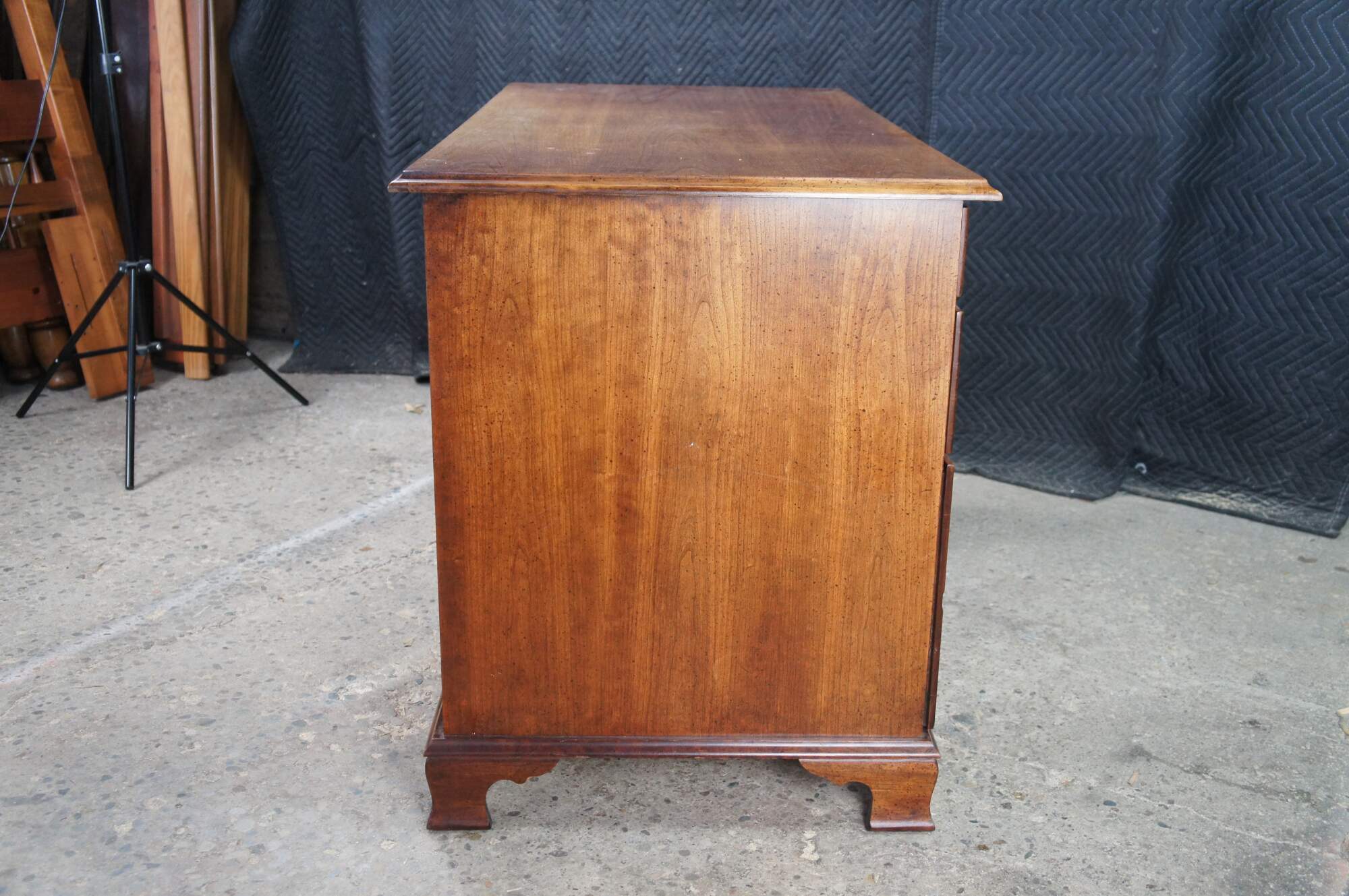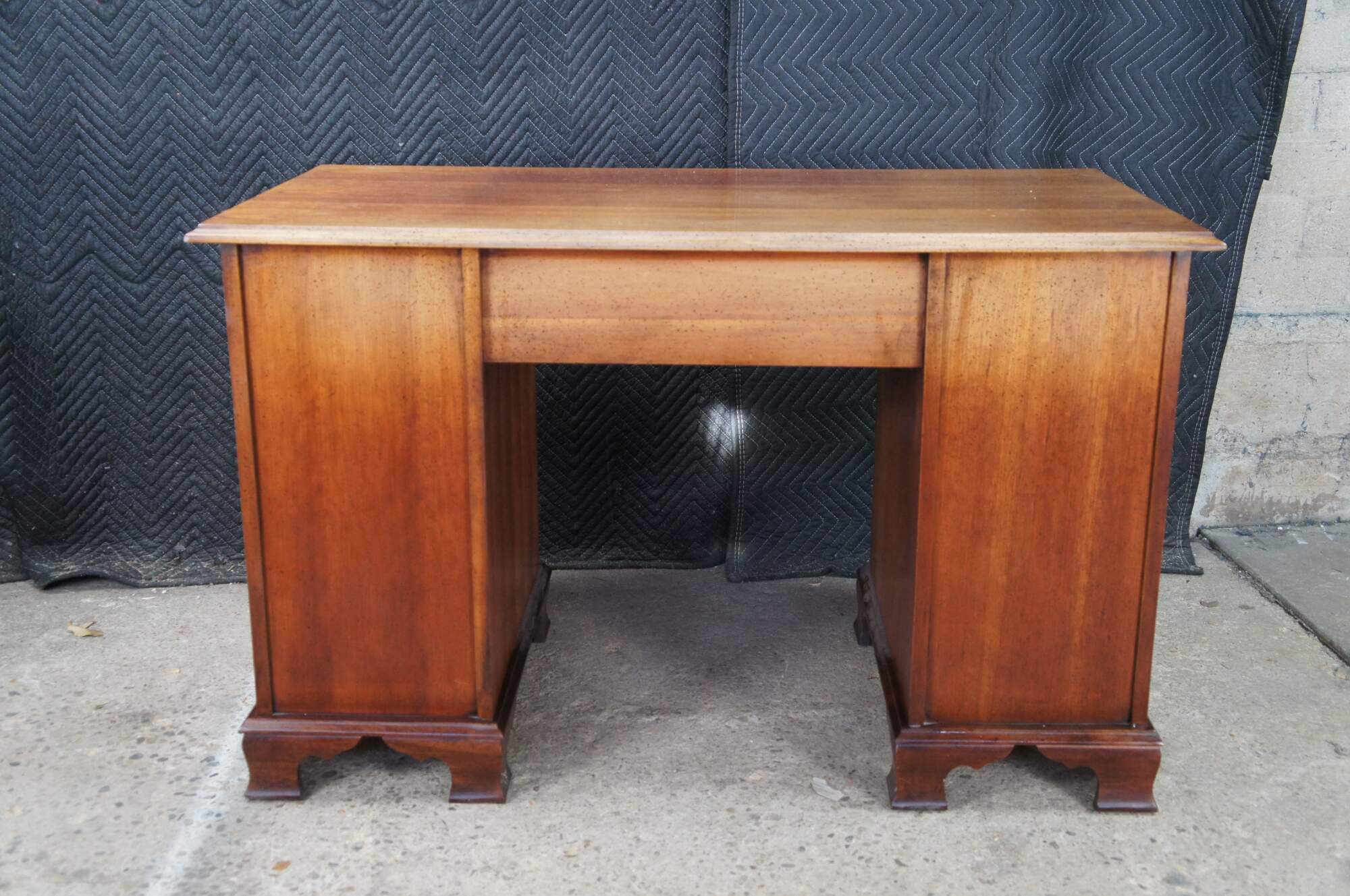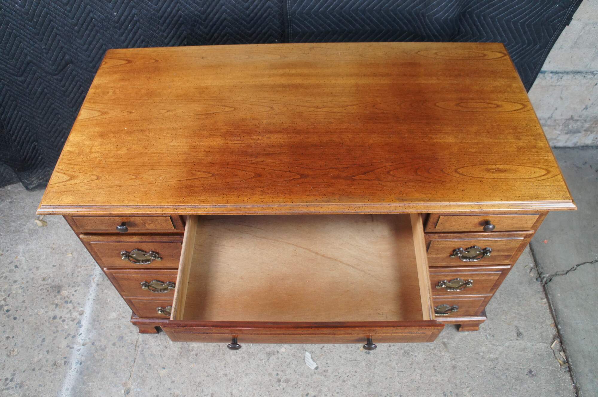 1970s Vintage kneehole writing desk. Made from cherry with colonial style brass hardware. Features seven dovetailed drawers and bracket style feet.