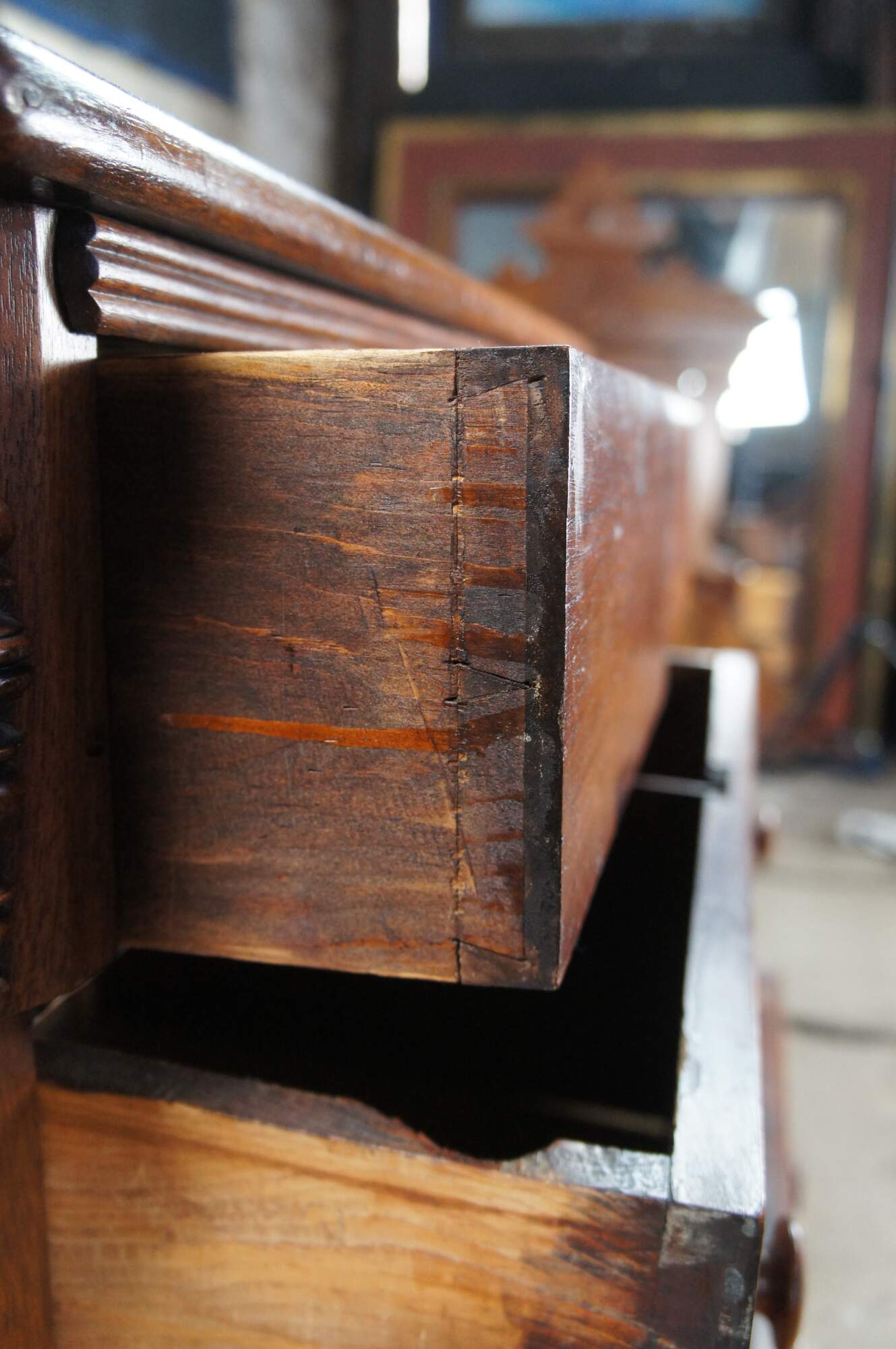 Wear and distressing from age and use, marking, fading, multiple trim pieces missing, splitting / cracking, damage mark right side, All drawers except bottom are missing locks.