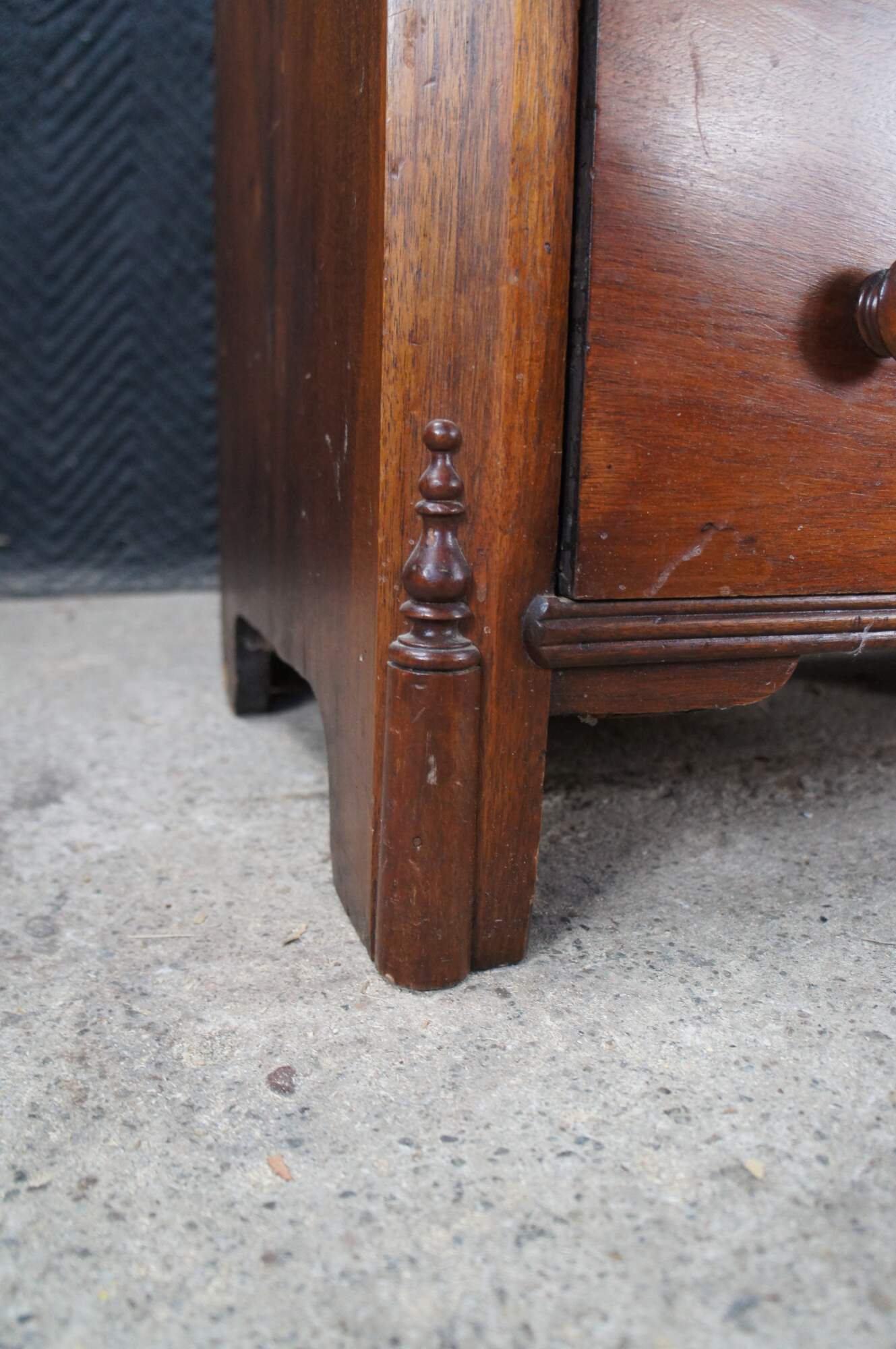 Antique 19th Century American Victorian chest of drawers, dresser or Washtand. Features a rectangular for made from walnut and other select solids with a two over two configuration. Drawers are hand dovetailed with wooden turned handles and inset escutcheon plates. Dresser stiles features applied and cut spindles.
