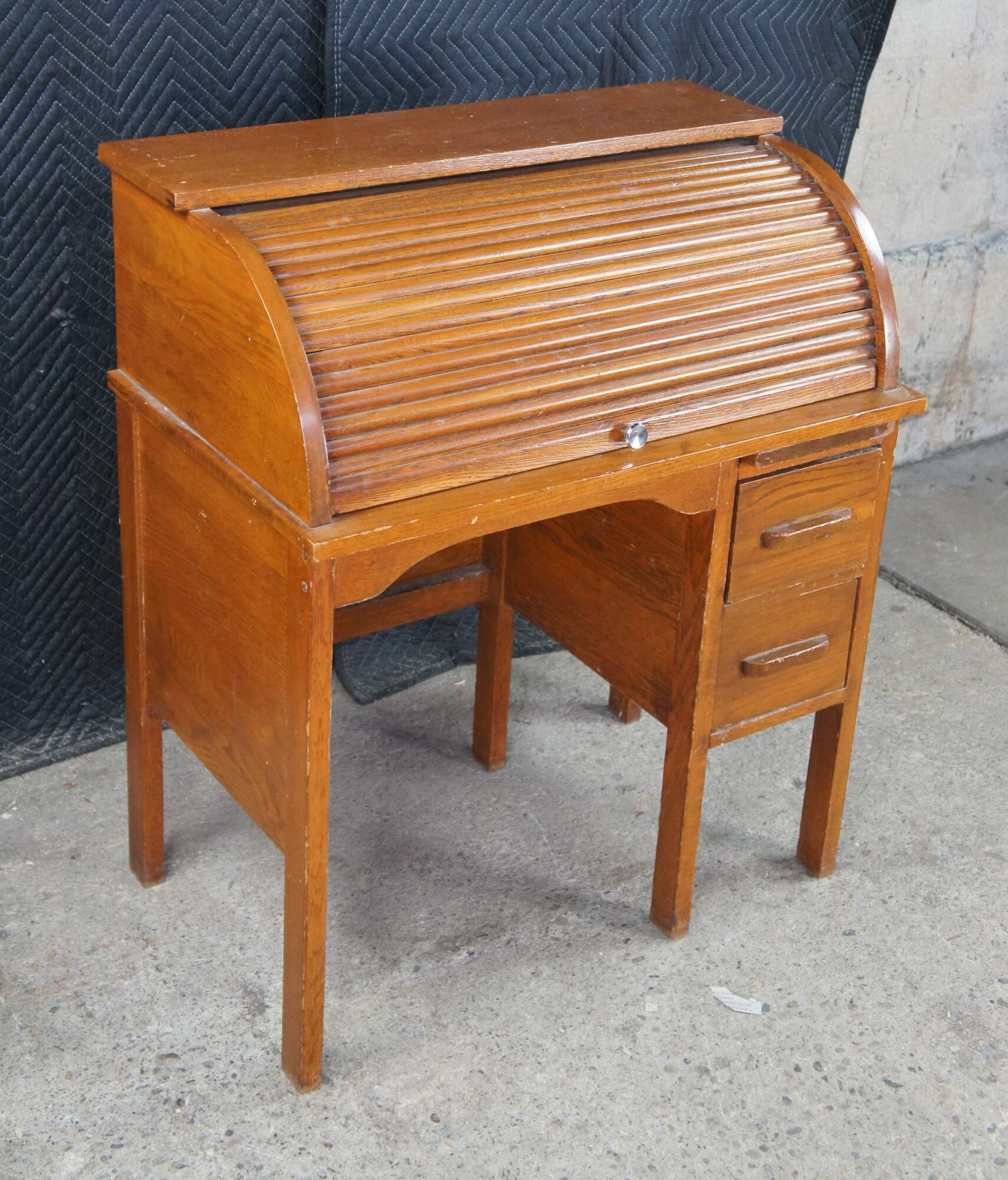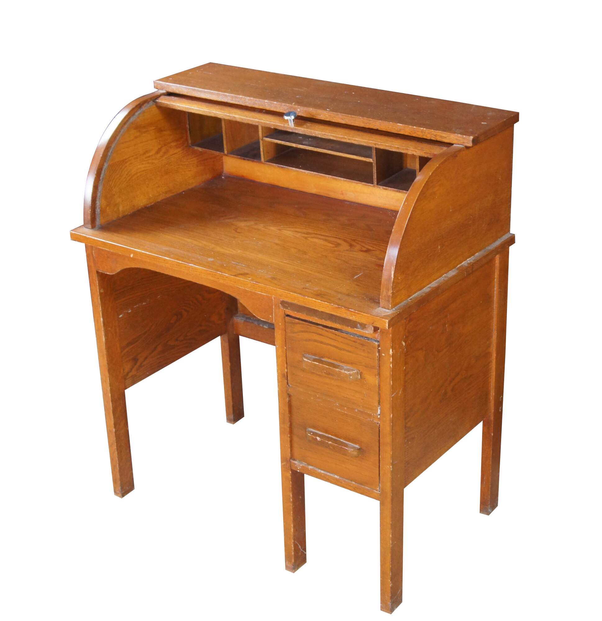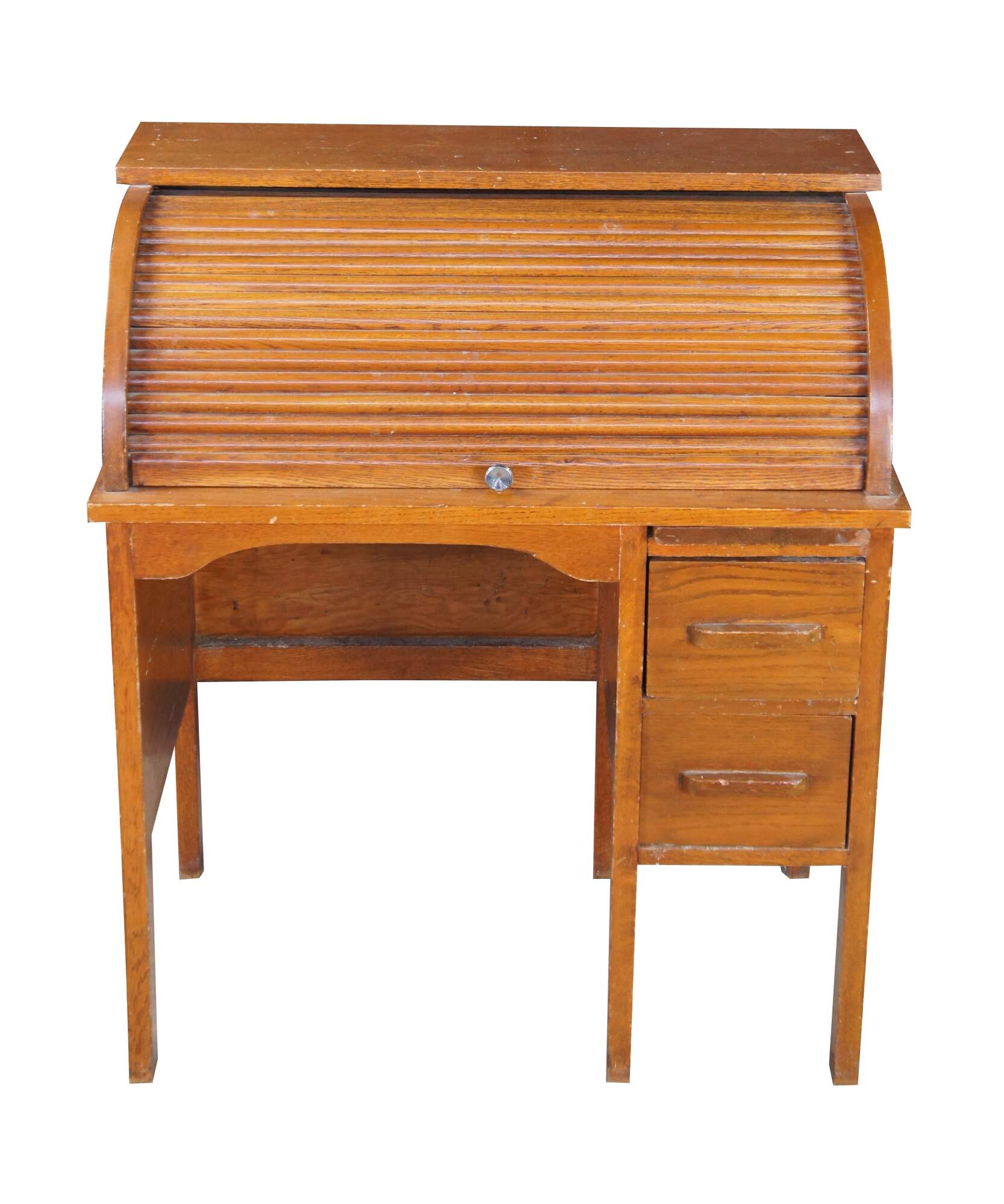 Victorian childs roll top writing desk featuring two drawers, a writing slide, a half cylinder roll top and interior cubbies.