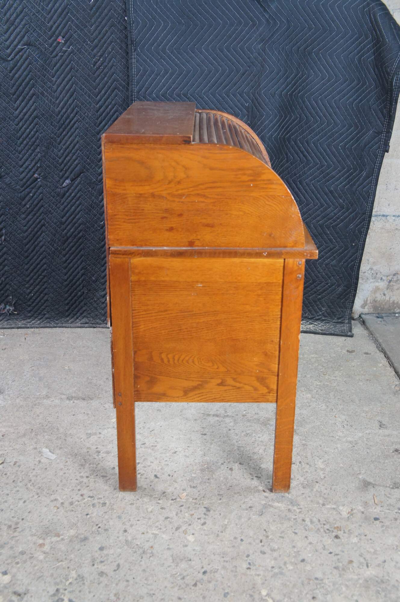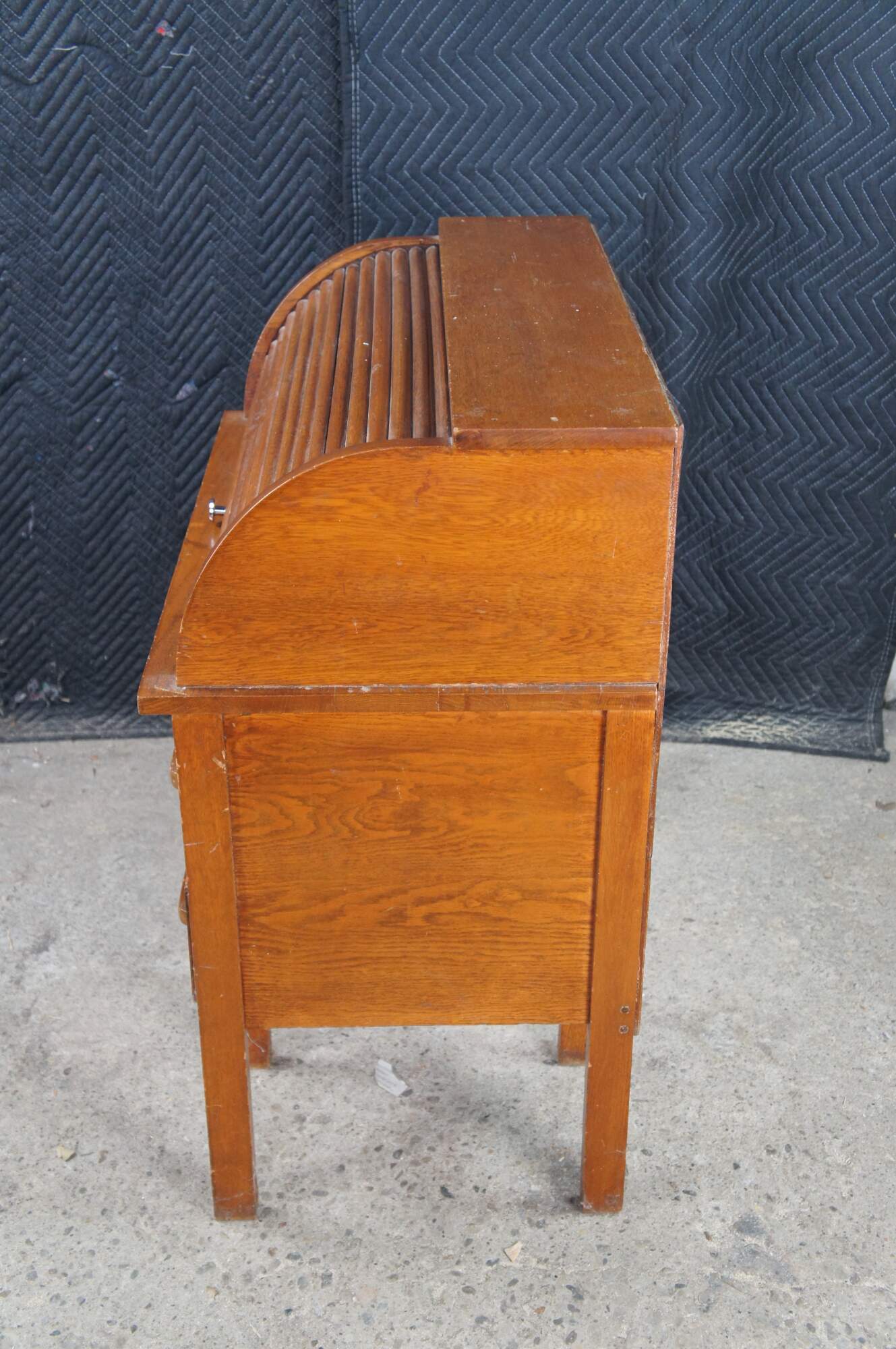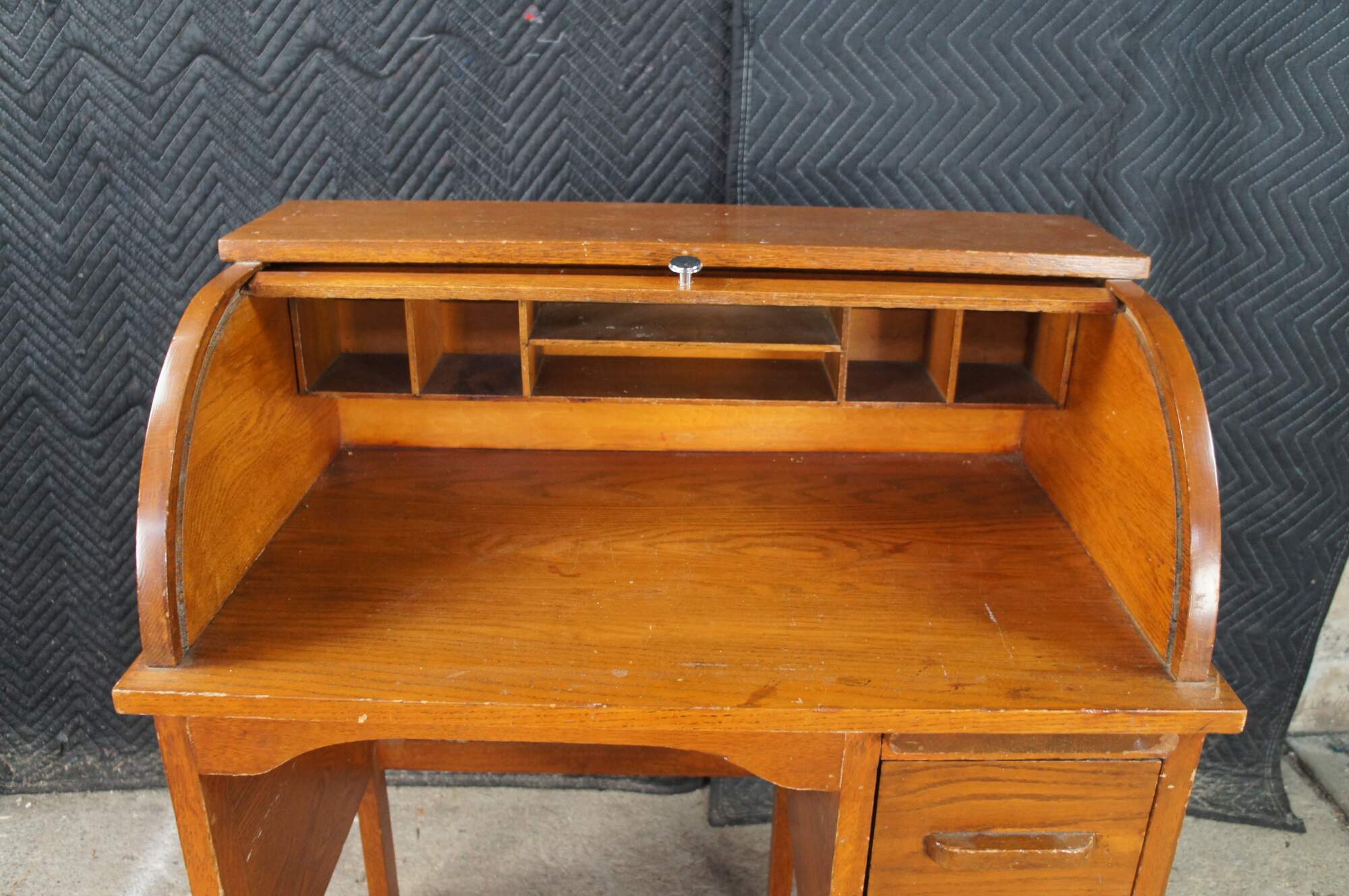 Victorian childs roll top writing desk featuring two drawers, a writing slide, a half cylinder roll top and interior cubbies.
