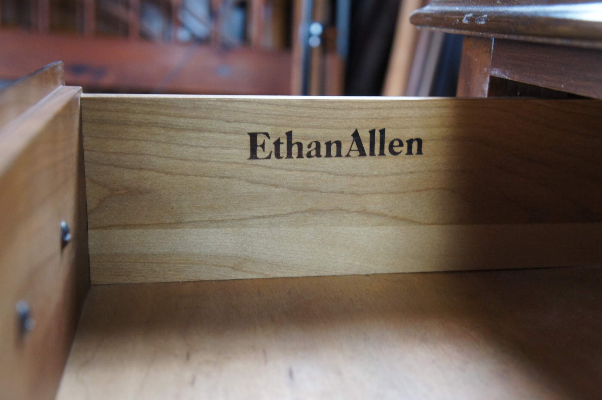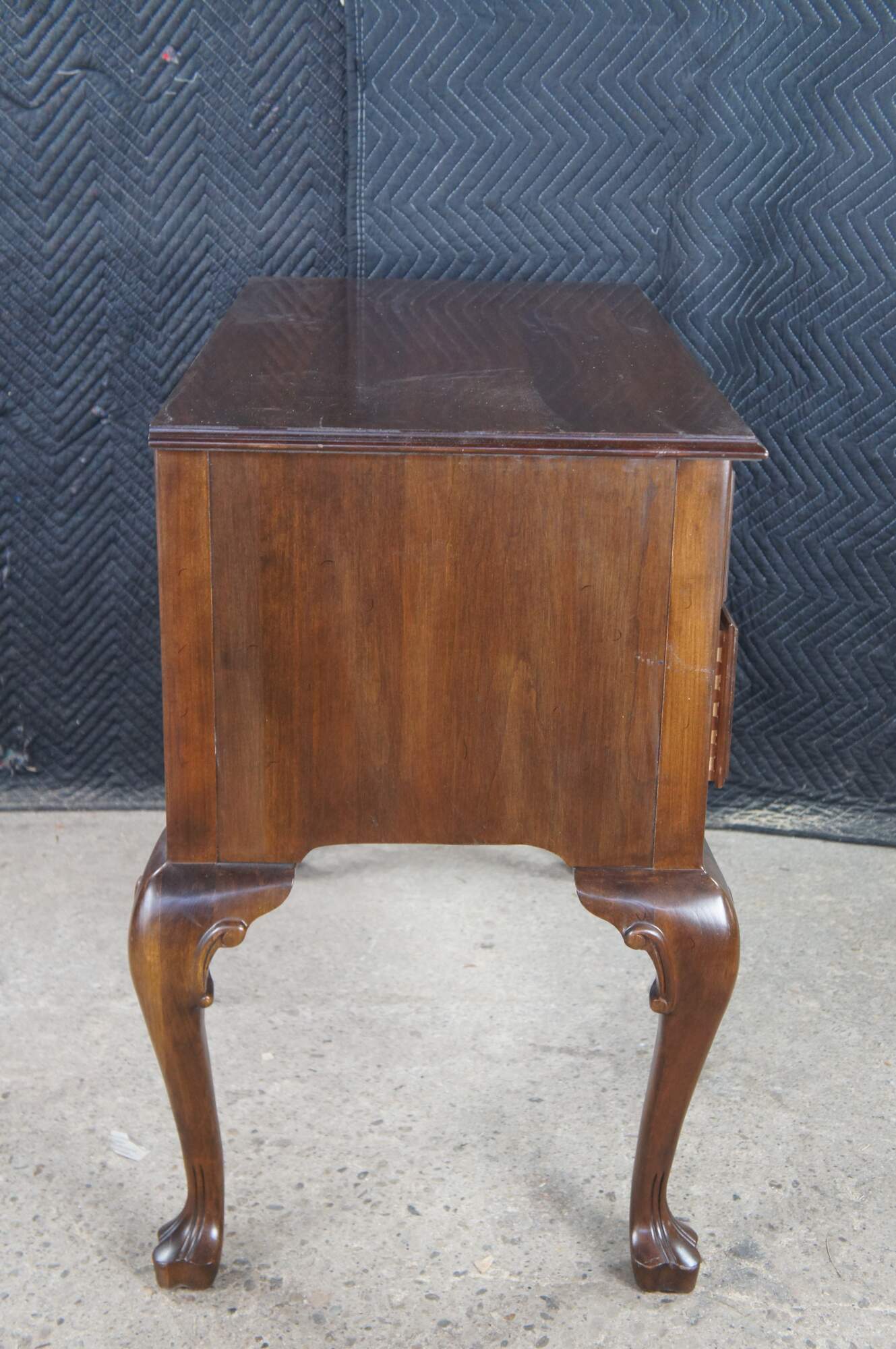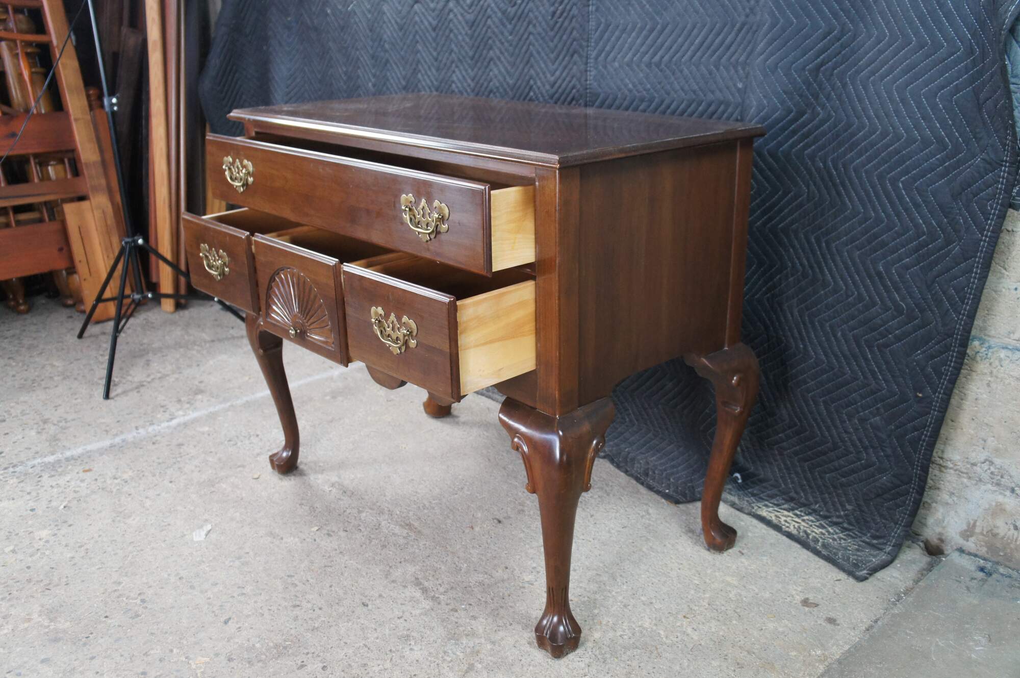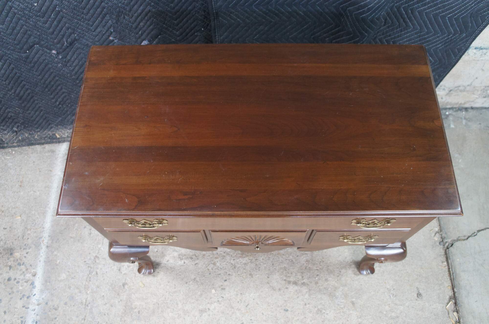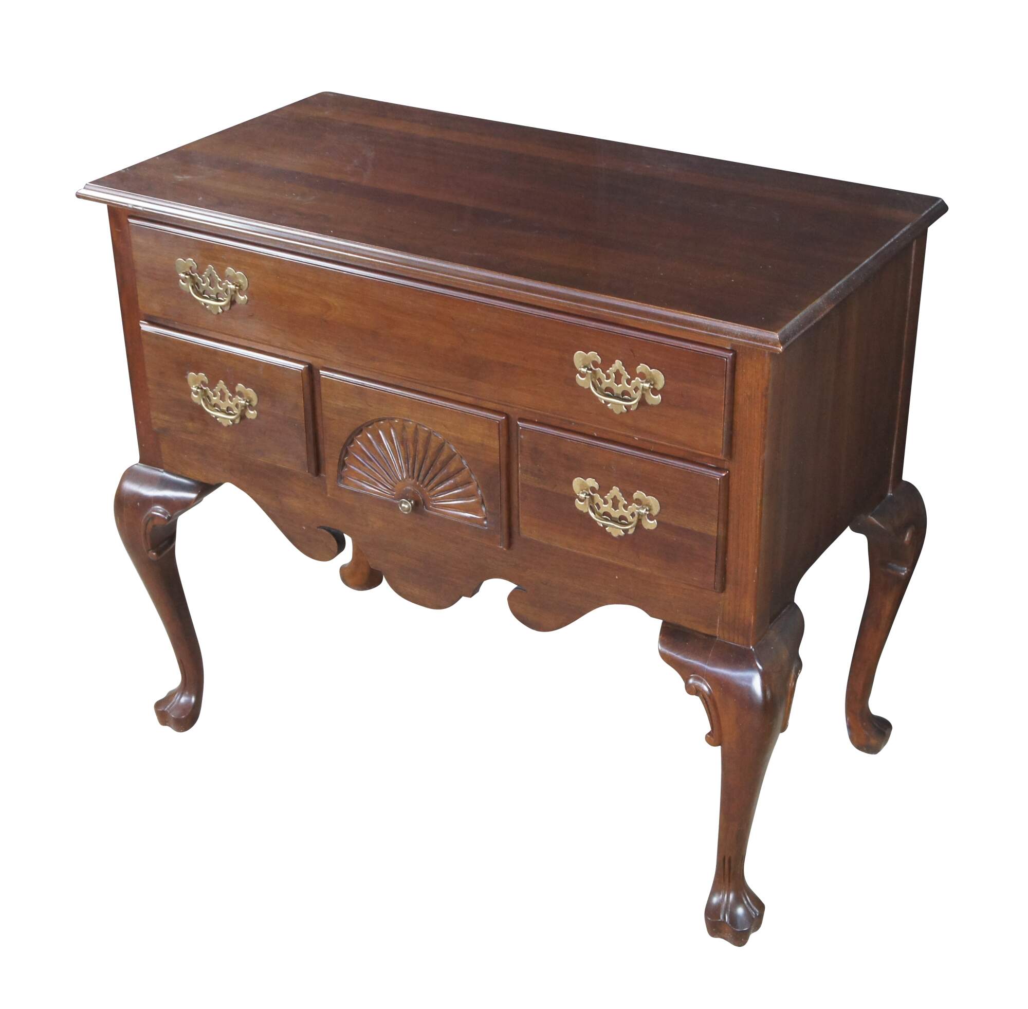 Vintage Ethan Allen Georgian Court Collection Lowboy, #11-9205, Circa 03-04-1980. Features a rectangular form designed in English Georgian Styling. Made from cherry with four dovetailed drawers with colonial brass style hardware. Central drawer has a fan carved at the center. The chest has a serpentine cut lower apron flanked by cabriole legs leading to trifid feet.