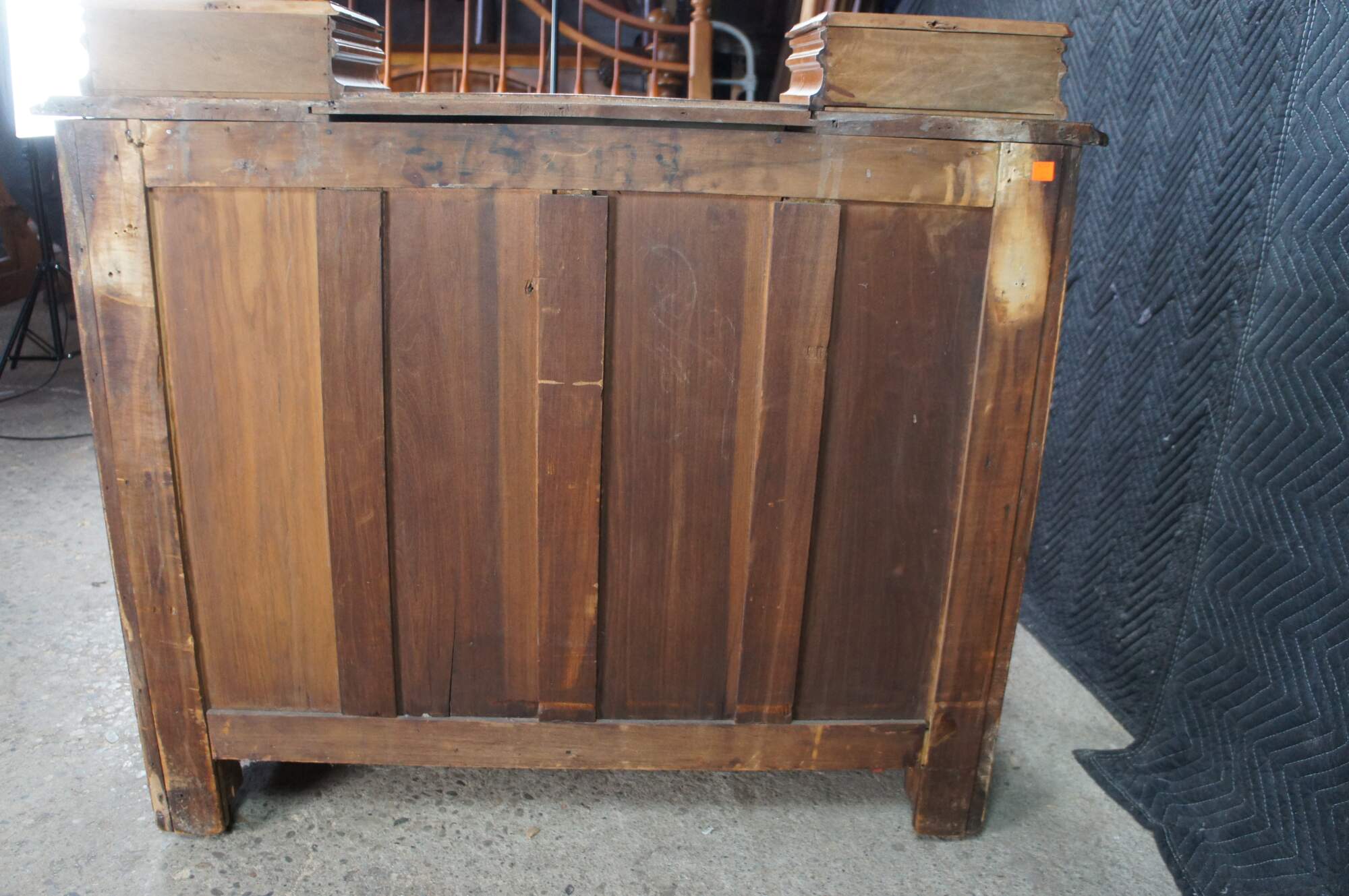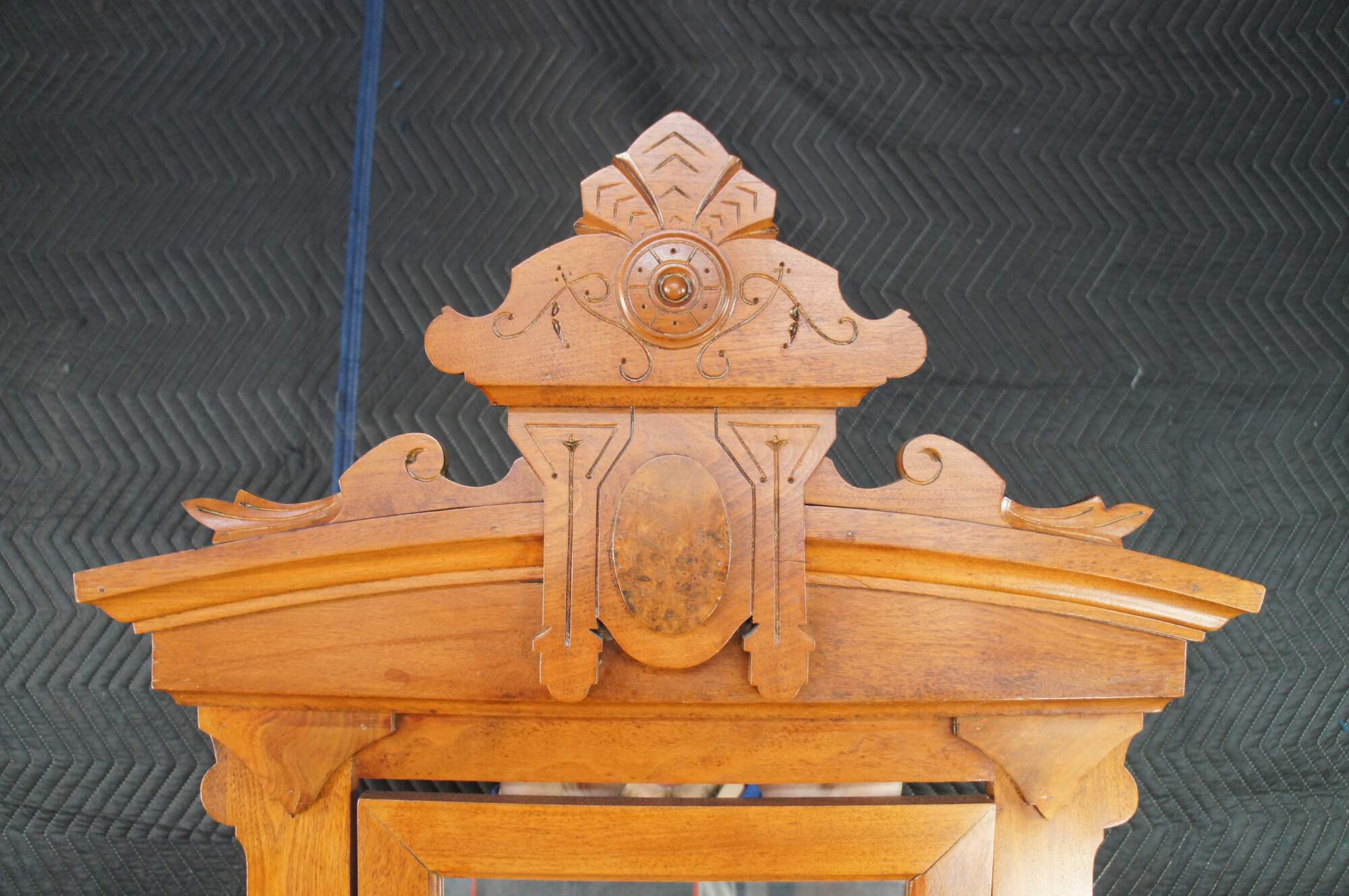 A beautiful Late Victorian Eastlake Dresser and Mirror, circa 1880. The case is made from walnut with three lower drawers featuring burled front molding, brass hardware and Charles Knapp Joinery. The mirror portion showcases beautiful Eastlake carved molding, an adjustable mirror flanked by corbel shelves and glove boxes set around a marble insert at the bases.