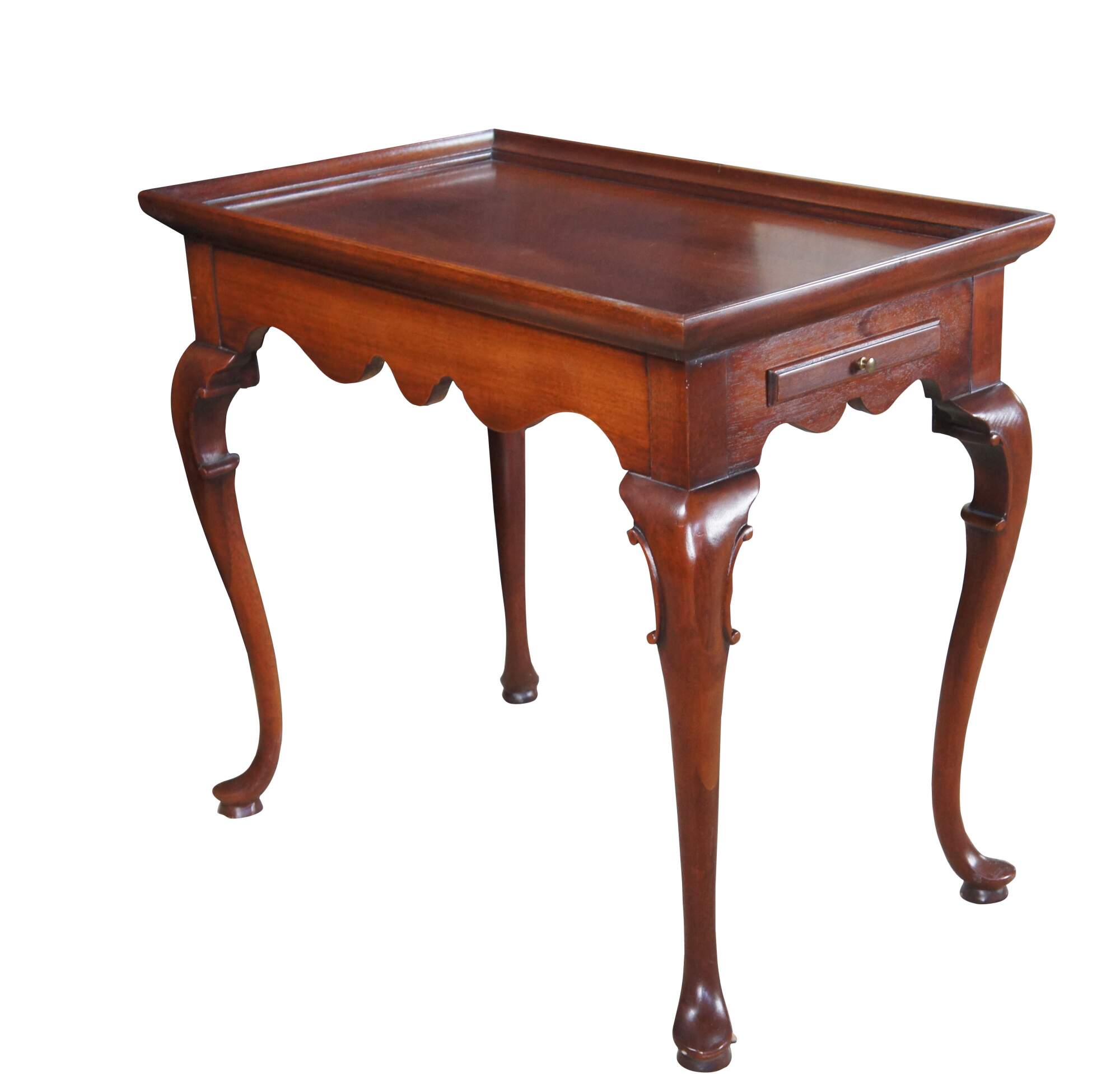 Vintage solid mahogany Queen Anne style tea table or side table, including graceful cabriole legs with slipper feet, serpentine apron and a raised gallery top. The table includes two pull out trays (often called candle slides).