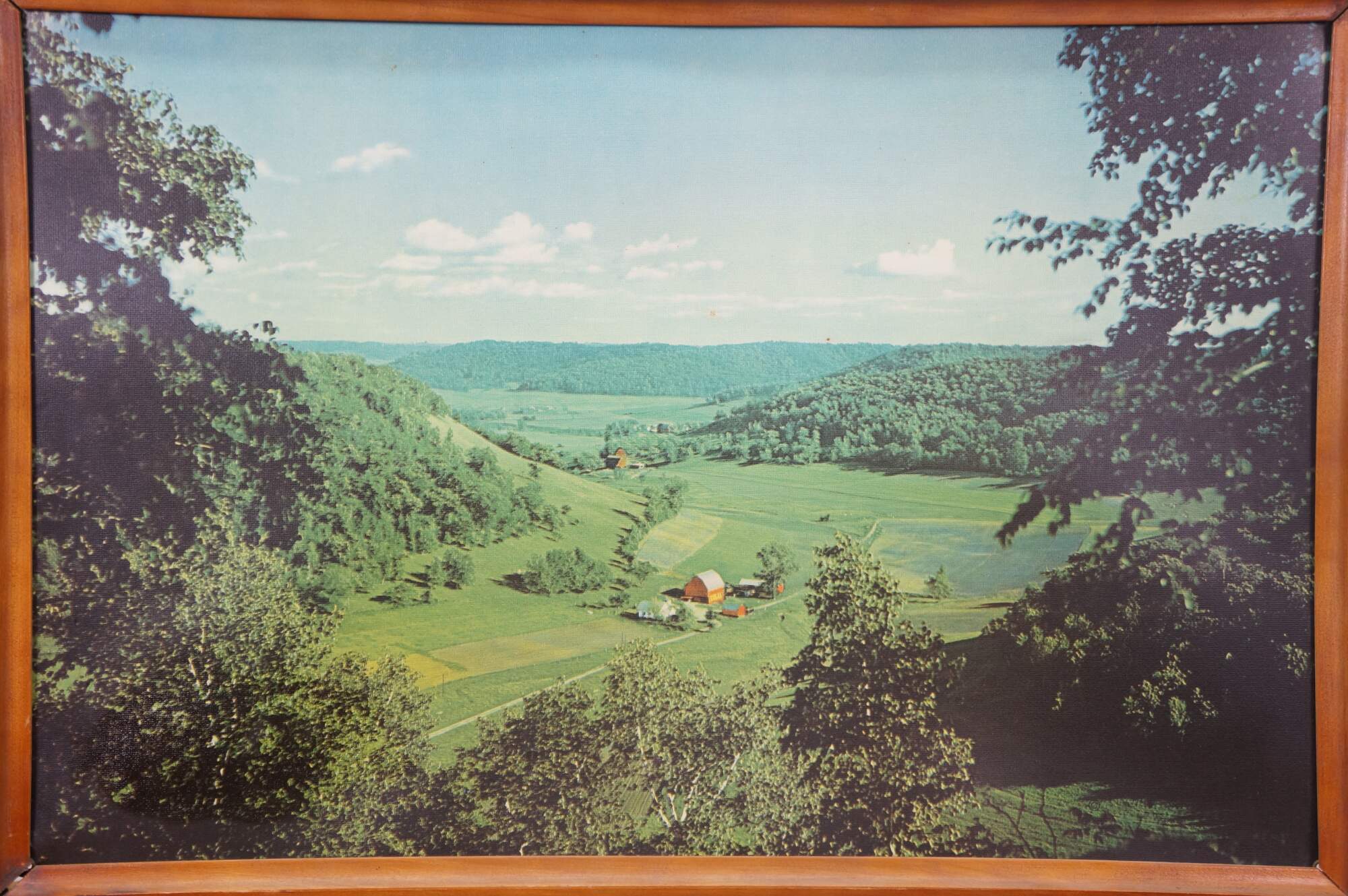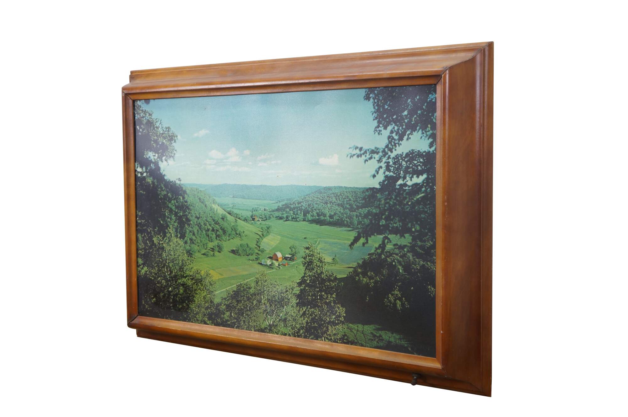 Mid century Helmscene illuminated / light up / backlit country landscape scene with barns and farmhouses in the valley. Made by Helmscene in Grand Rapids Michigan.