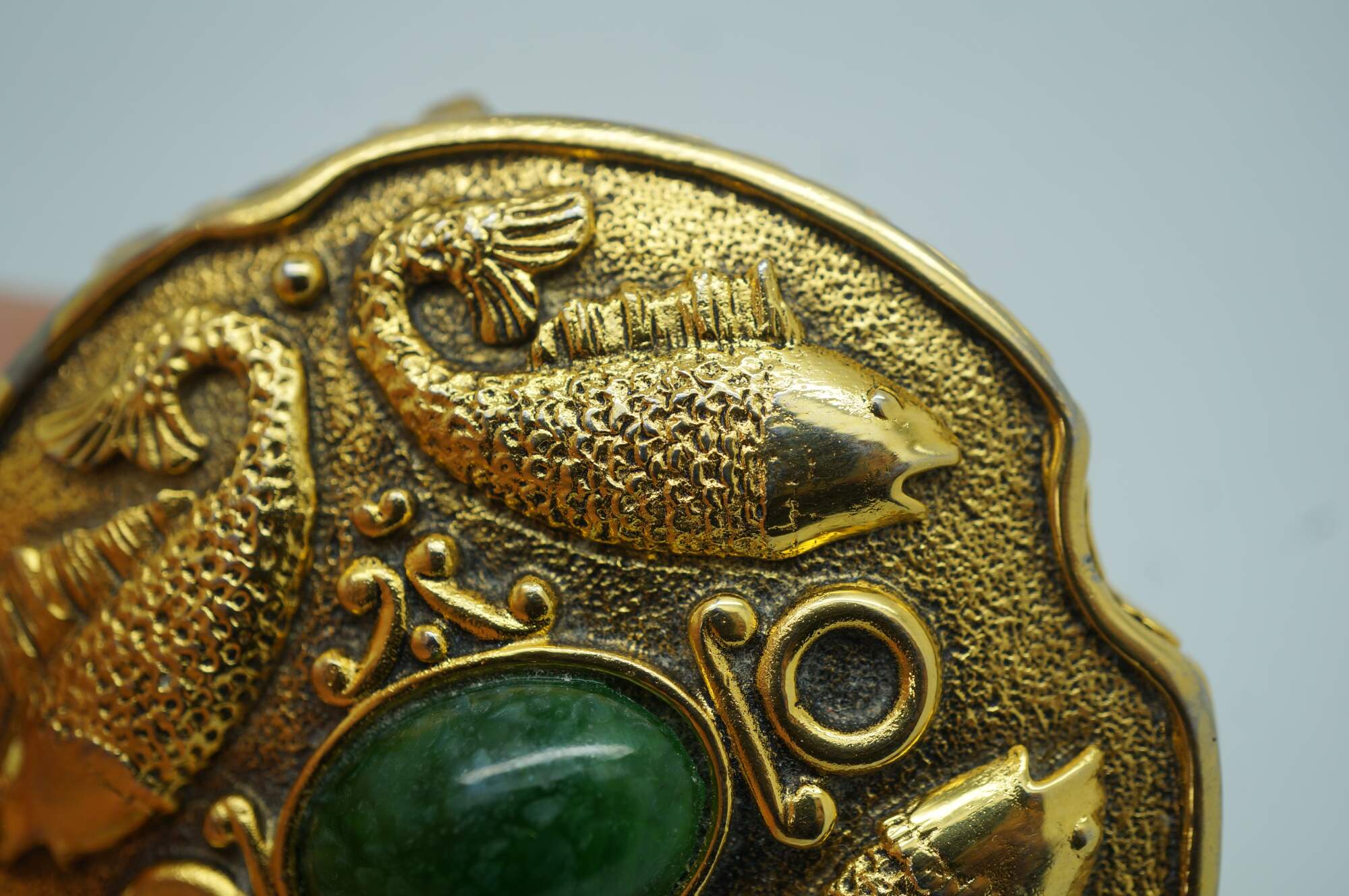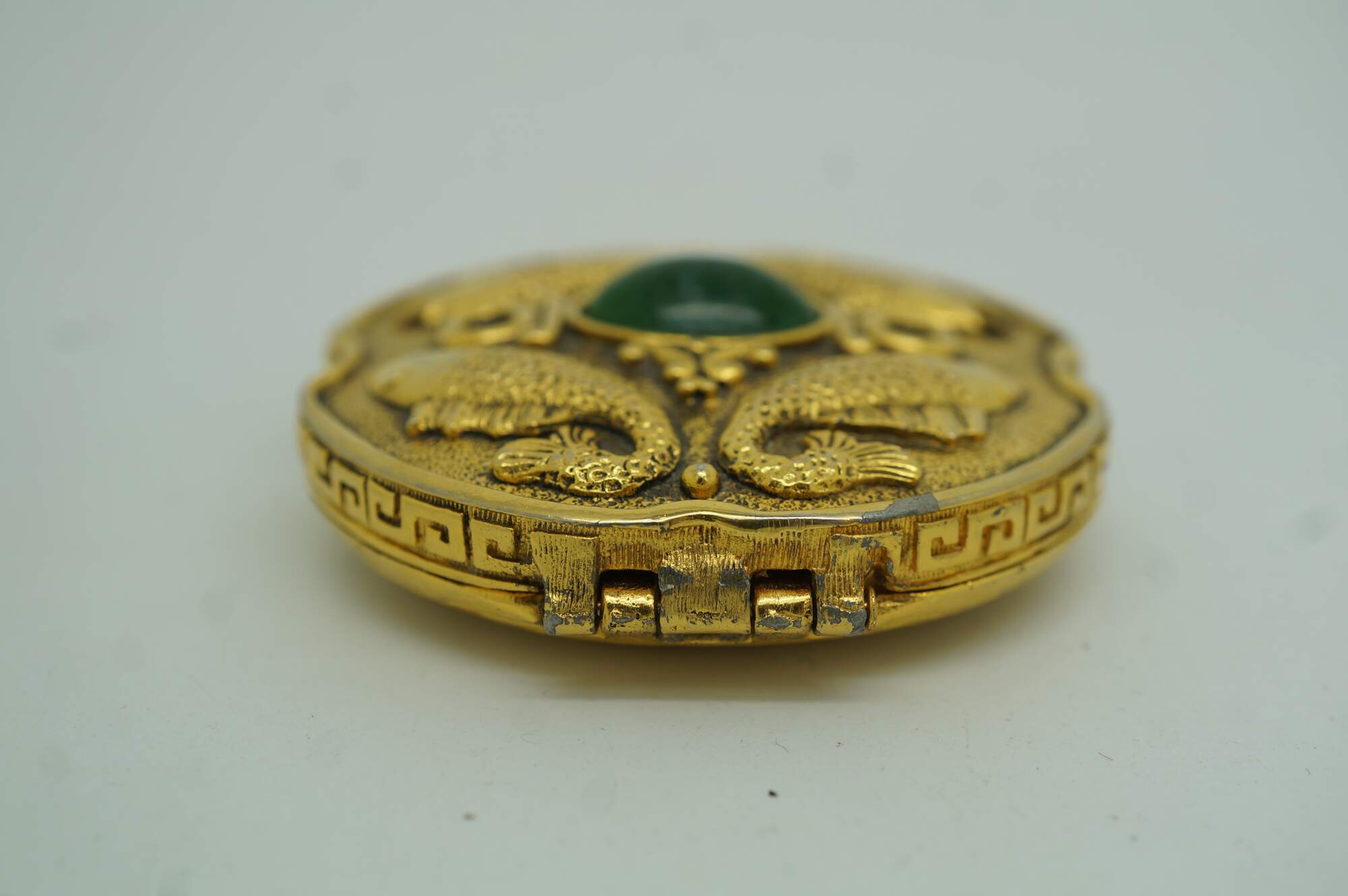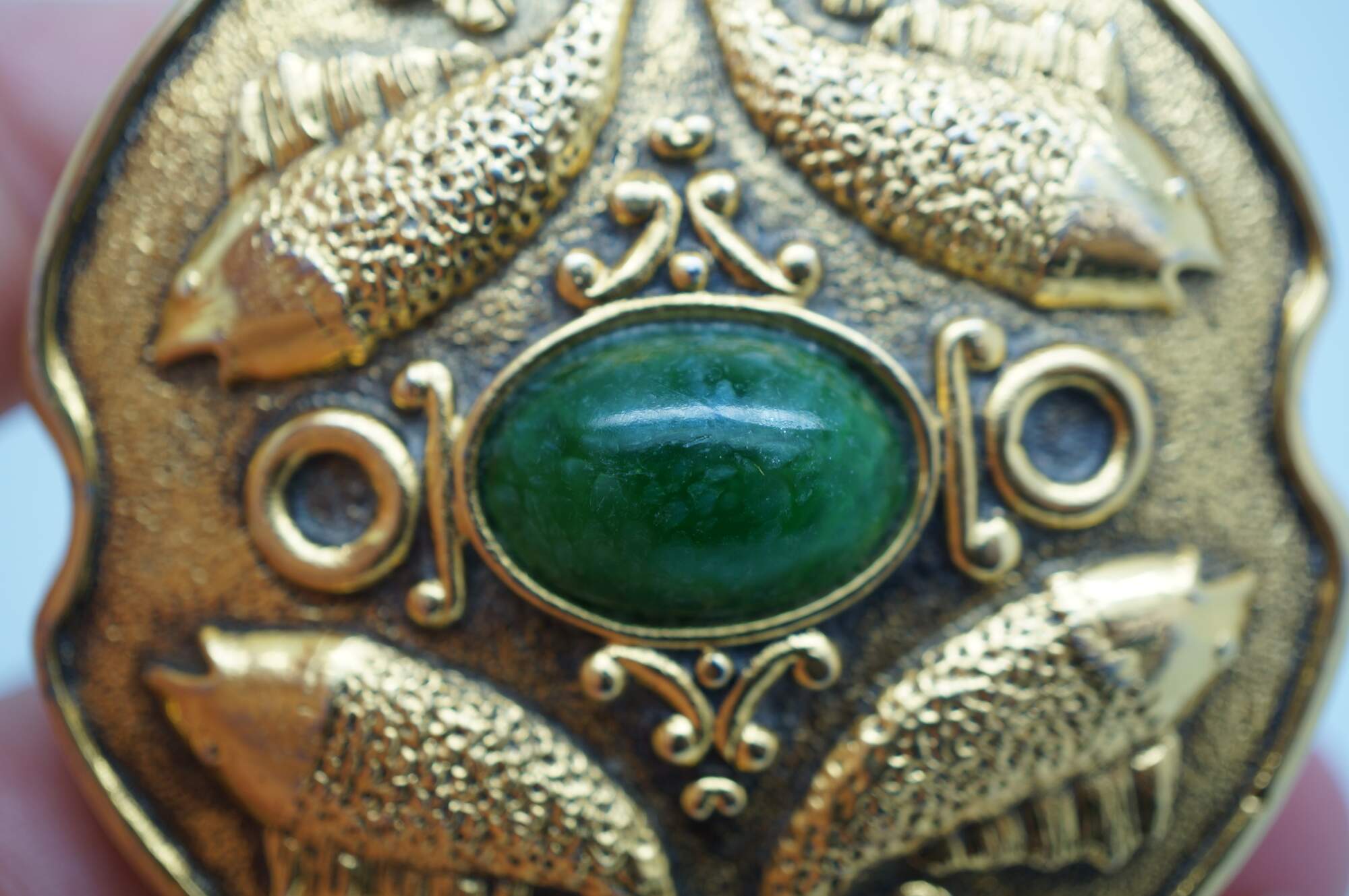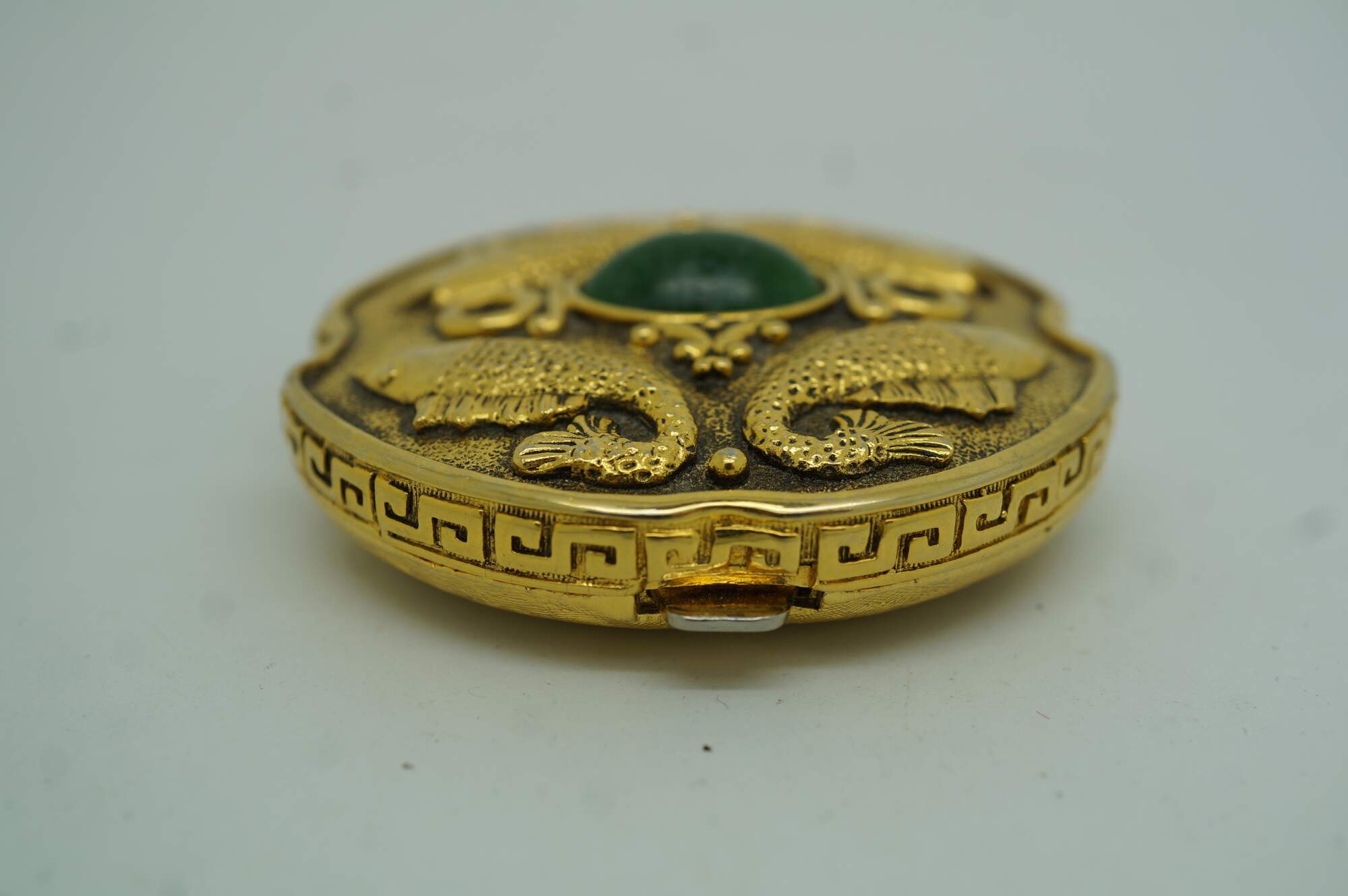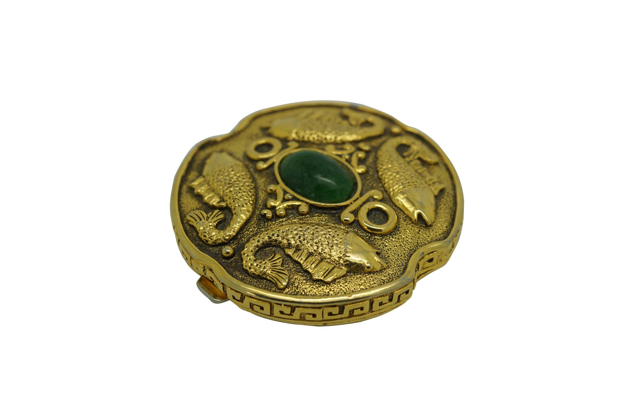 Mid century 1960s Max Factor "Golden Seas" powder puff mirror compact. The compact is gold-toned and features an embossed greek key design and four Koi fish surrounding a faux green jade stone.