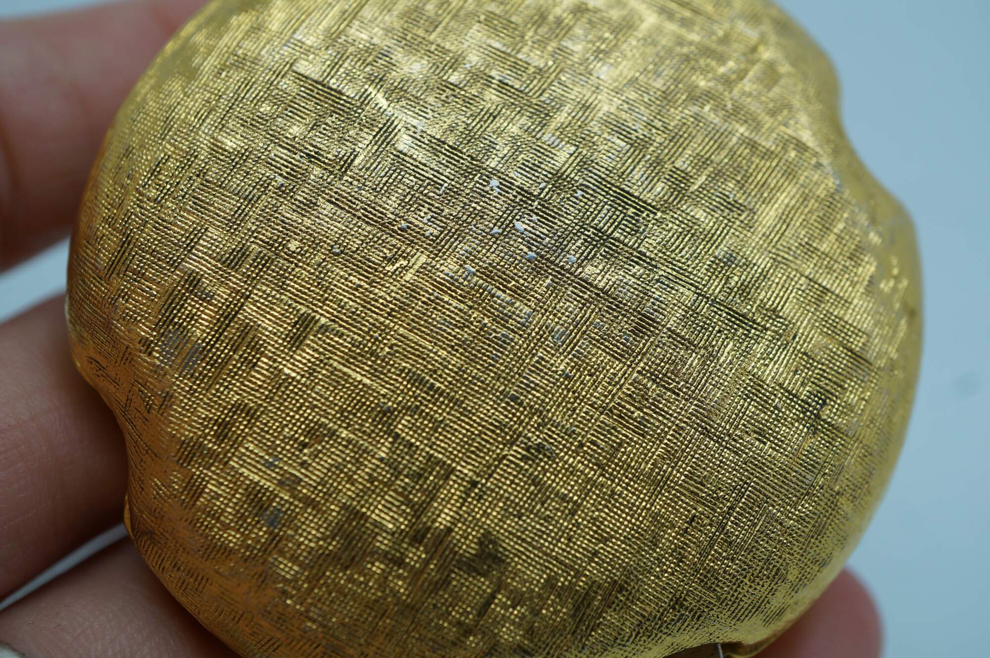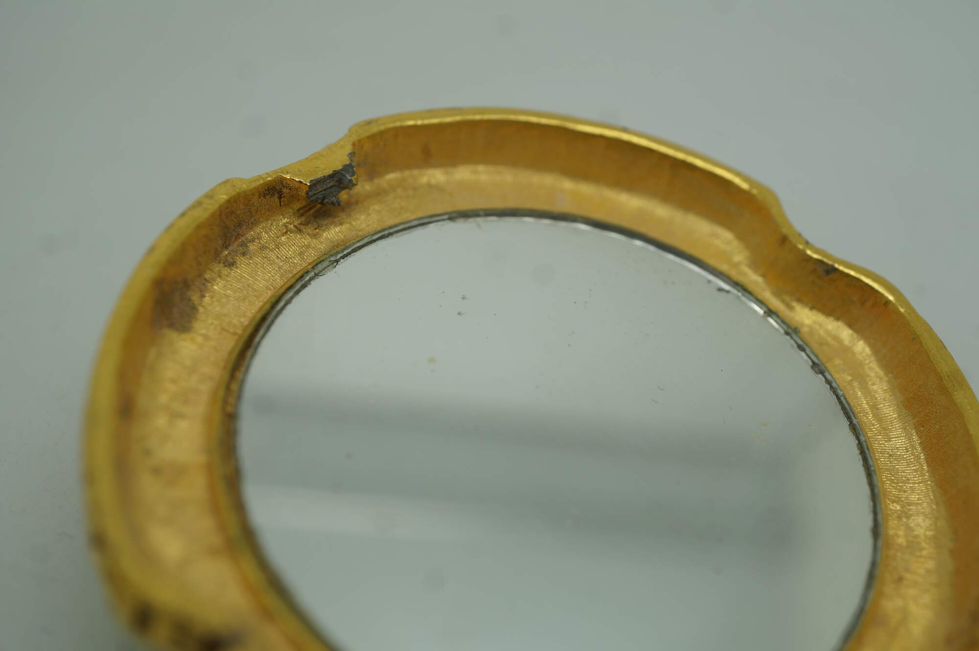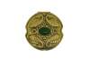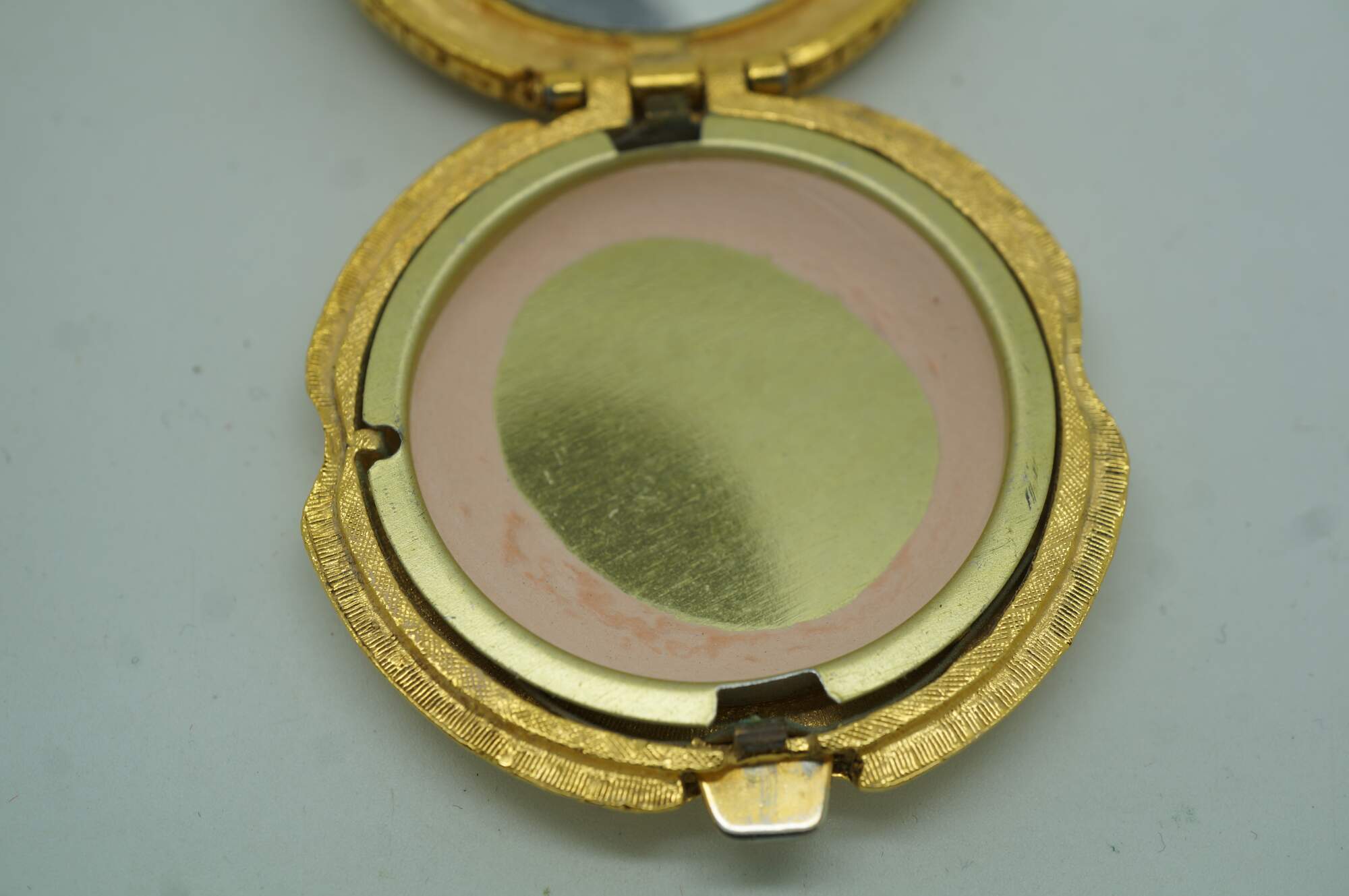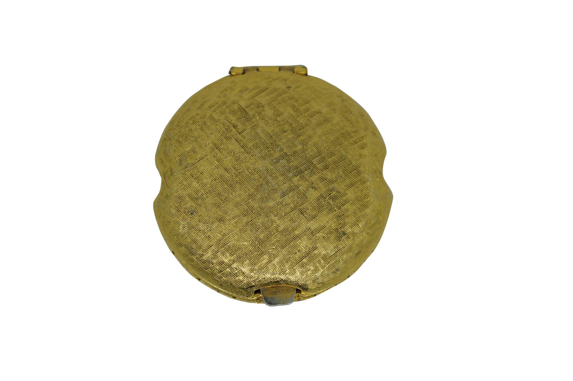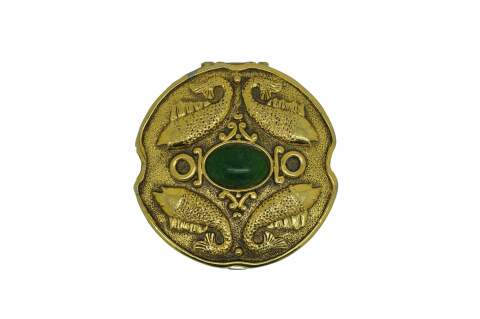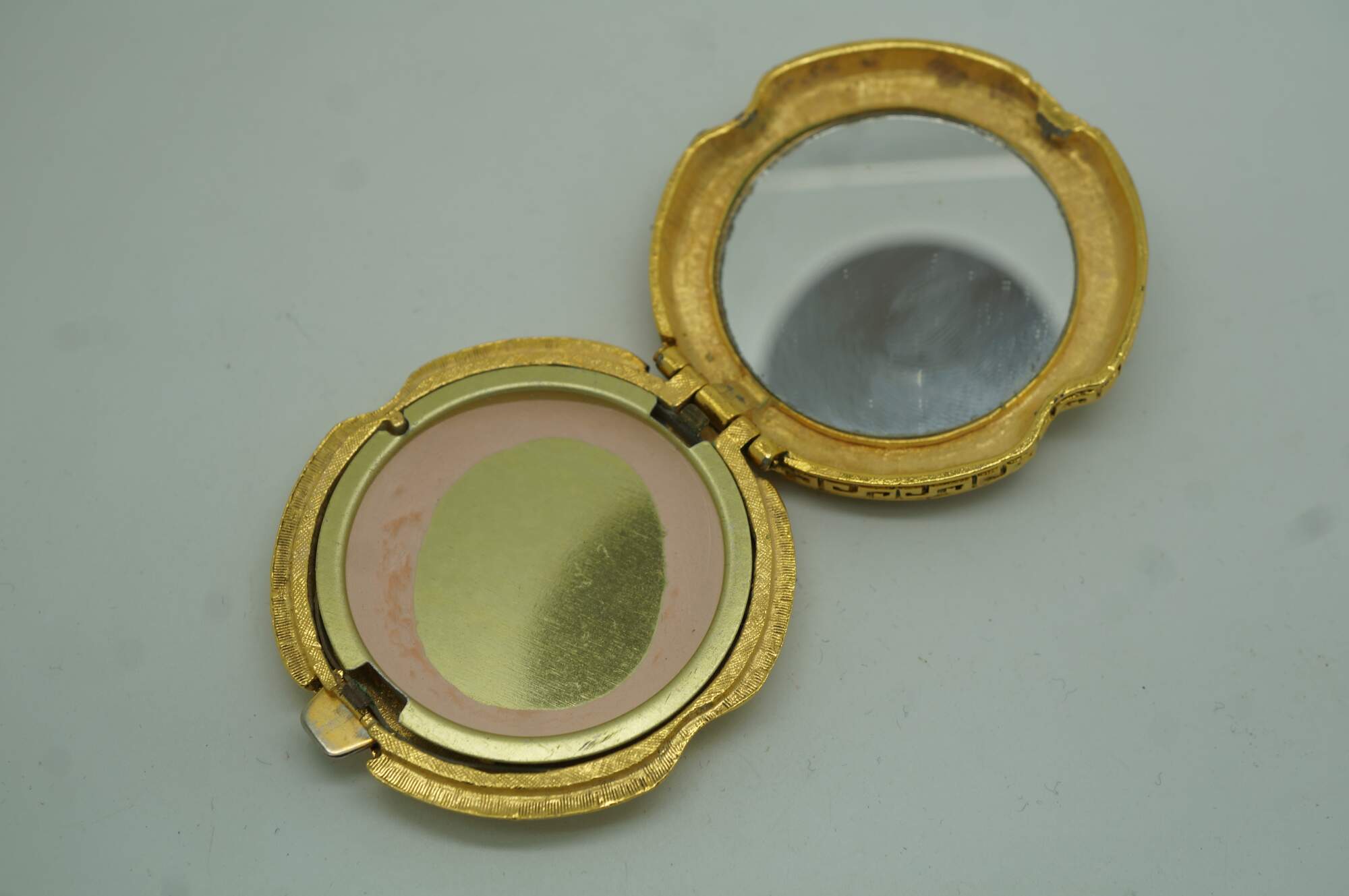 Mid century 1960s Max Factor "Golden Seas" powder puff mirror compact. The compact is gold-toned and features an embossed greek key design and four Koi fish surrounding a faux green jade stone.