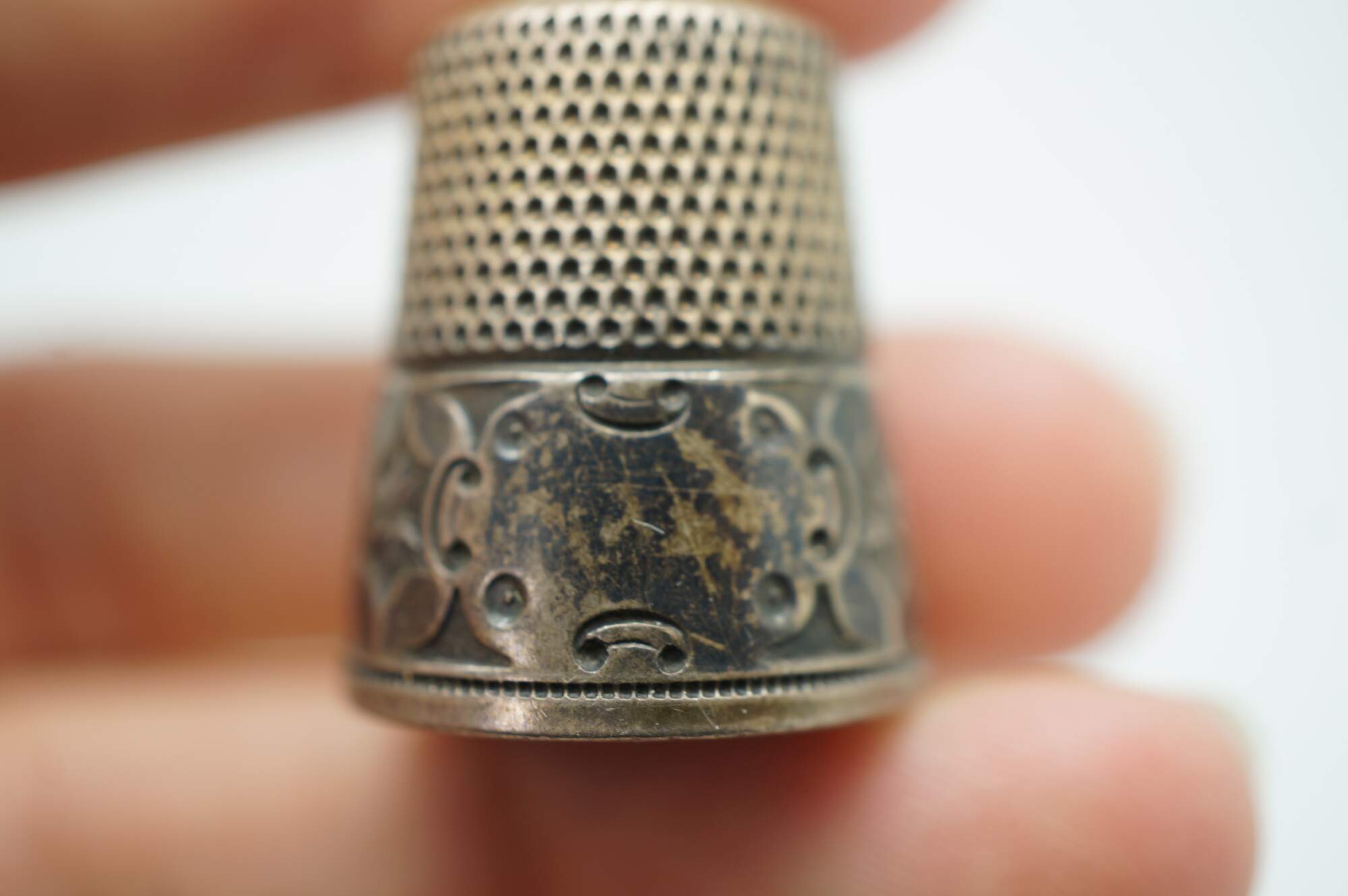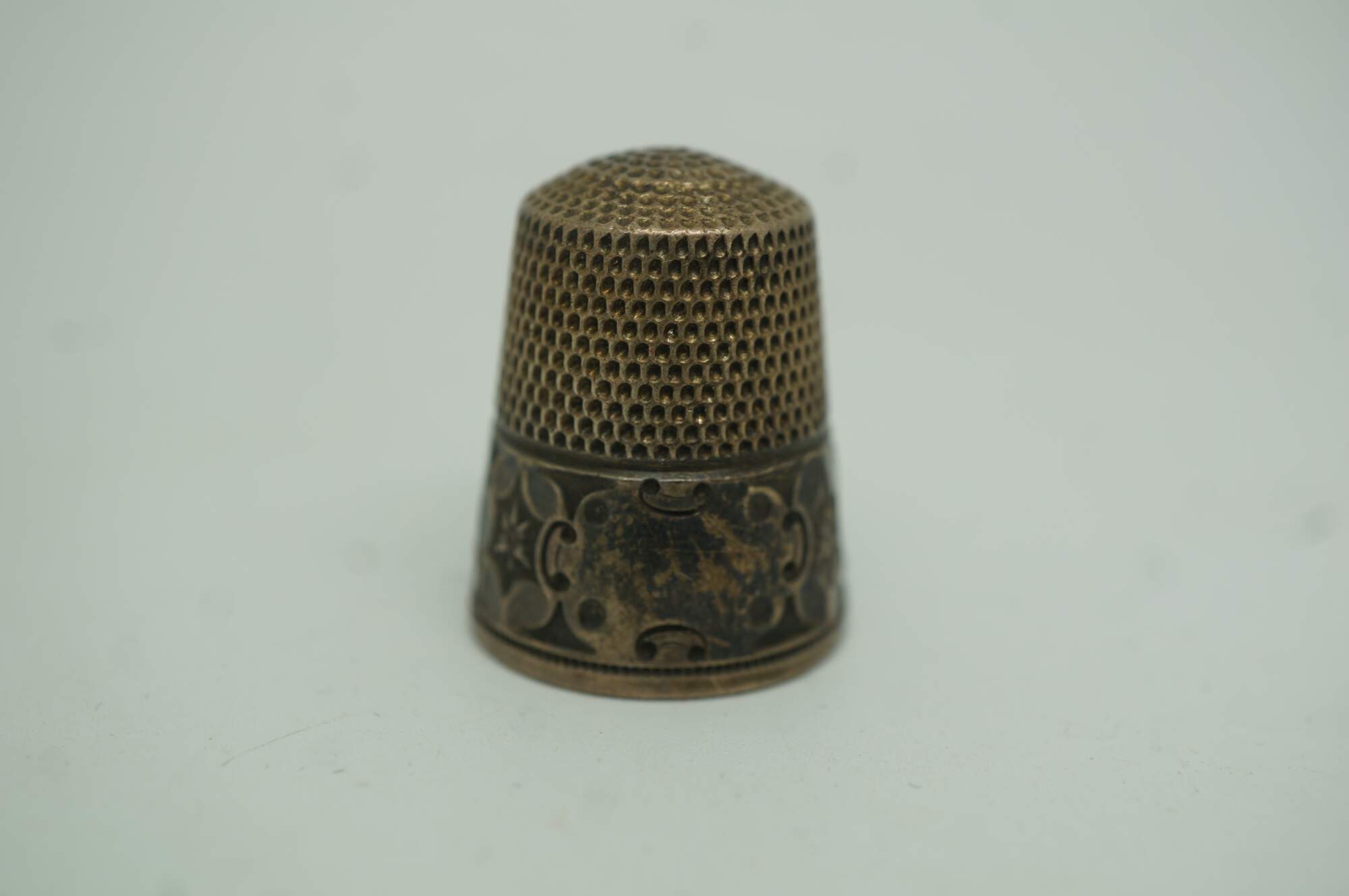 Antique Victorian Simons Brothers sterling silver .925 size 12 sewing thimble. The top features a textured, dimpled pattern, and the base has an intricately detailed band with an Art Nouveau floral star motif.
