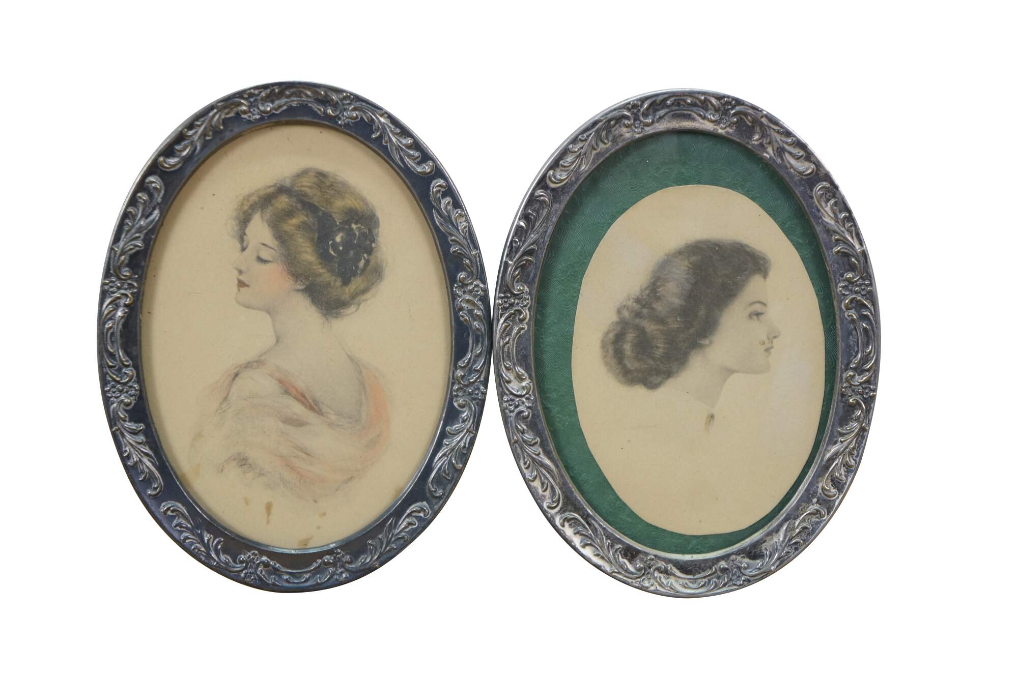 Vintage set of three antique silverplated floral acanthus picture frames. Two wall hanging, one tabletop.