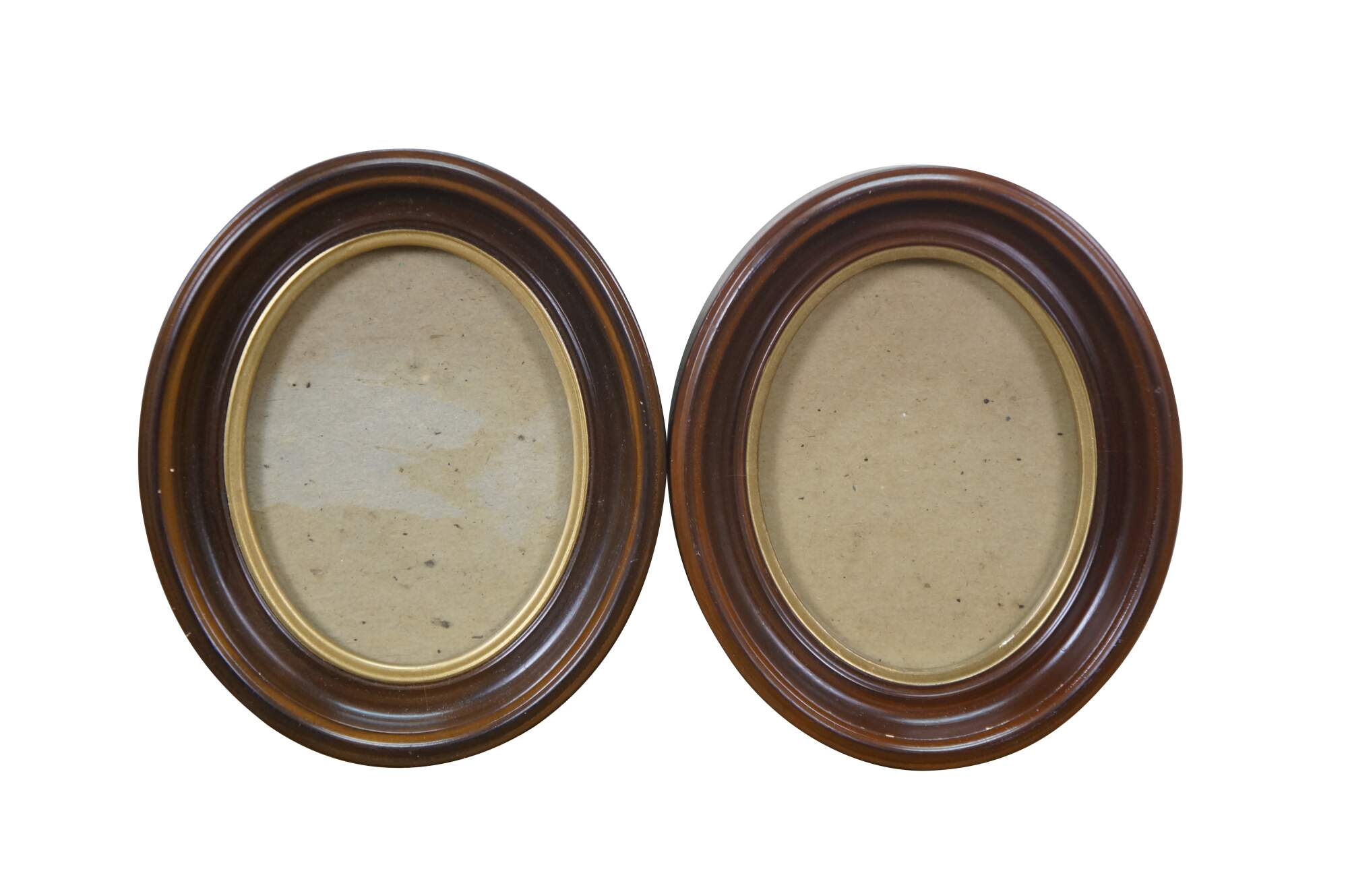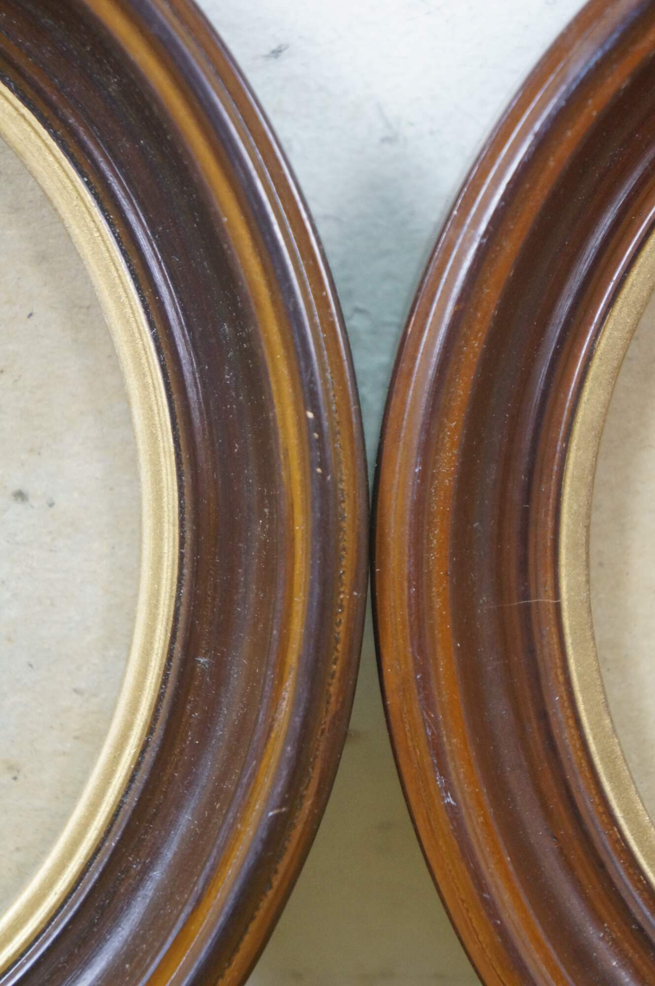 Two vintage brown and gold oval wall mount picture frames.