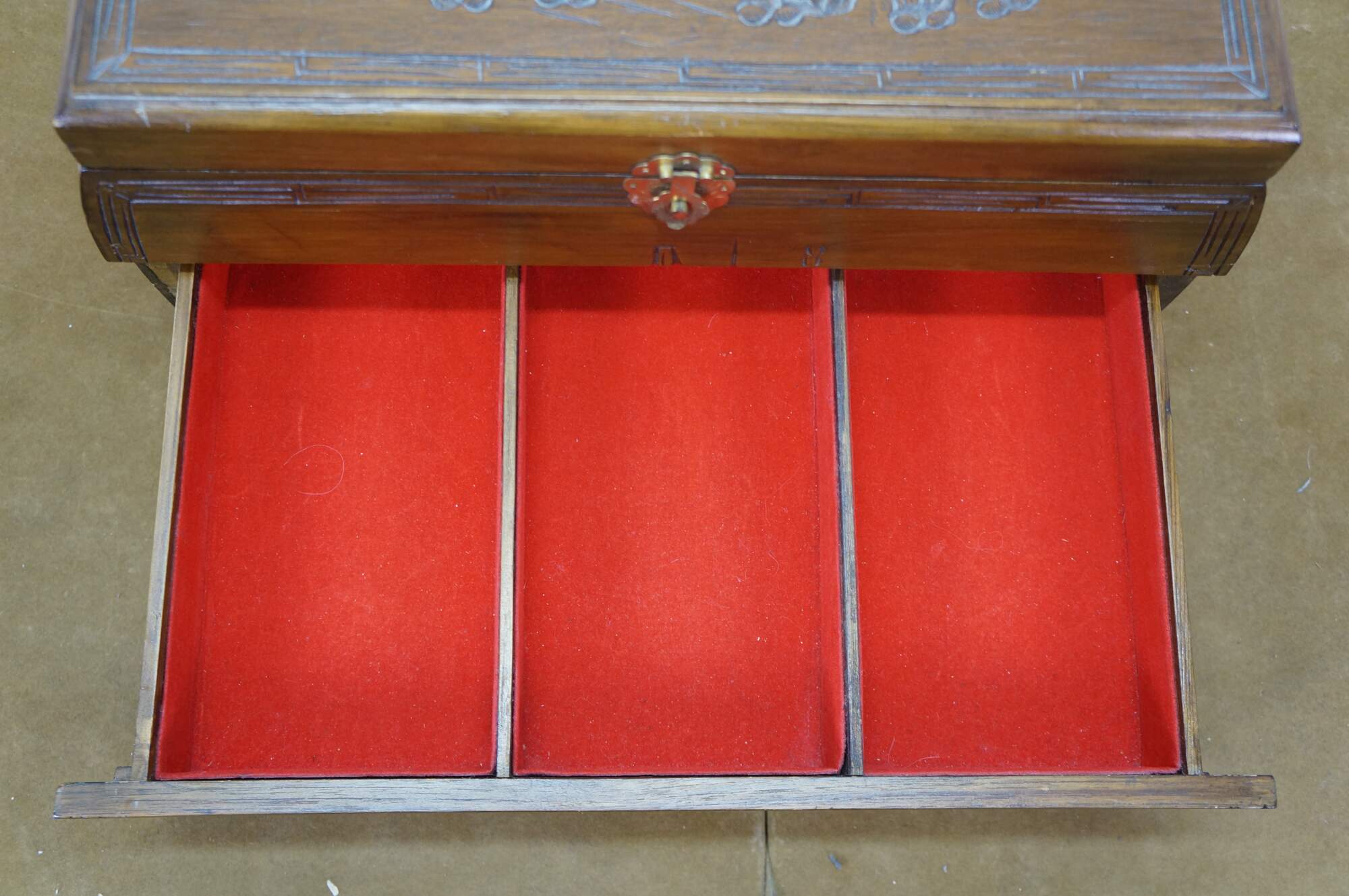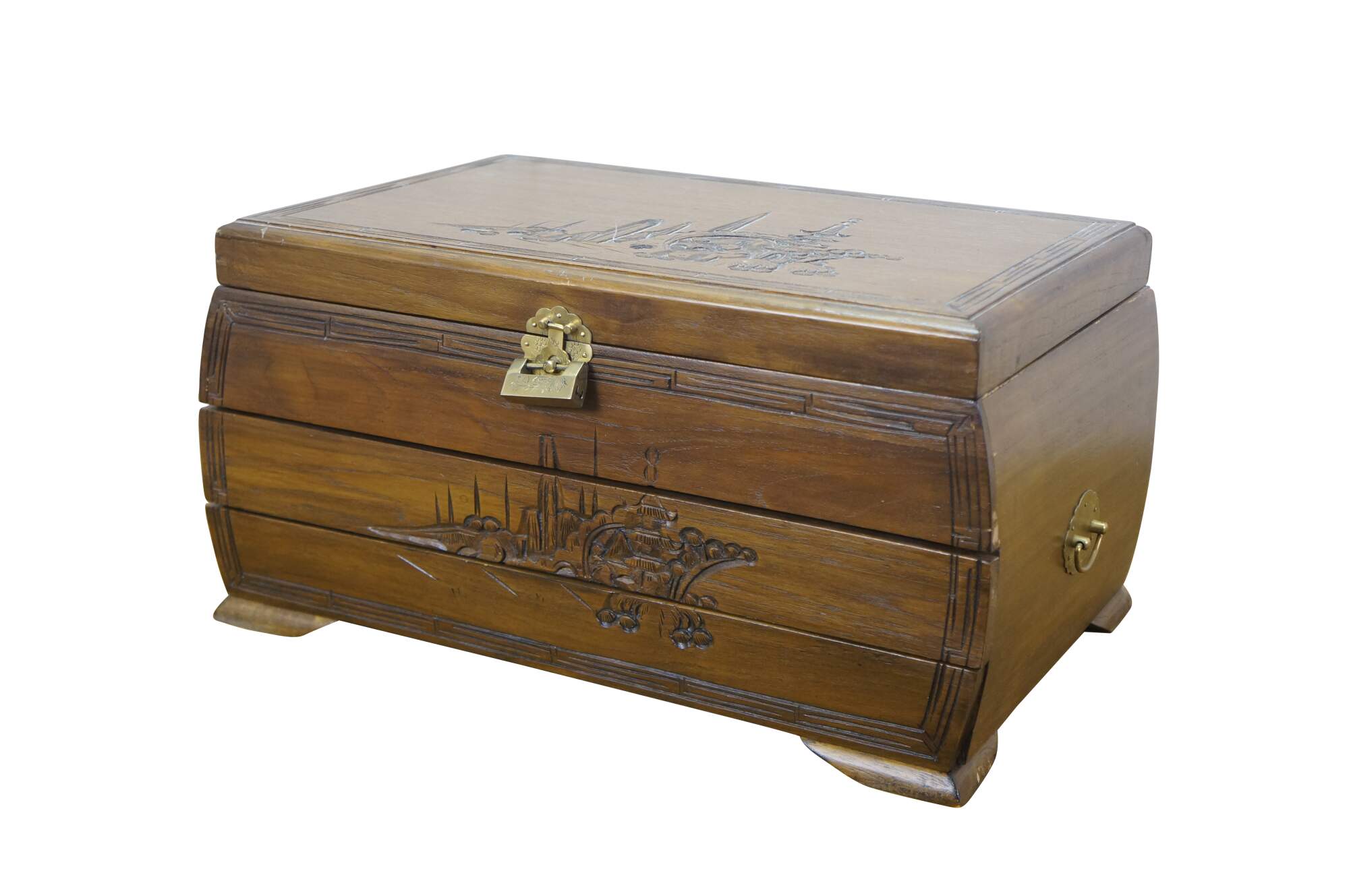Vintage Japanese chinoiserie jewelry treasure chest. Made of Camphor Wood featuring a carved cityscape with Pagoda and etched brass hardware. The box interior features a mirror and red velvet lining, and includes fish style lock. Made in Okinawa Japan.