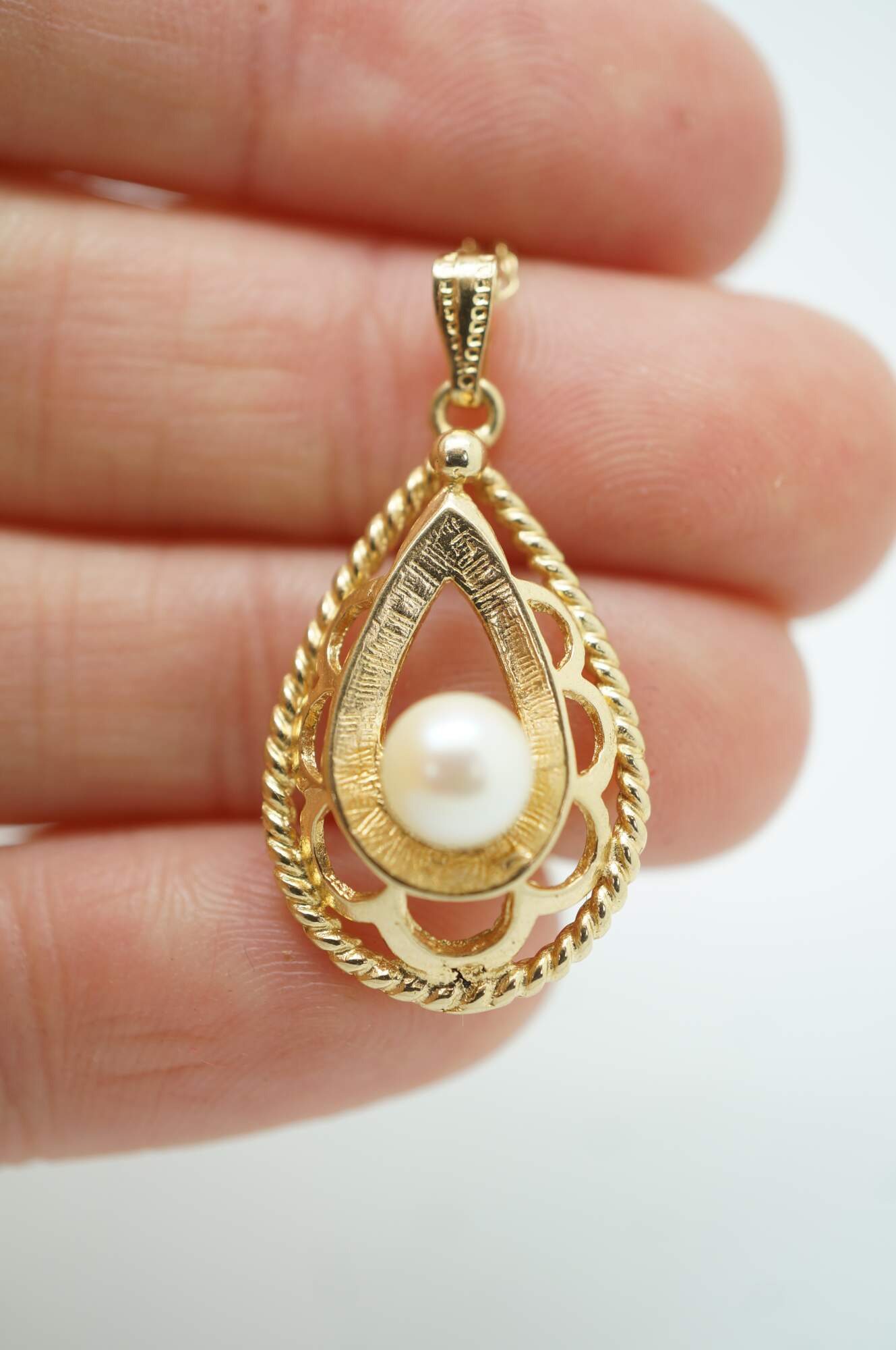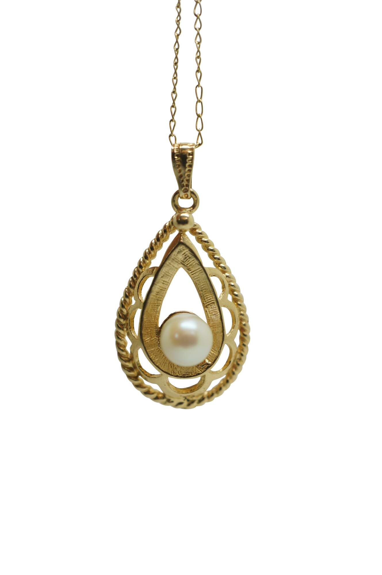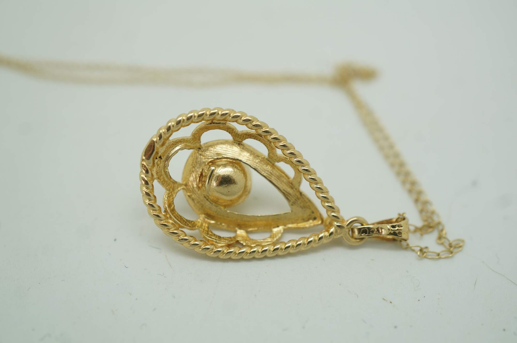 Vintage 14k Yellow Gold and Pearl tear drop shaped pendant statement necklace.