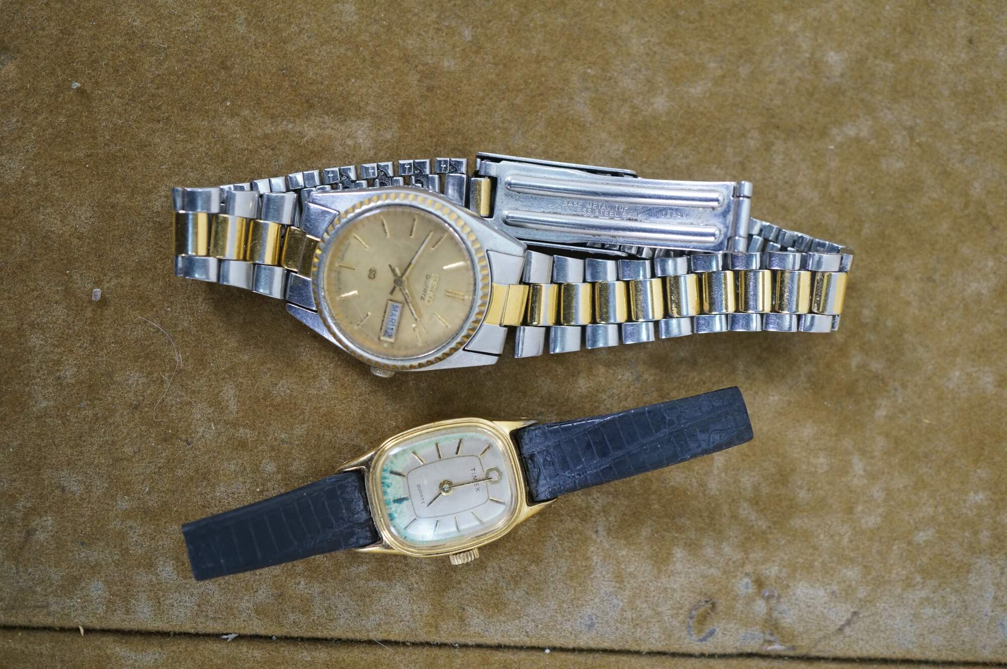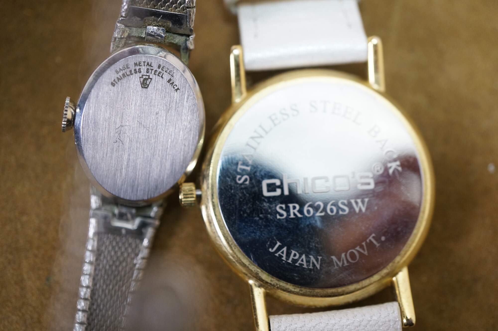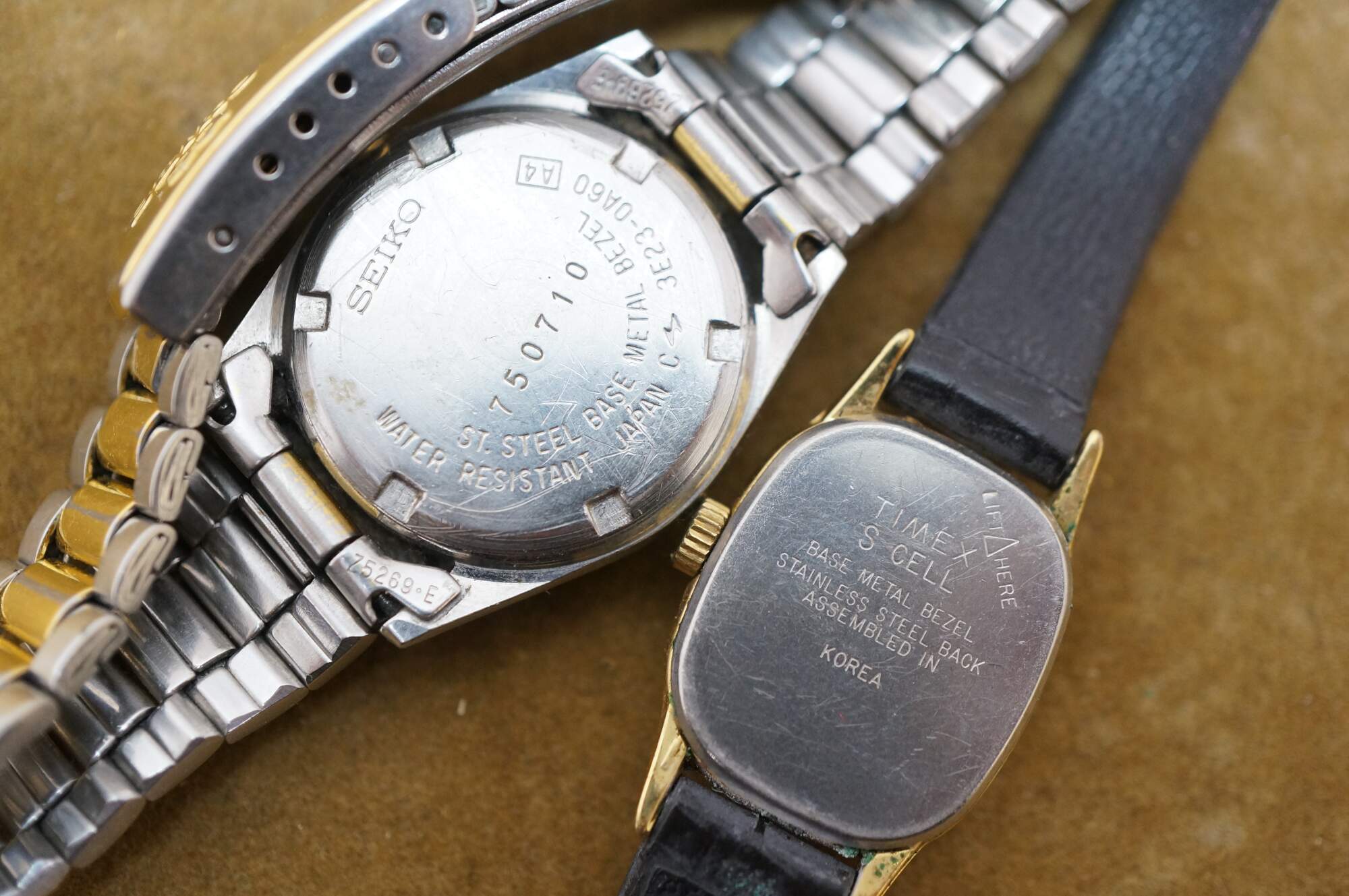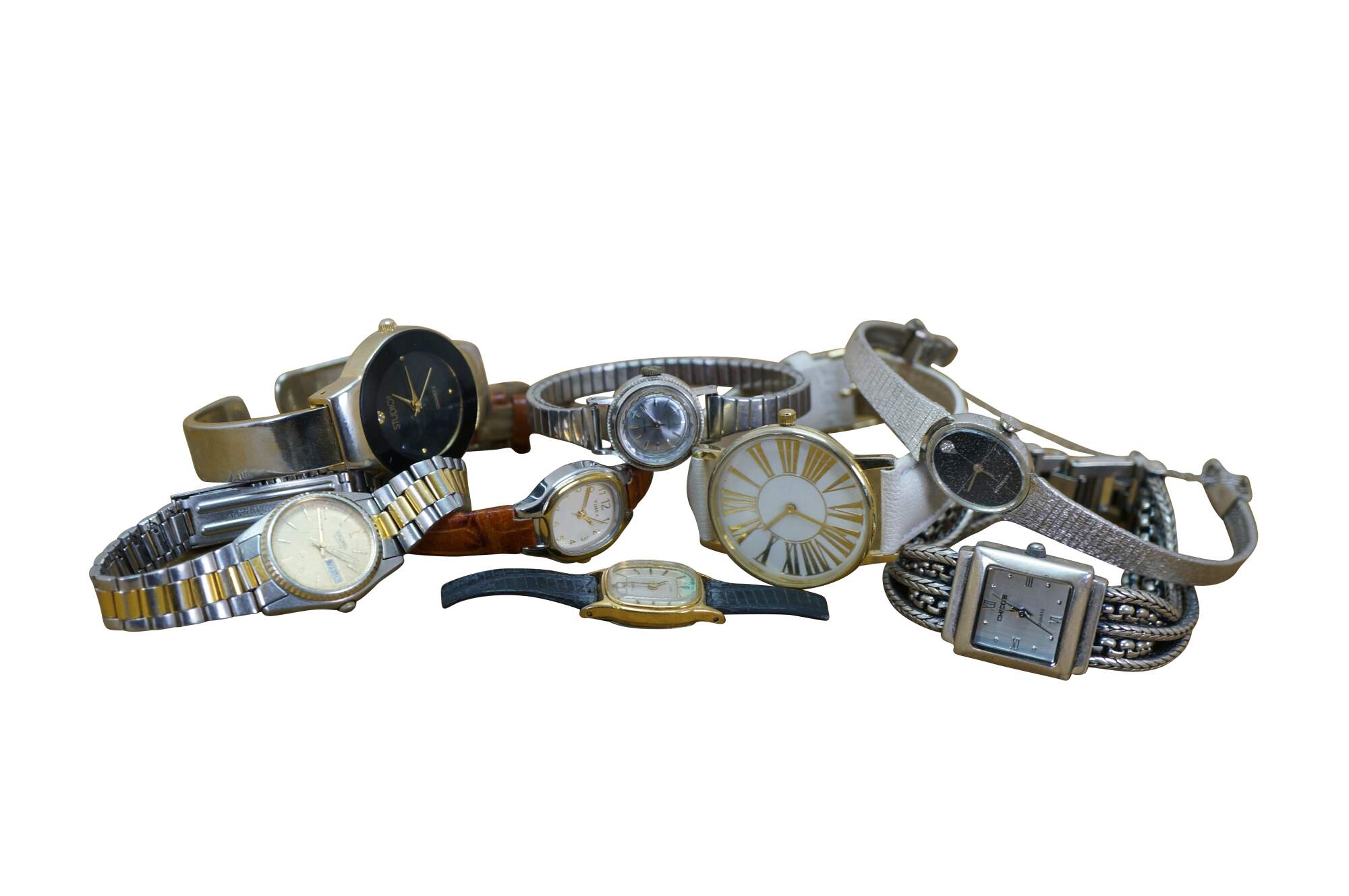 Wittnauer, 1960s Seiko Diashock 1004-0090 , Seiko Quartz 750710 Japan, Studio Quartz STD907T Japan, Timex 1216 Cell, Timex Quartz S Cell Korea, Chicos Quartz Japan, Chicos Roman numeral SR626SW Japan