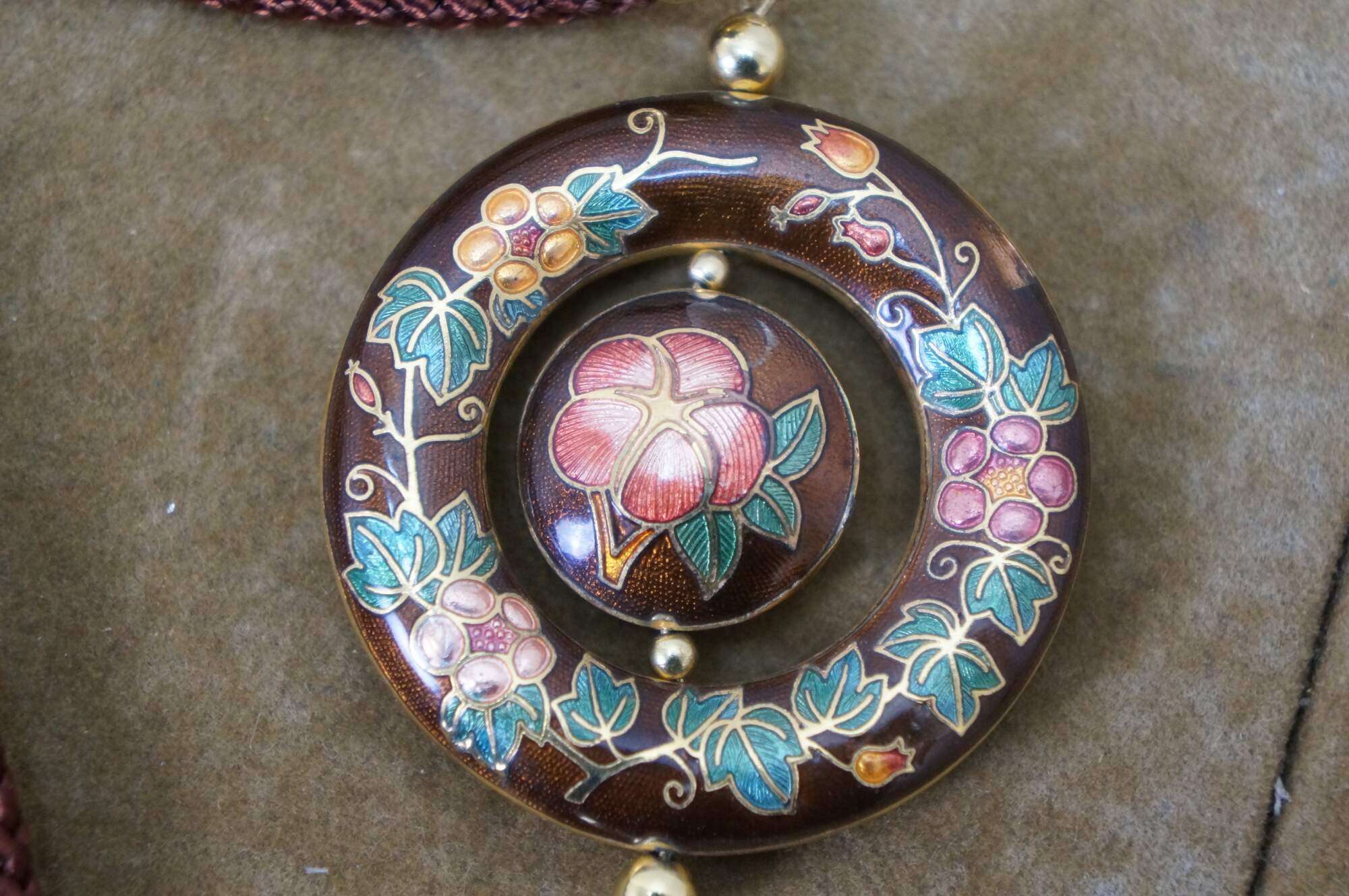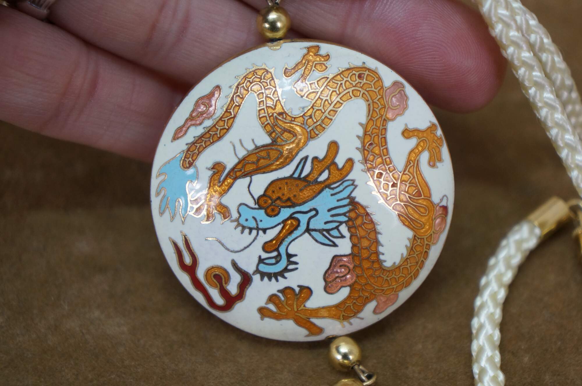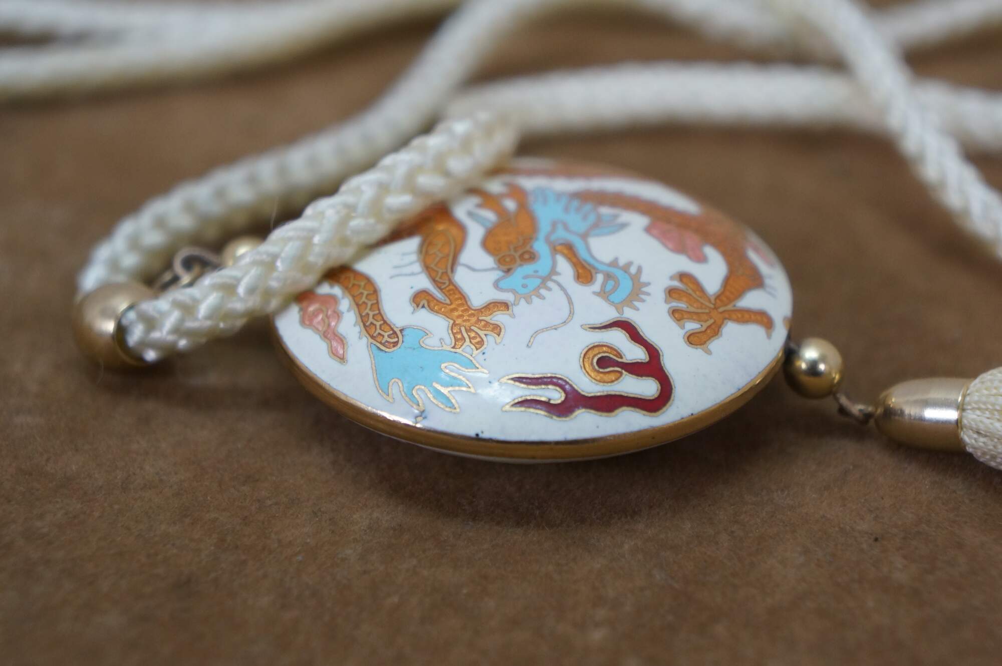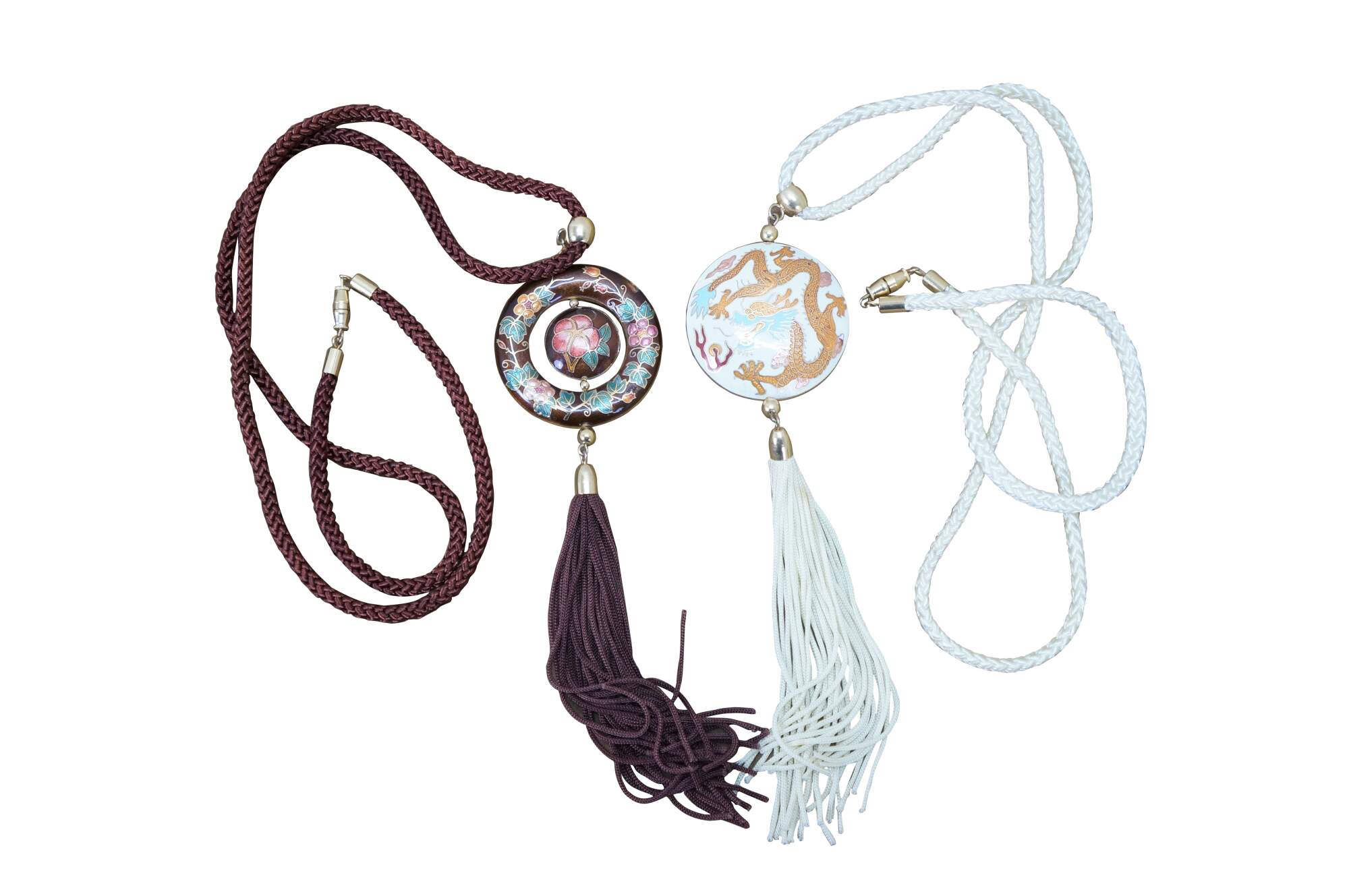 Two vintage Chinese cloisonné necklaces. One 5 toe dragon pendant tassel necklace and one floral medallion with silk cord and tassel.