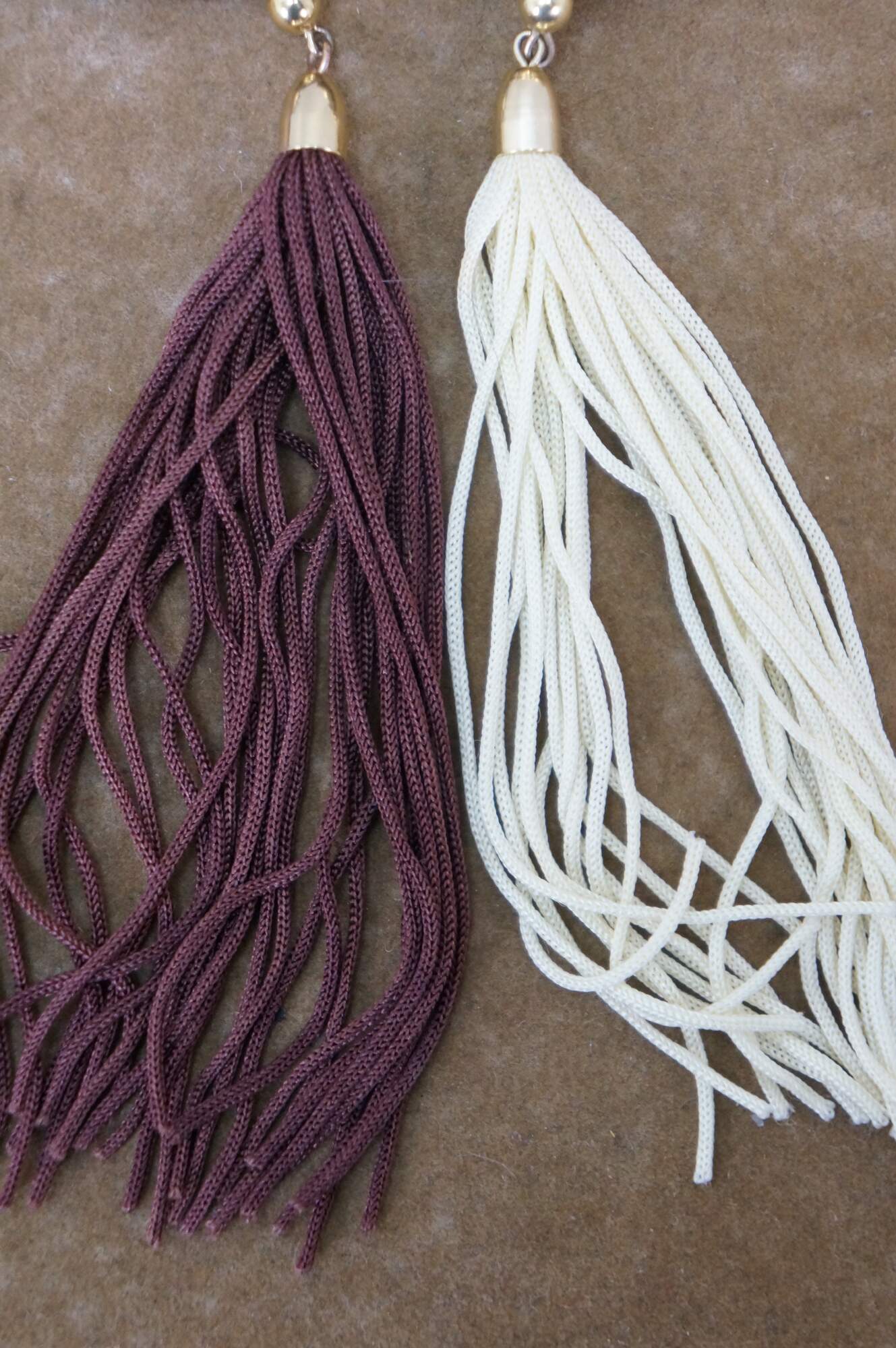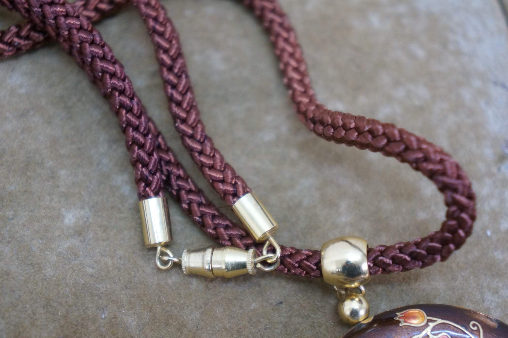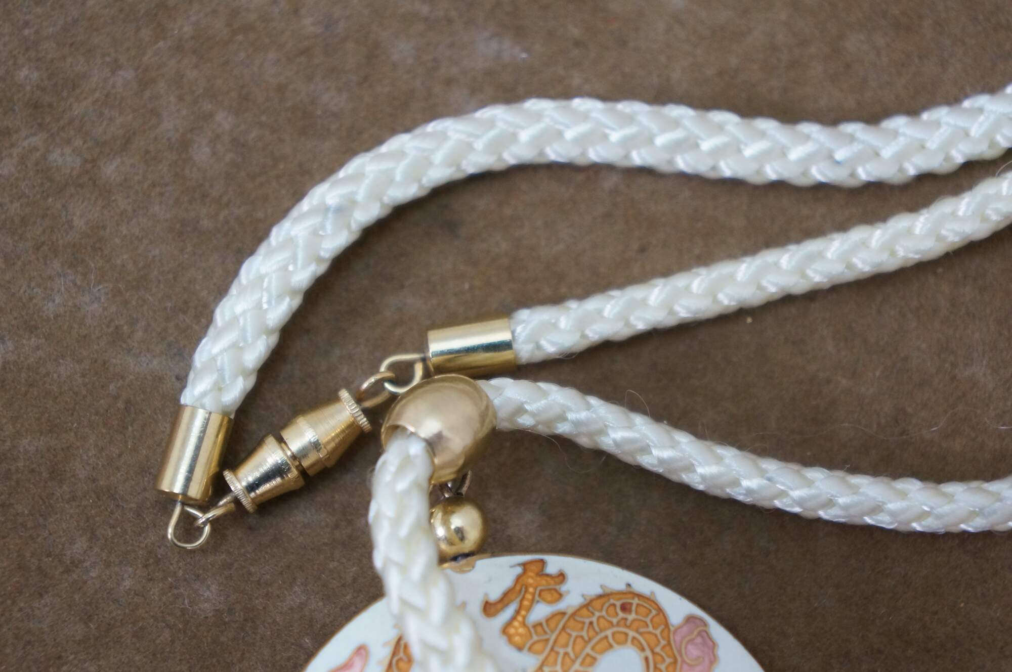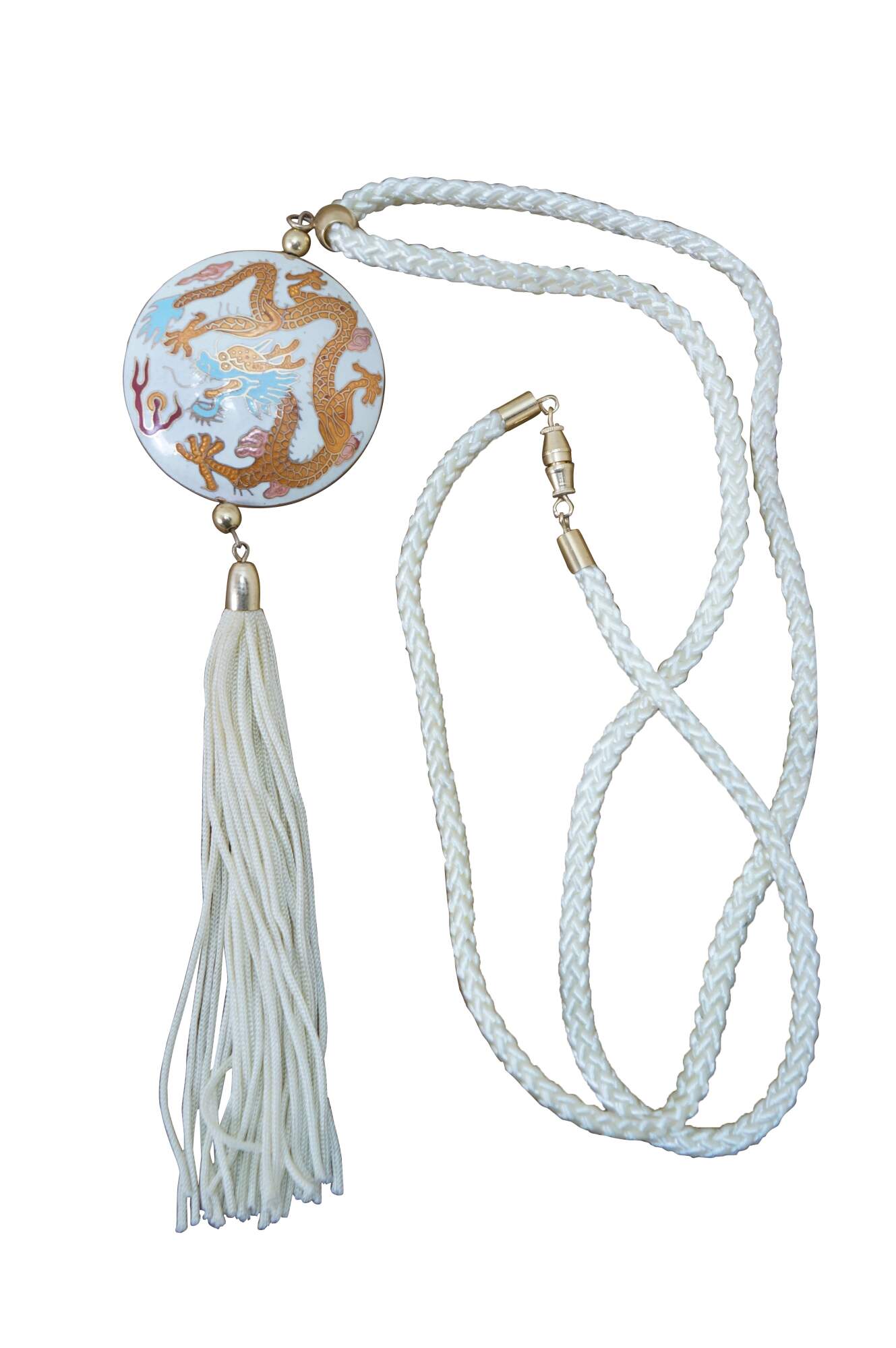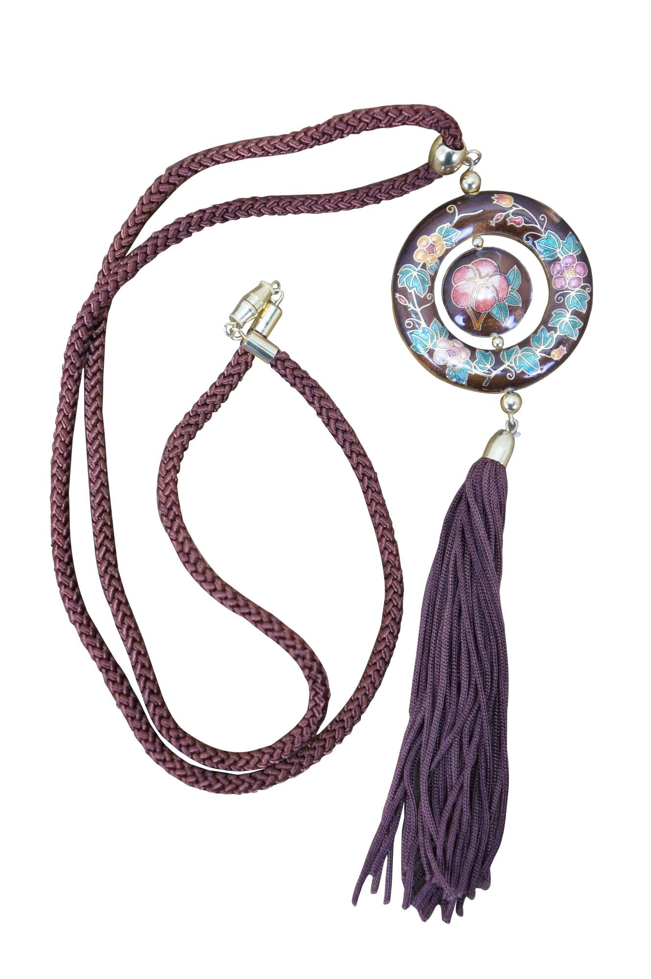 Two vintage Chinese cloisonné necklaces. One 5 toe dragon pendant tassel necklace and one floral medallion with silk cord and tassel.