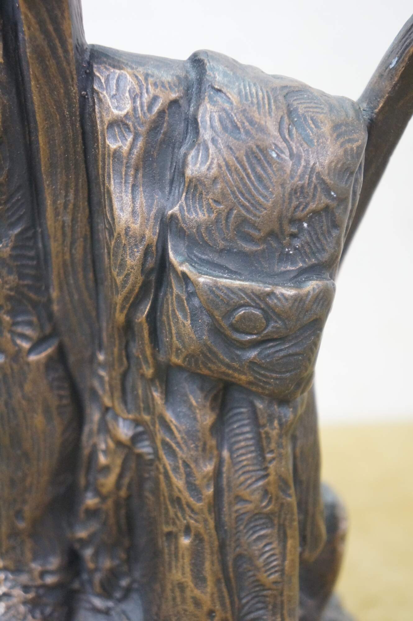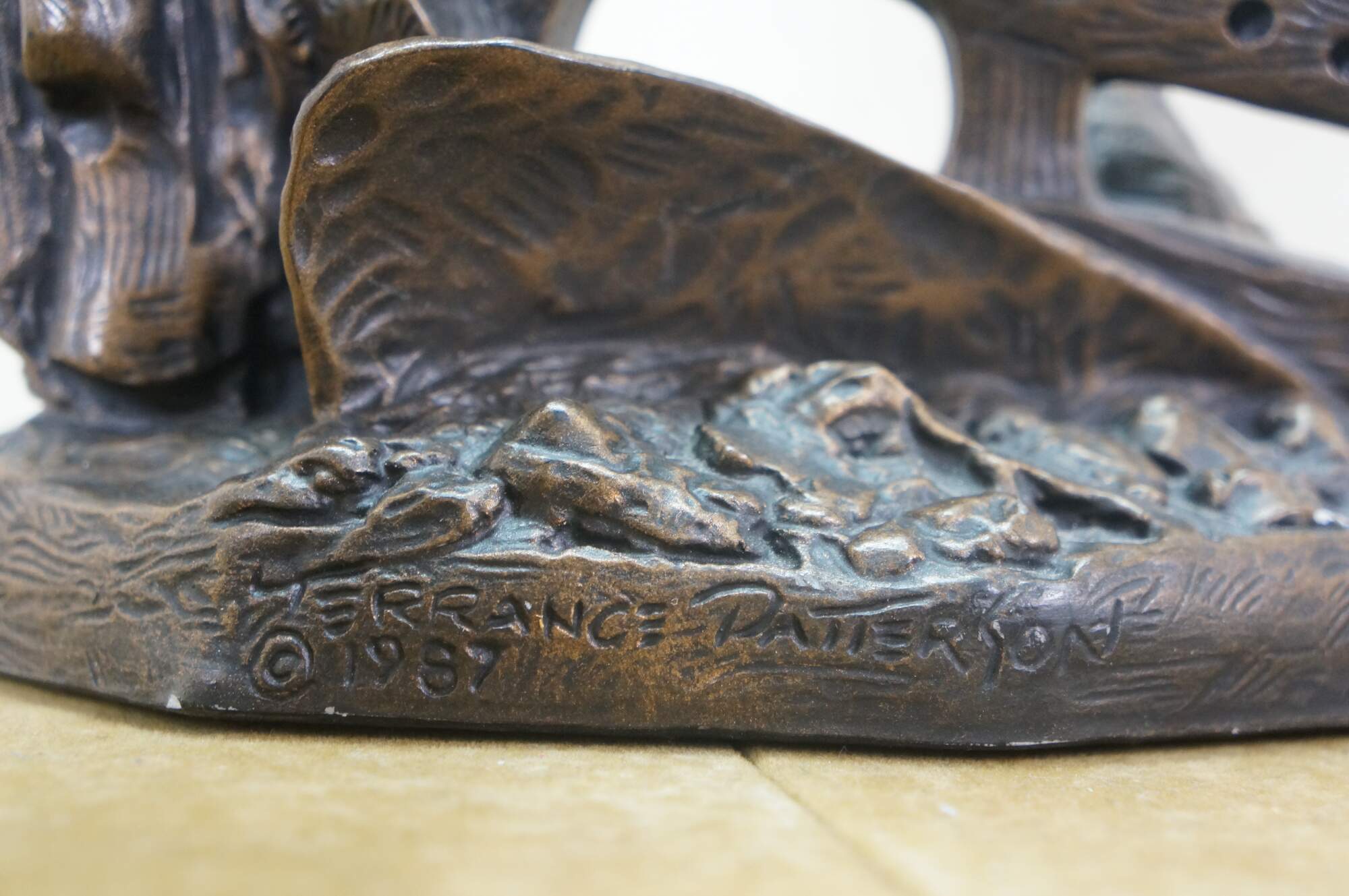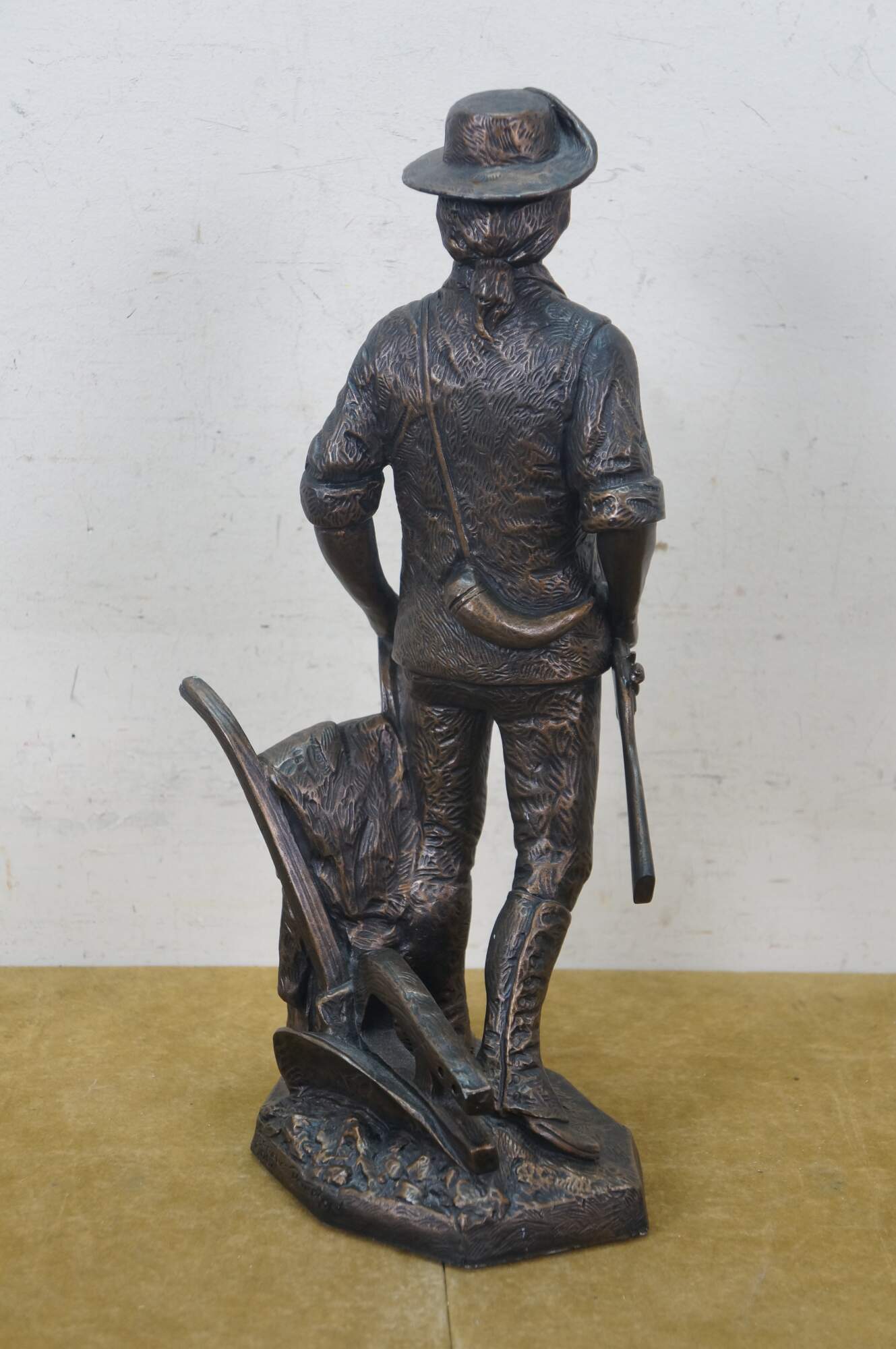 Large vintage 1987 patinated bronze terracotta Minute Man soldier holding rifle / gun by Terrance Patterson. Based on the monument by Daniel Chester French, created in 1875 and located in Minute Man National Historical Park, Concord, Massachusetts, the statue depicts a minuteman stepping away from his plow to join the Patriot forces at the Battle of Concord, at the start of the American Revolutionary War.