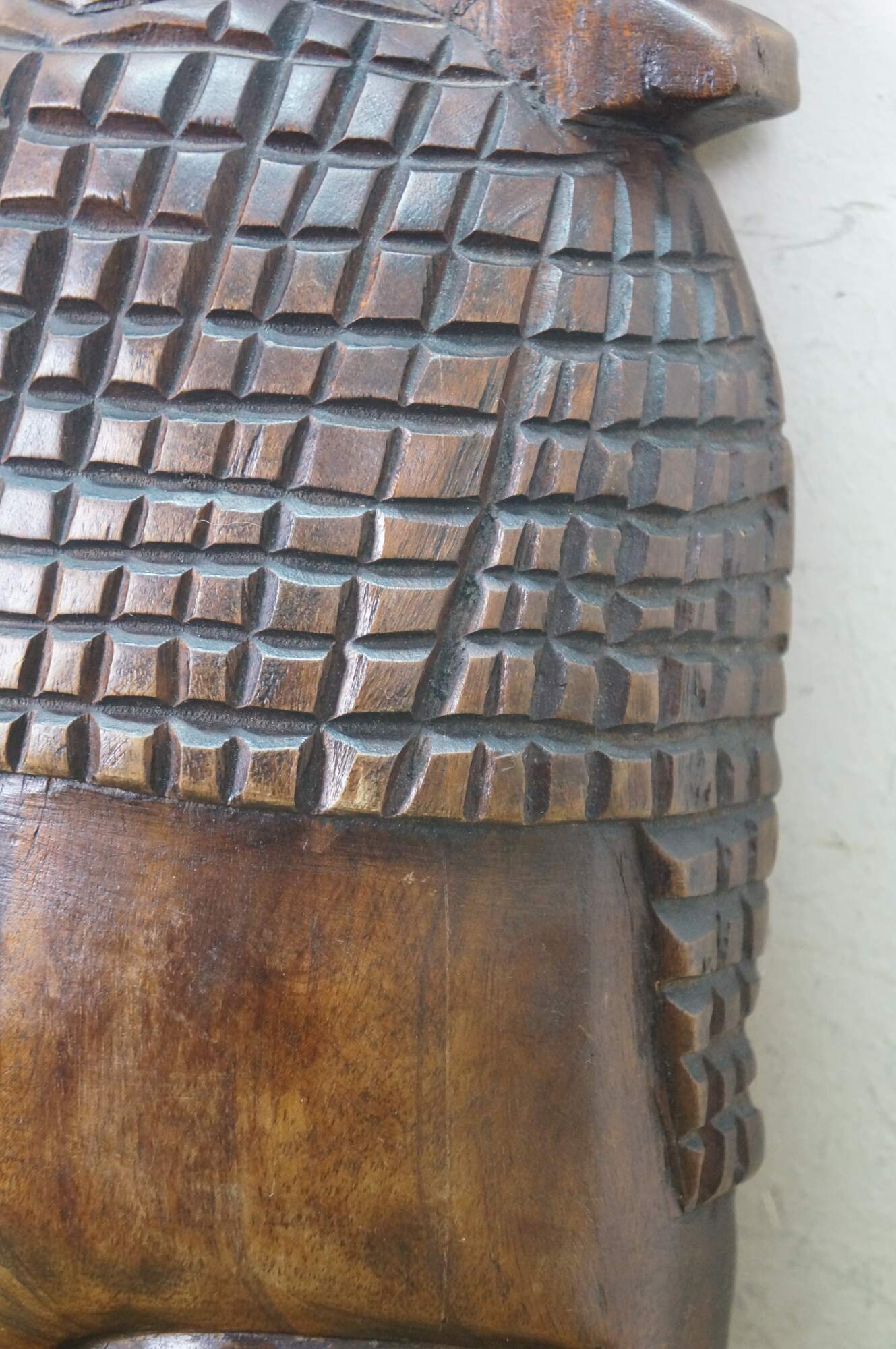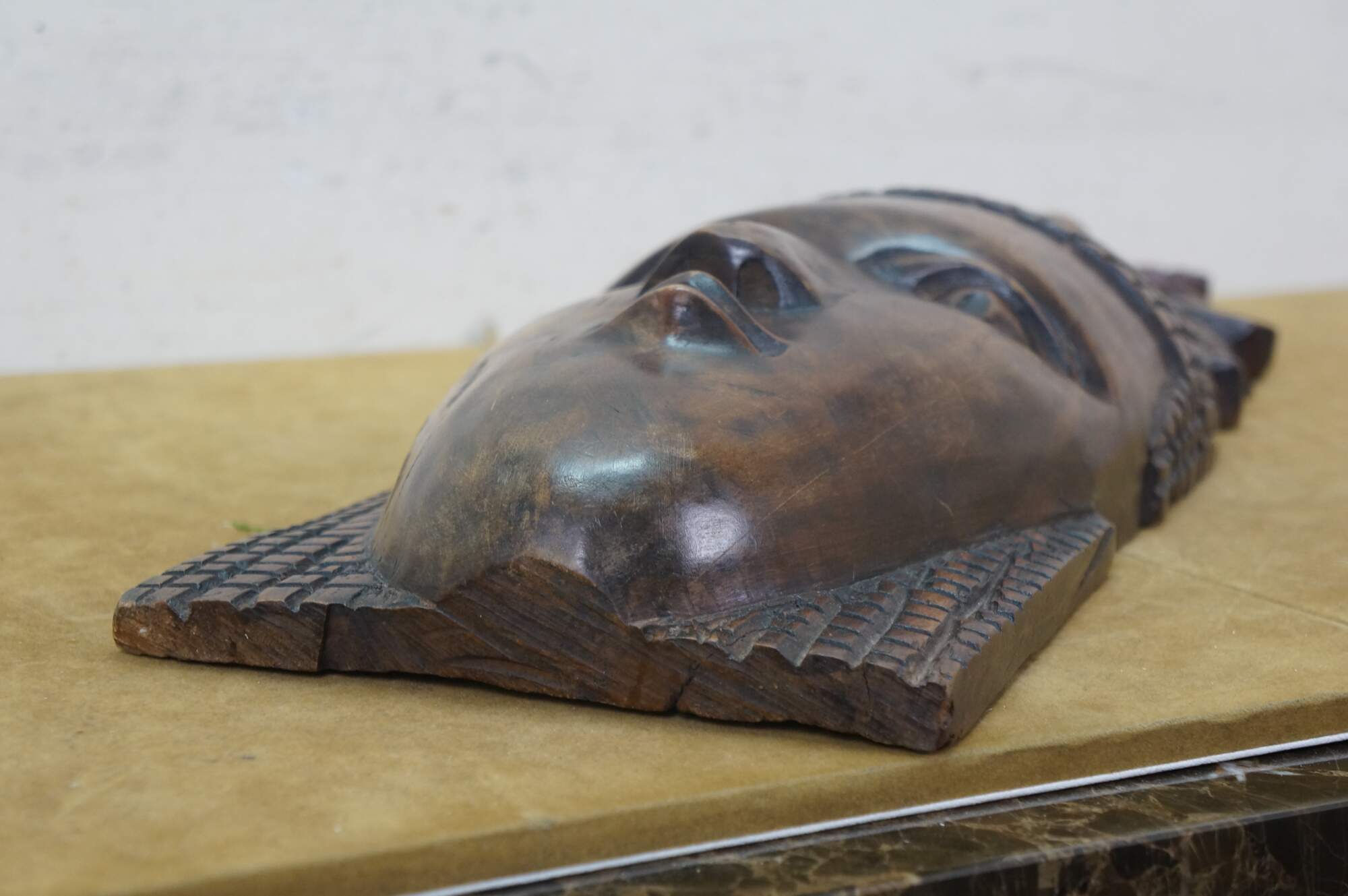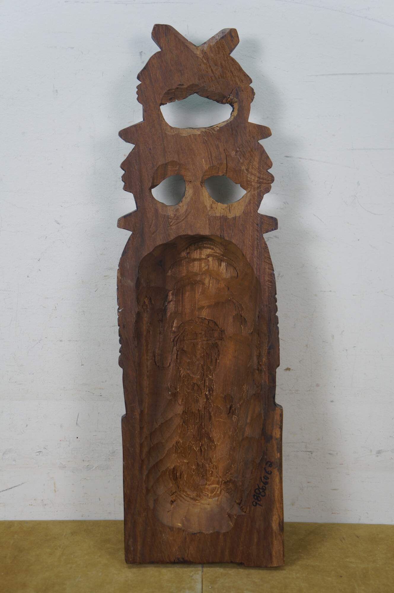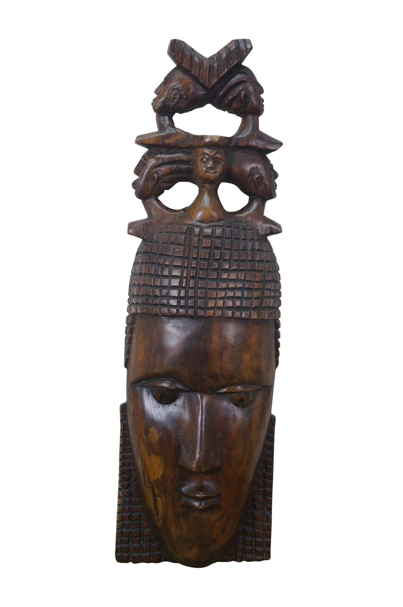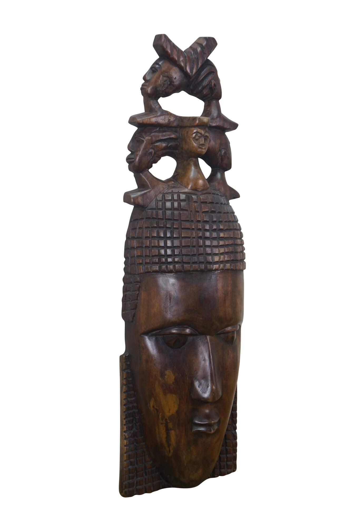 Vintage African tribal head mask featuring a matriarch wearing a headdress of her family.
