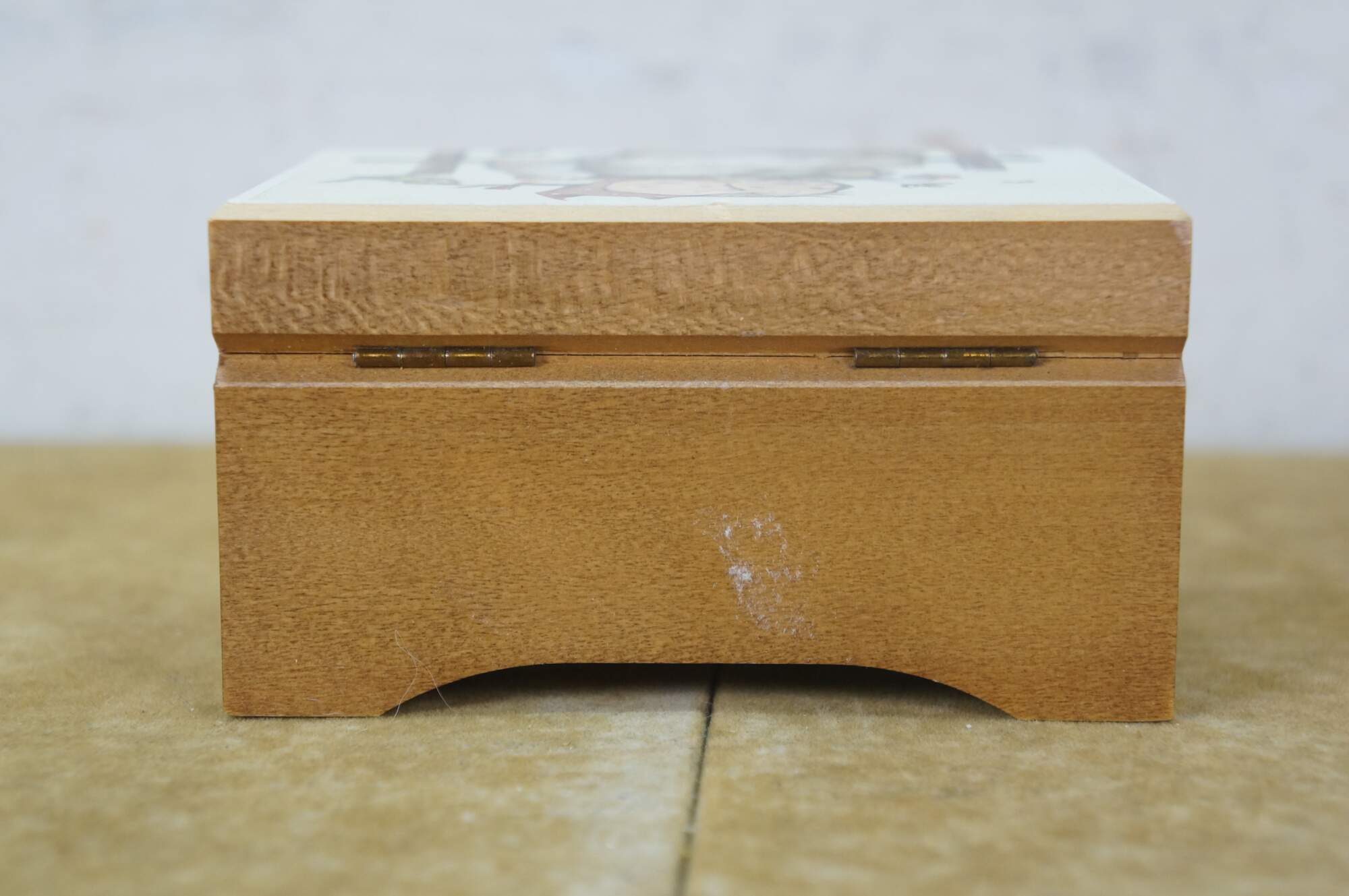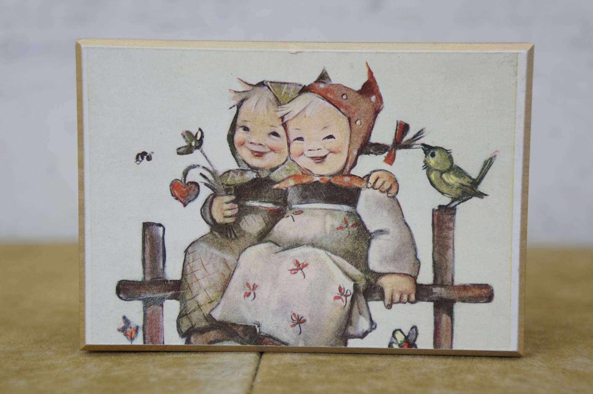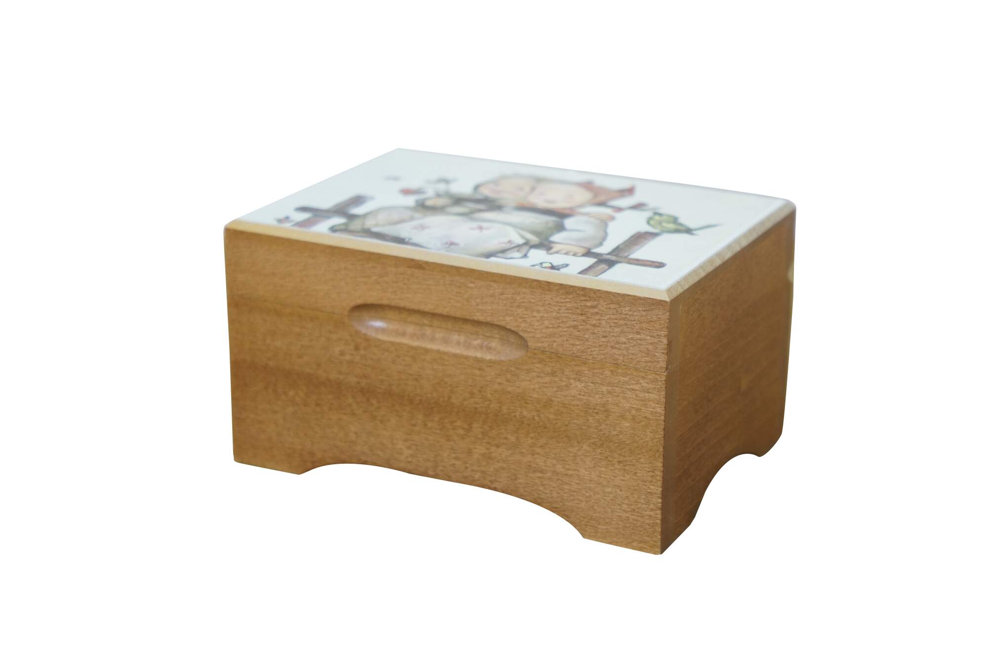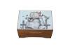 Mid to late 20th century Reuge Switzerland musical box - rectangular wooden box, lid decorated with a printed image styled after Coquettes Two Girls on a Fence Hummel. Plays The Sound of Music.