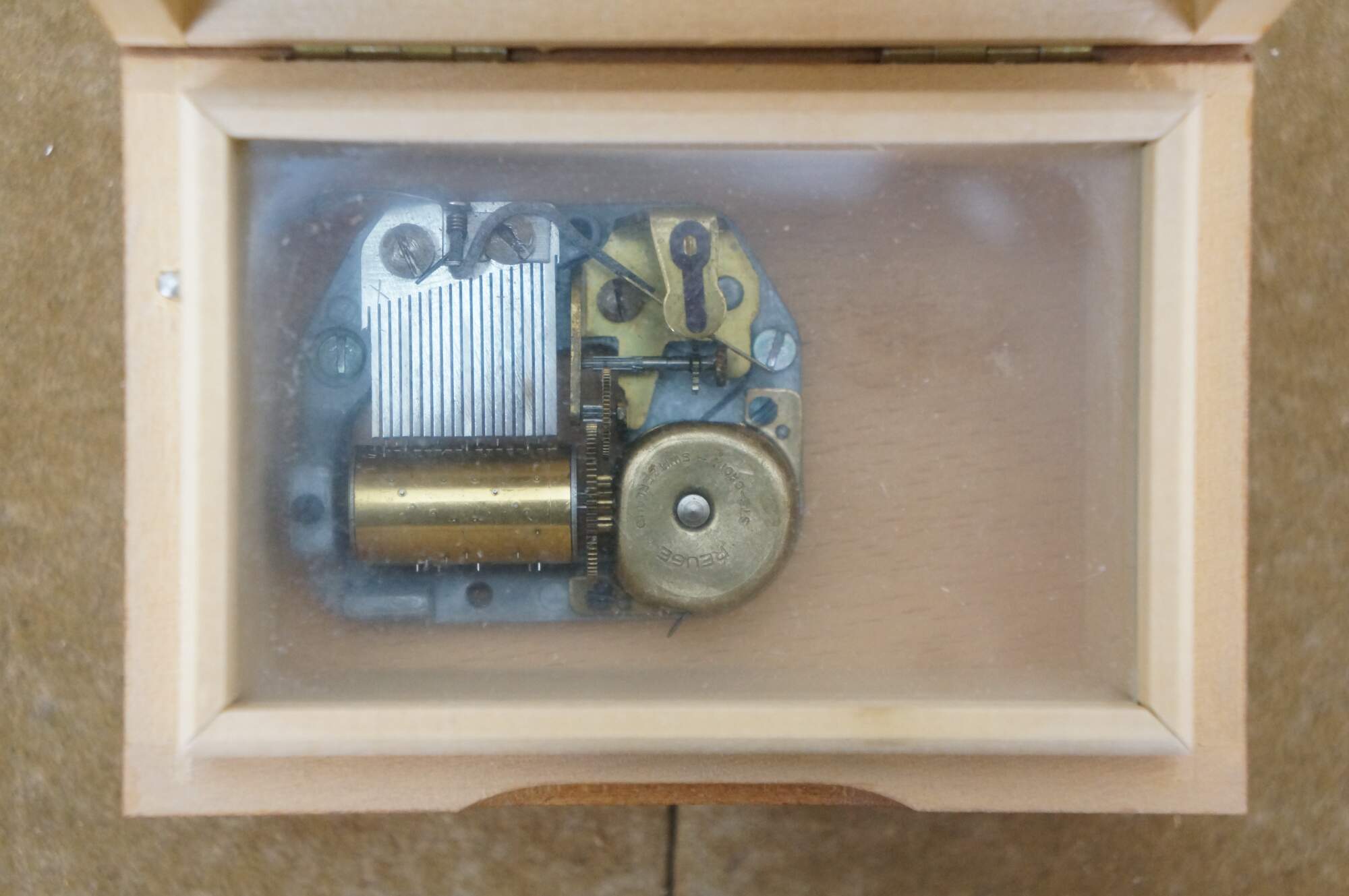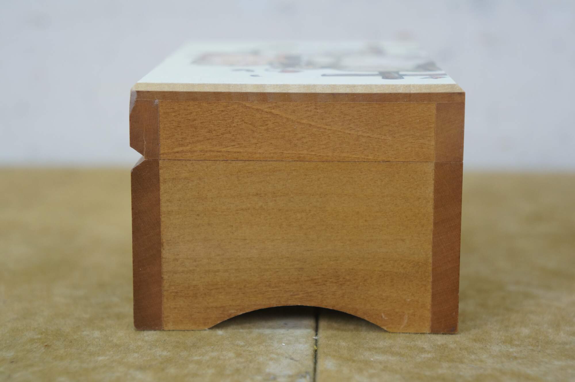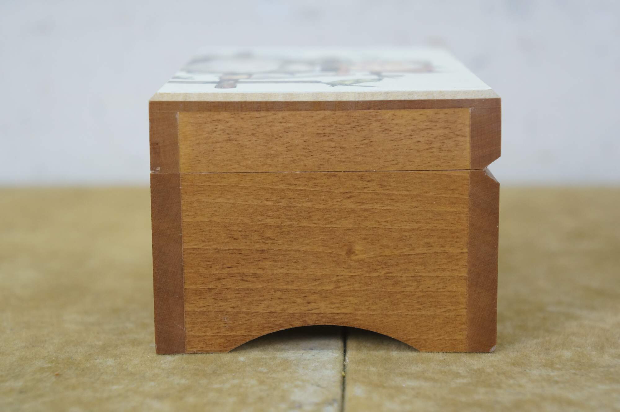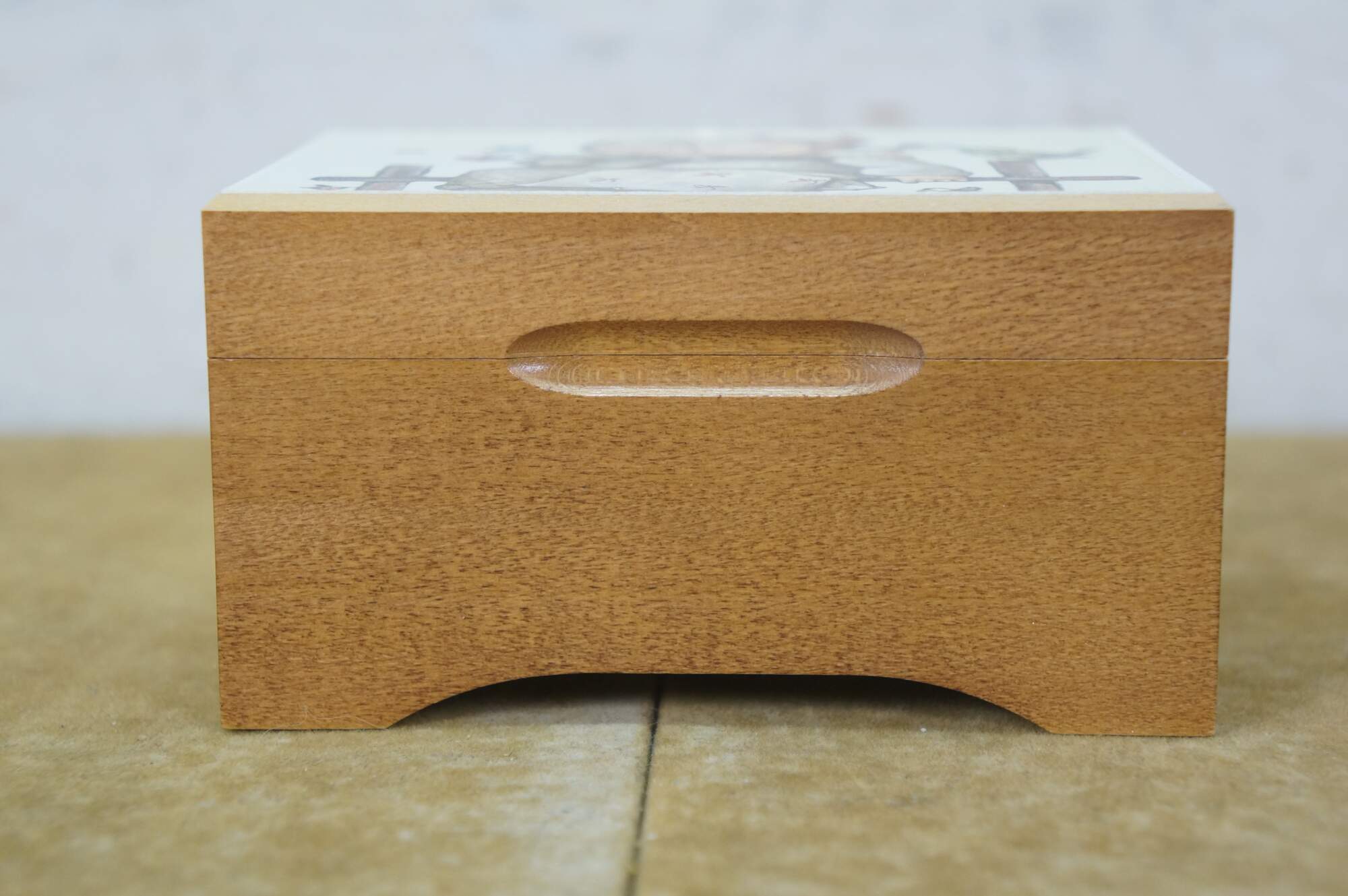 Mid to late 20th century Reuge Switzerland musical box - rectangular wooden box, lid decorated with a printed image styled after Coquettes Two Girls on a Fence Hummel. Plays The Sound of Music.