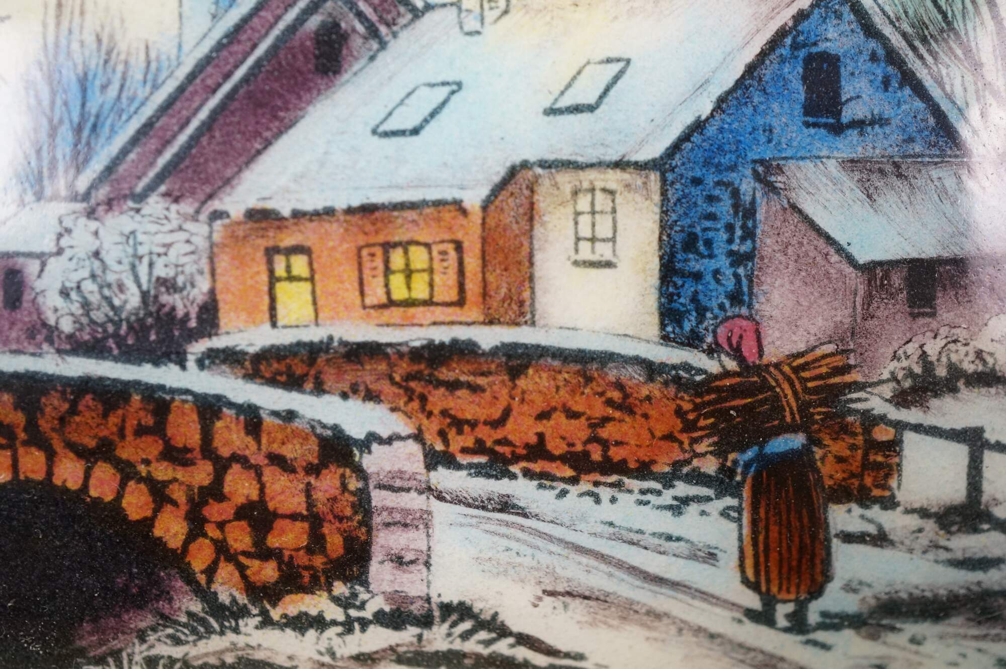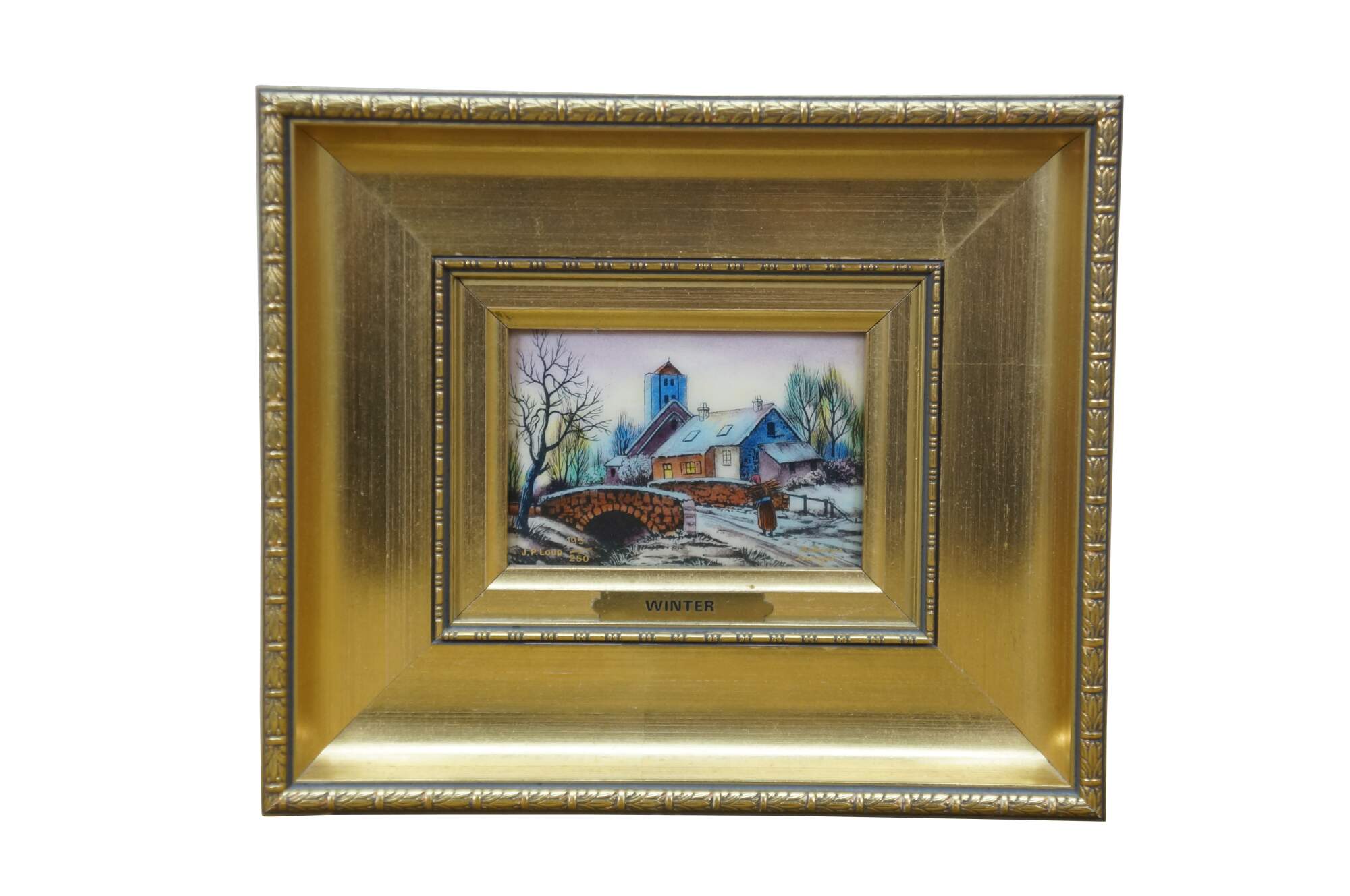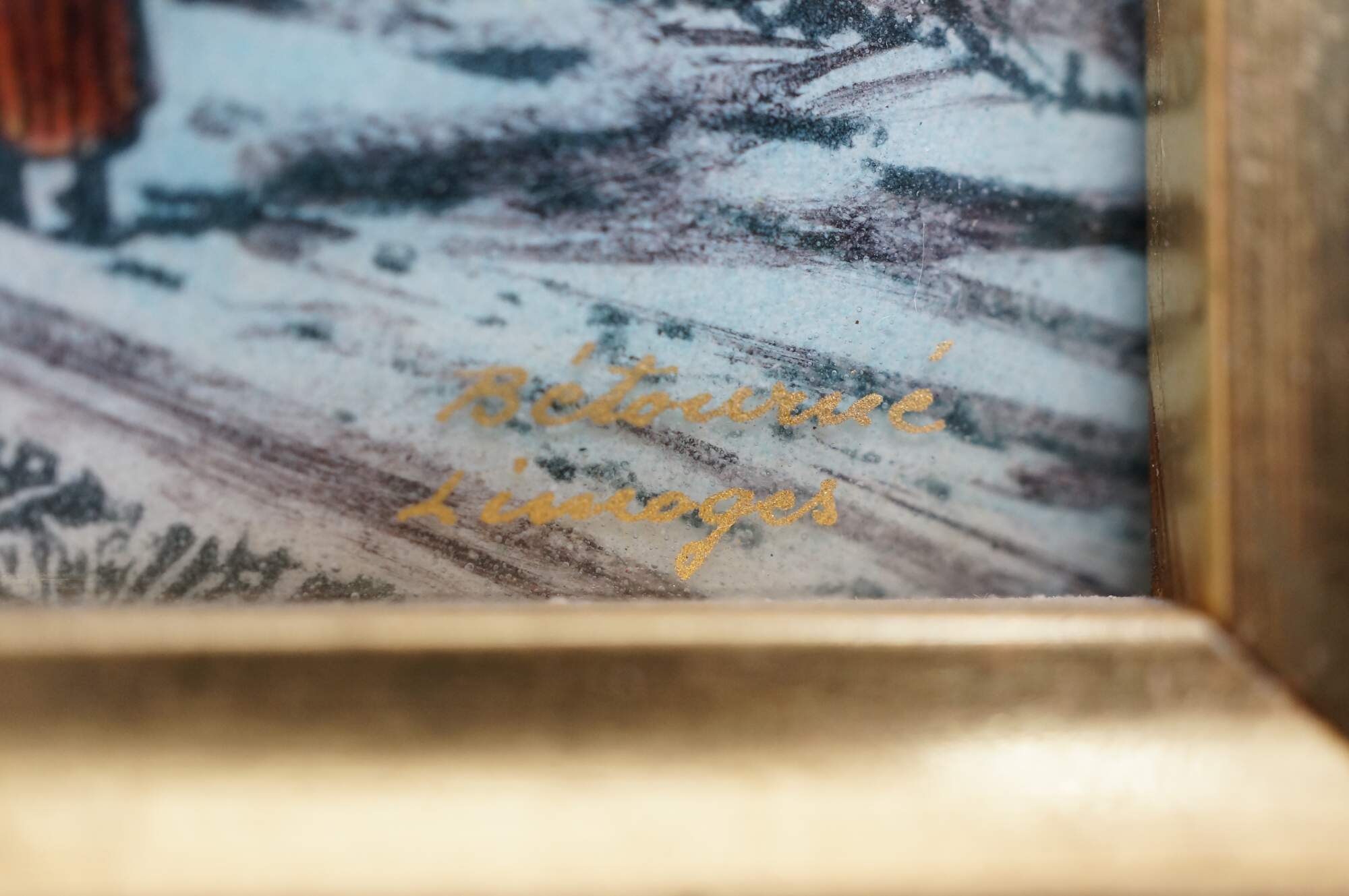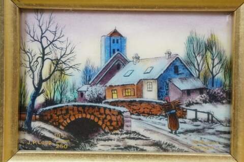 Miniature vintage Jean Betourne enamel on copper art depicting a rural French countryside landscape scene during the winter with a figure carrying firewood across the bridge back home. J.P. Loup 195/250.