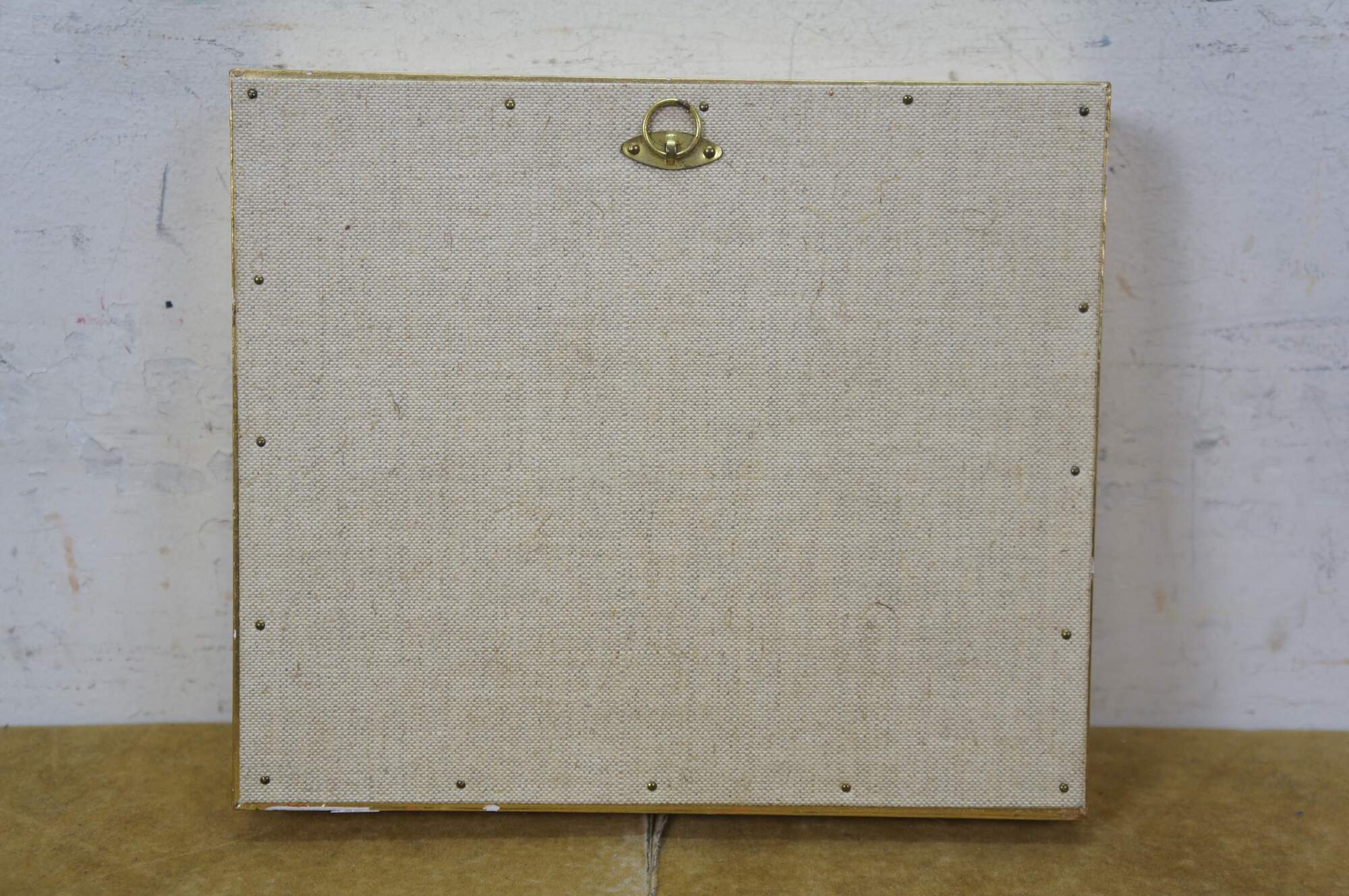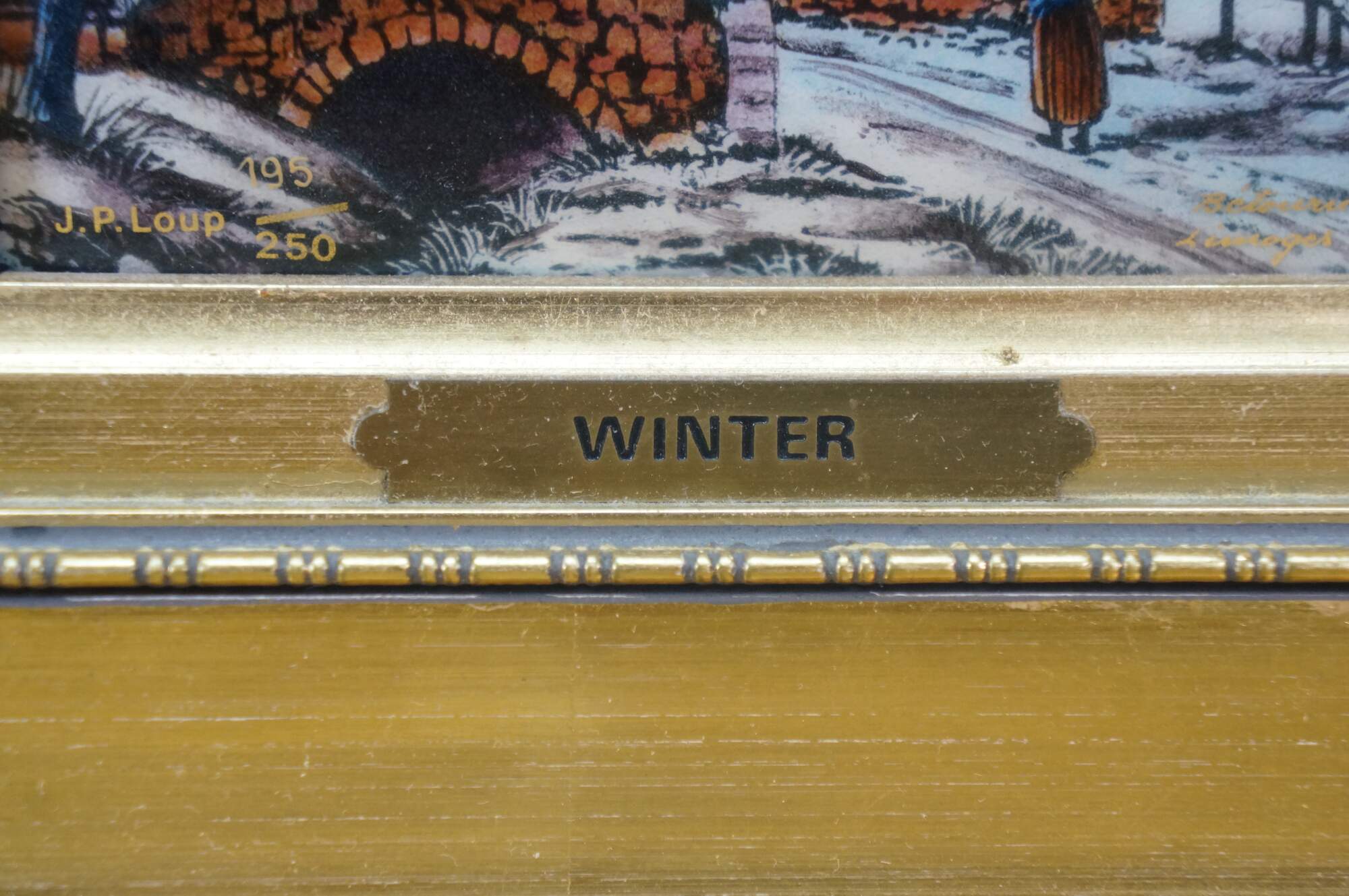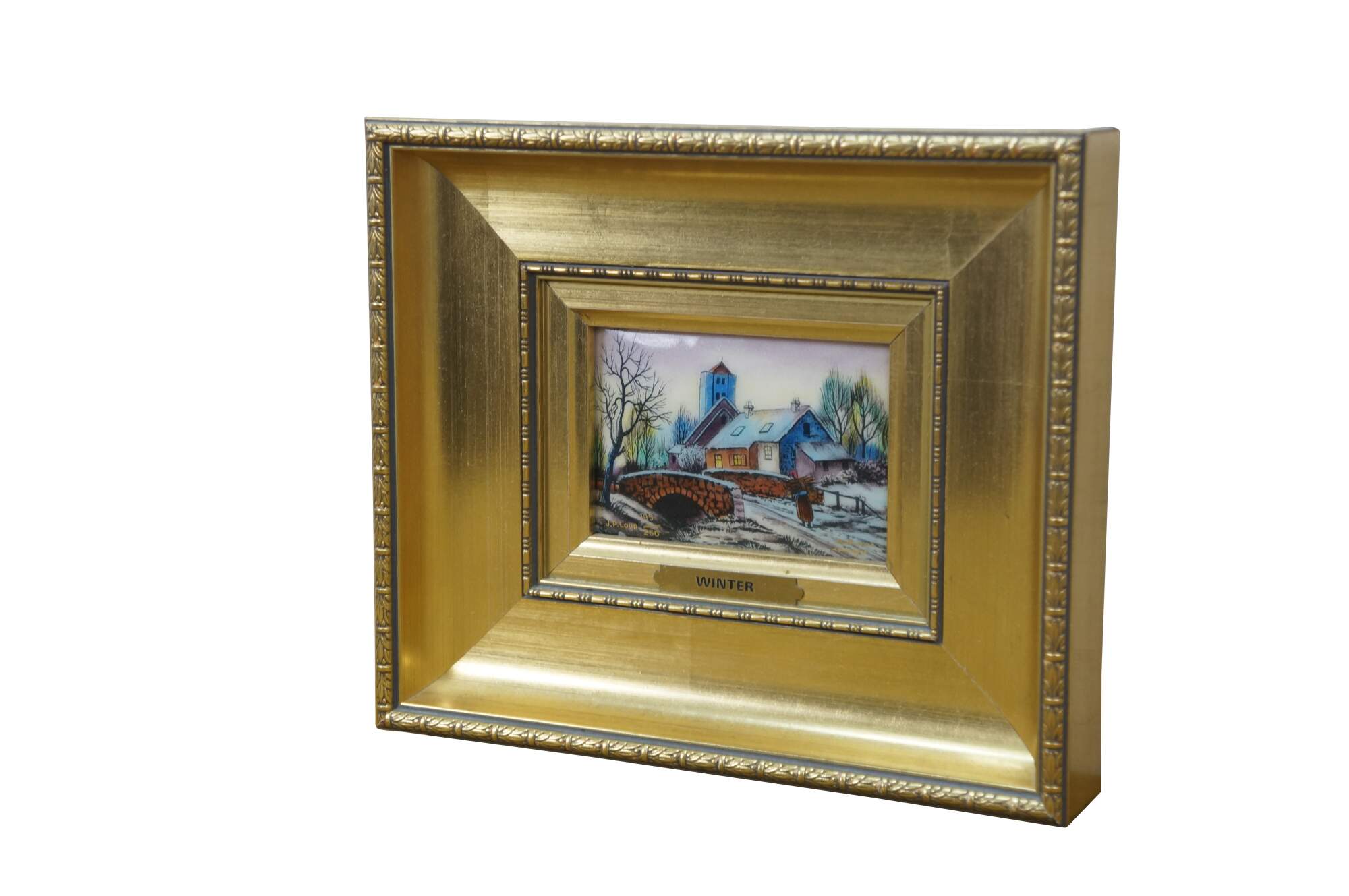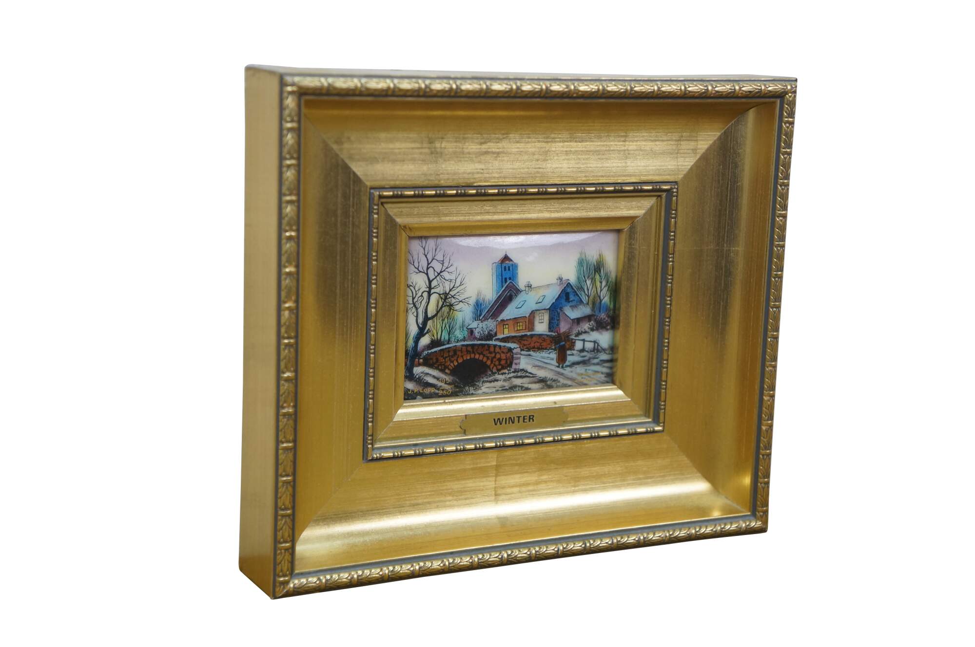 Miniature vintage Jean Betourne enamel on copper art depicting a rural French countryside landscape scene during the winter with a figure carrying firewood across the bridge back home. J.P. Loup 195/250.
